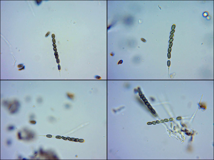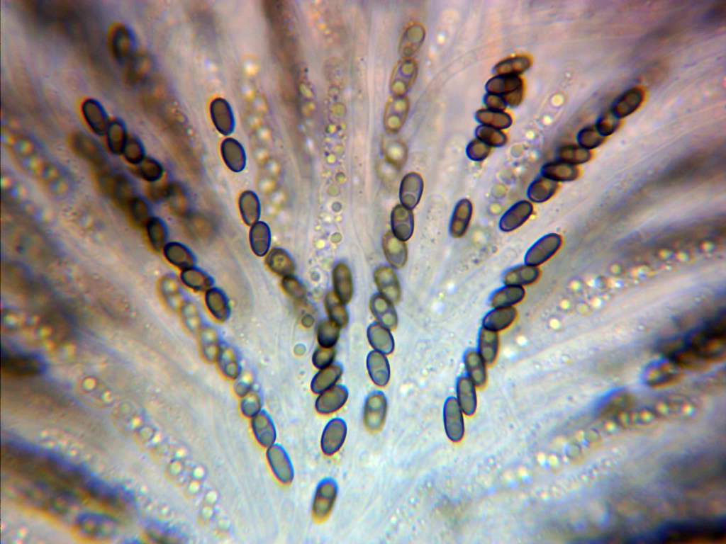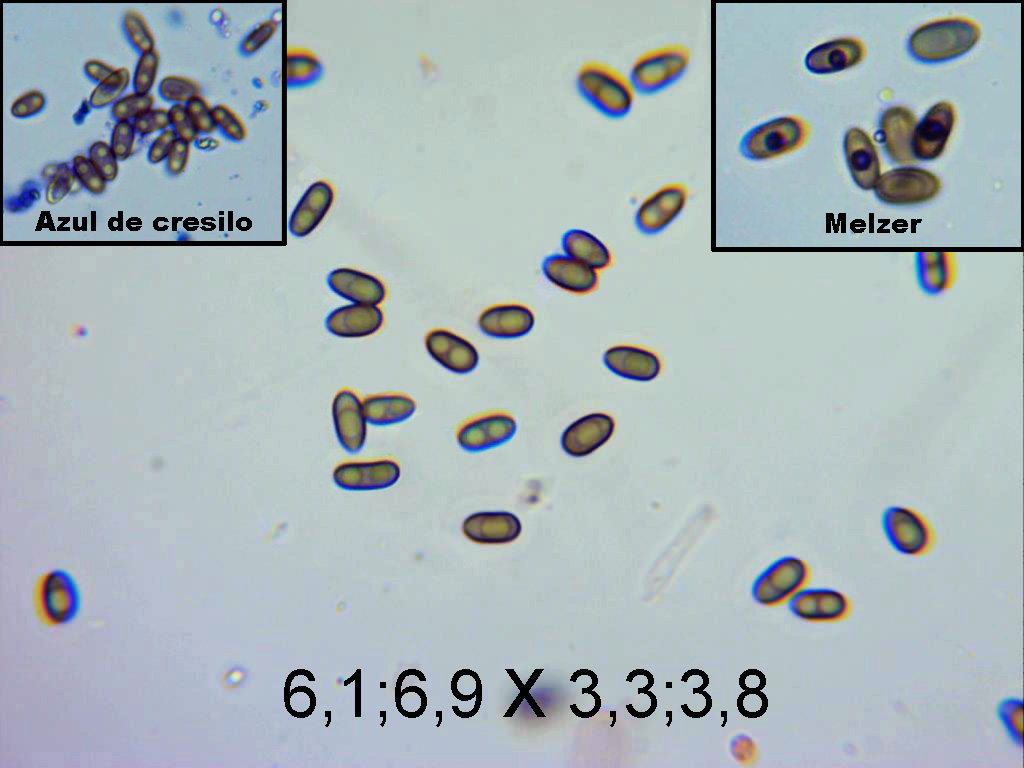 Las esporas ovaladas, de color marrón, con una o dos tenues vacuolas en su interior y con un muy discreto poro en un extremo.