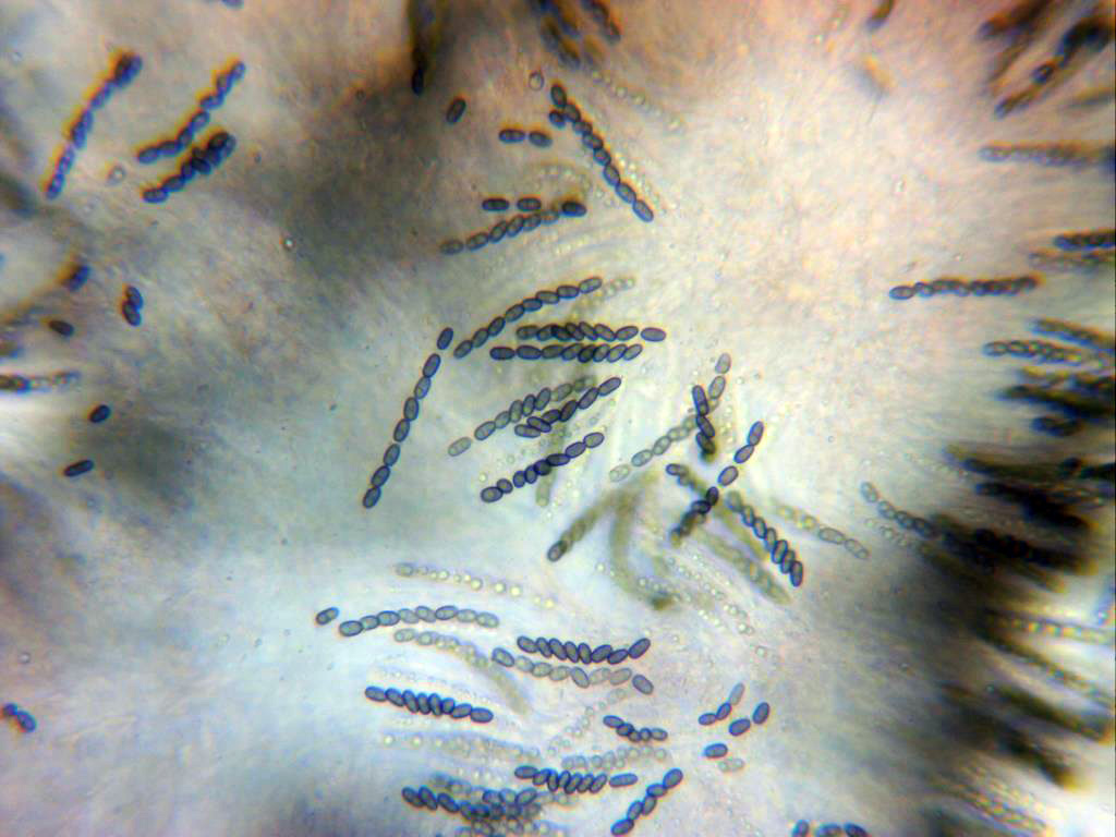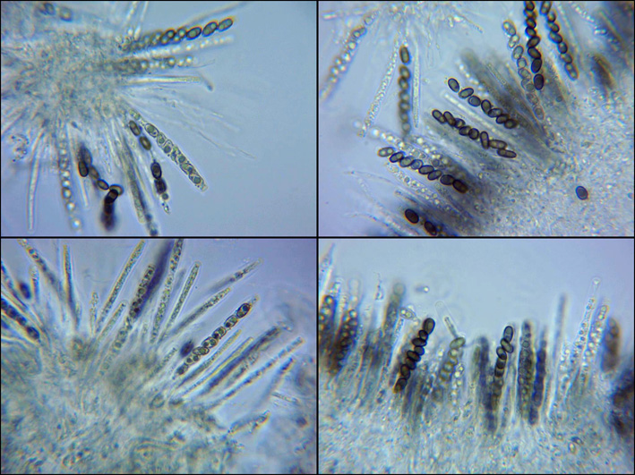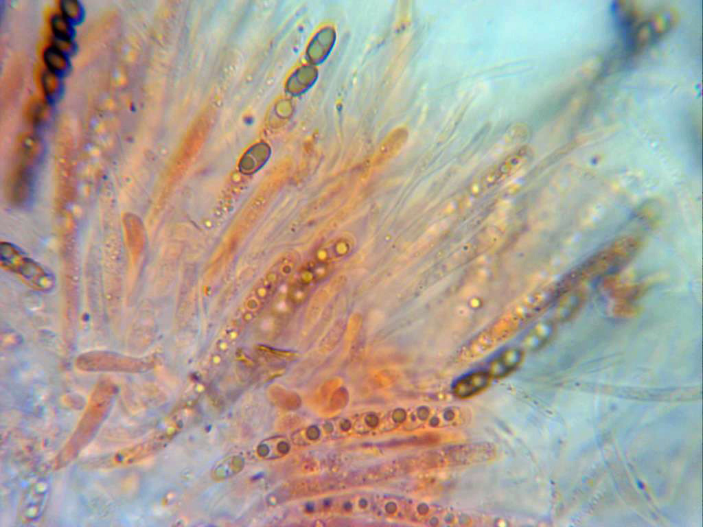 Ascas y parafisos a 1000 aumentos, las medidas de las ascas 38,7;50 X 4,2;4,8 micras, se pueden observar unos paráfisos más delgados que las ascas y que sobresalen claramente sobre la superficie de estas. Las ascas la inmensa mayoría con 8 esporas .
