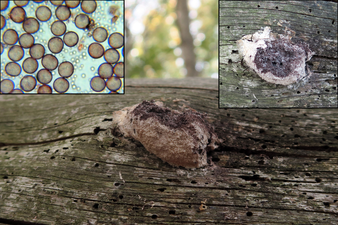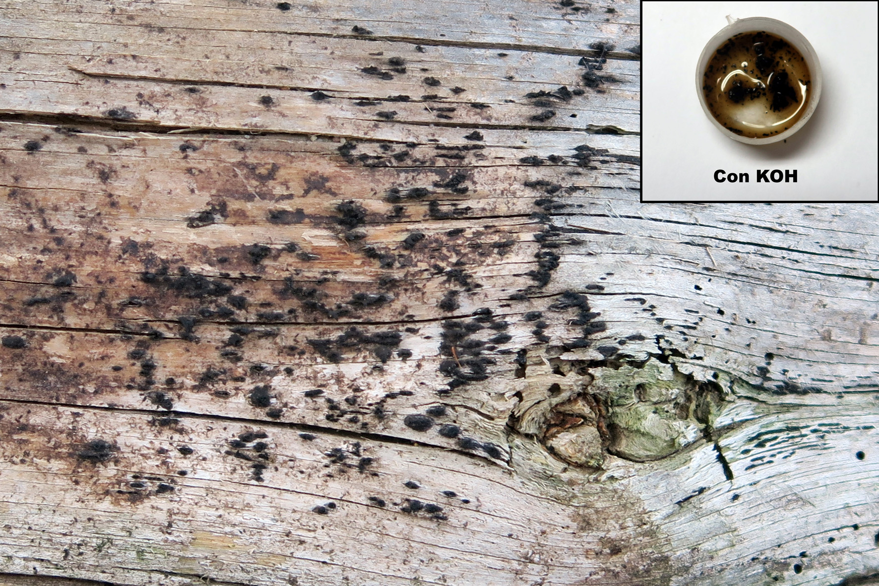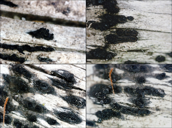 Sobre un tronco caído, estromas de muy pequeño tamaño , apenas unos pocos mms, se presentaban varios ejemplares unidos y en algunos casos en disposición lineal, los estromas fuertemente adheridos al tronco y de aspecto cavernoso en la base, de un color negruzco, con KOH soltaba un pigmento de un color verde claro al principio, para cambiar a verde pardusco a la media hora como se observa en la miniatura.