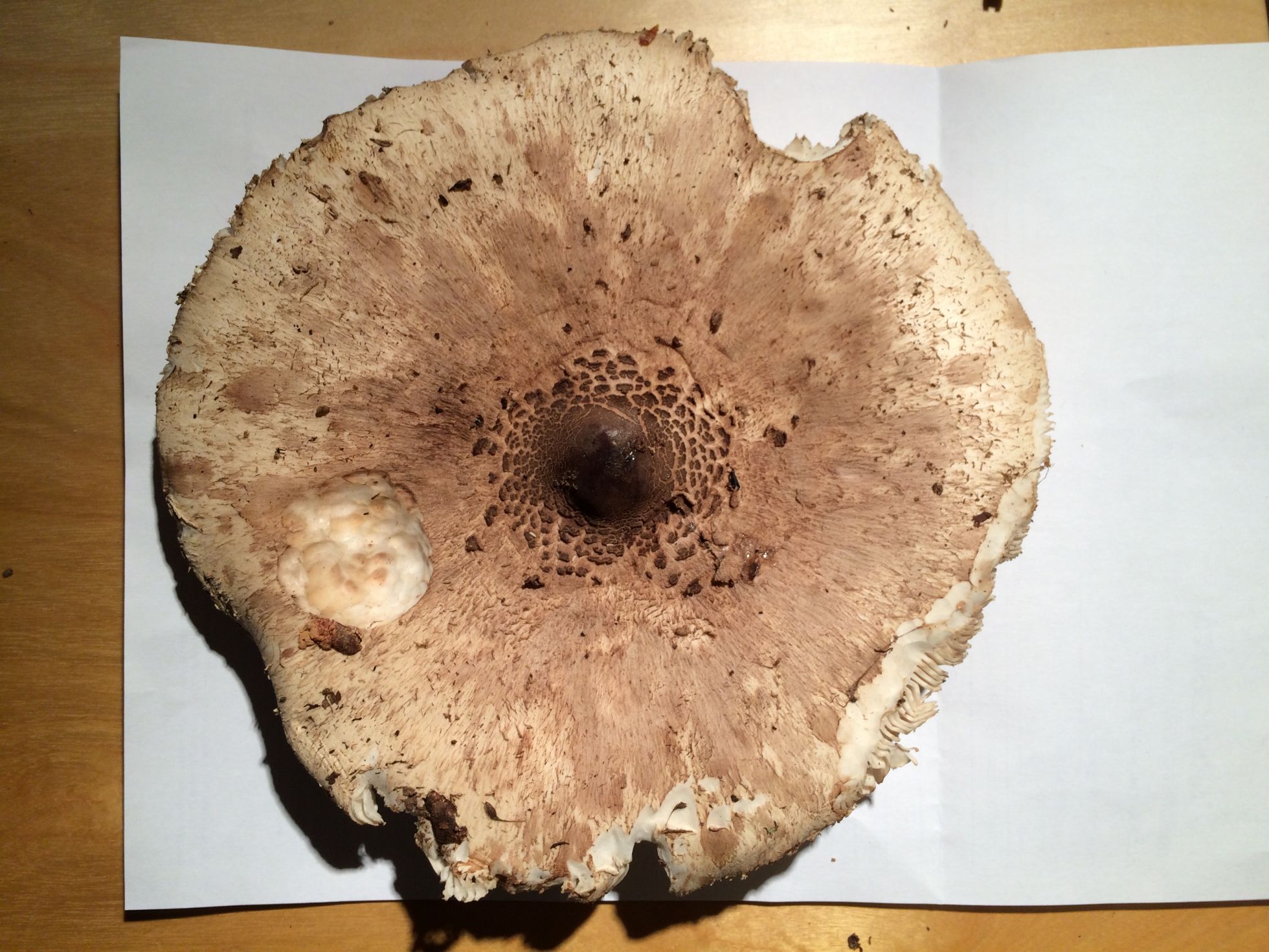 Soy muy segurola en esto… Las dimensiones indicarían que es seguro comerla, pero querría descartar que sea una Macrolepiota venenata. ¿Cómo se diferencian ambas? En los manuales, leo que la Venenata se caracteriza por el dibujo radial y no concéntrico: ¿con lo poco que queda de dibujo os parece segura la identificación?