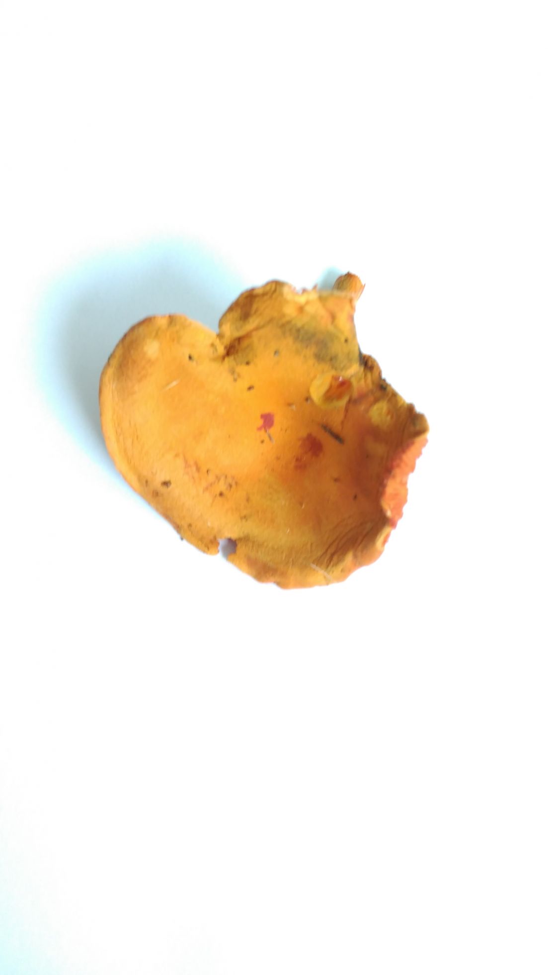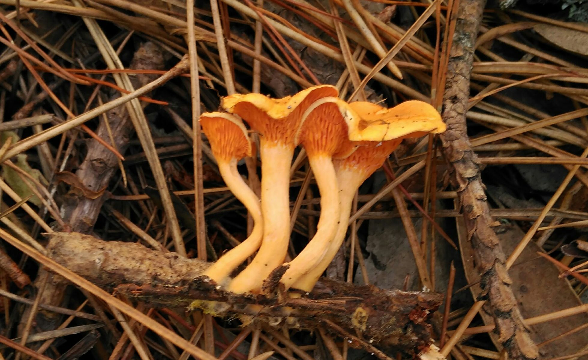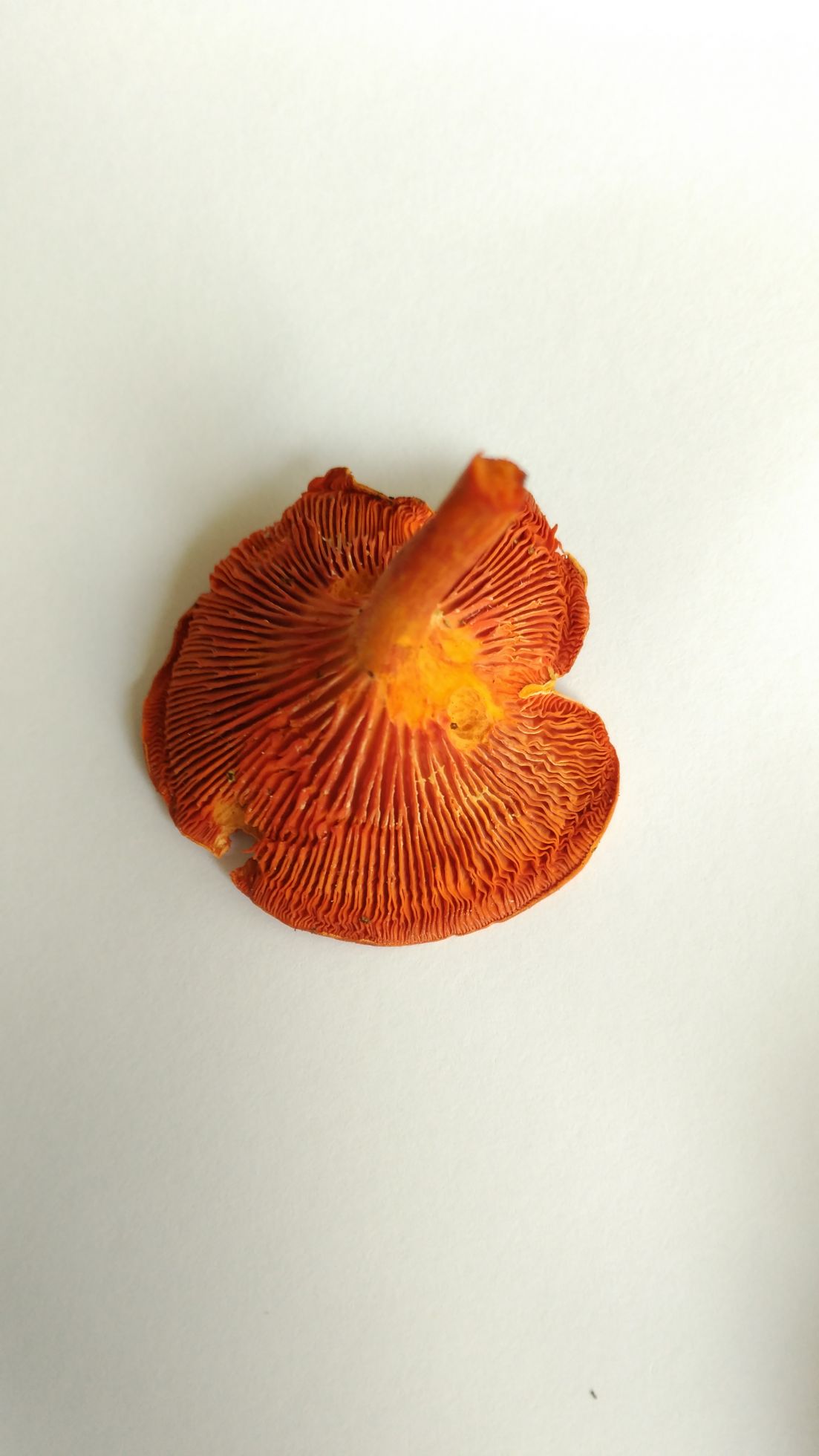 yo creo que se trata de hygrophoropsis aurantica o falso rebozuelo, sombrero de pequeño tamaño embudado y pruinoso de color butano fuerte, un anaranjado tirando a rojizo, el pie es fino y fibroso y tiene laminas concoloro con el sombreo aunque mas fuerte(el sombrero es mas palido) tiene laminas bastante decurrentes.