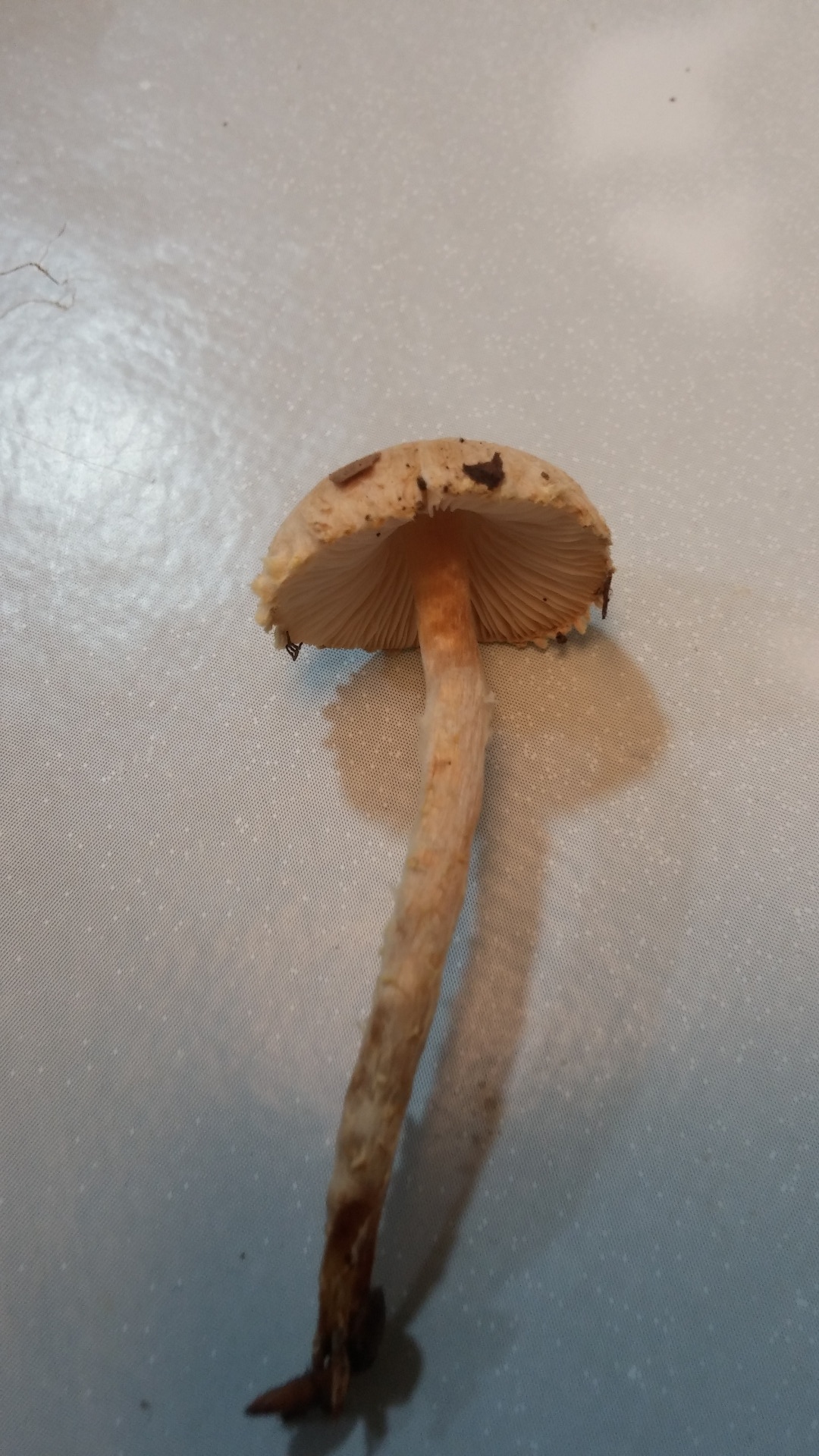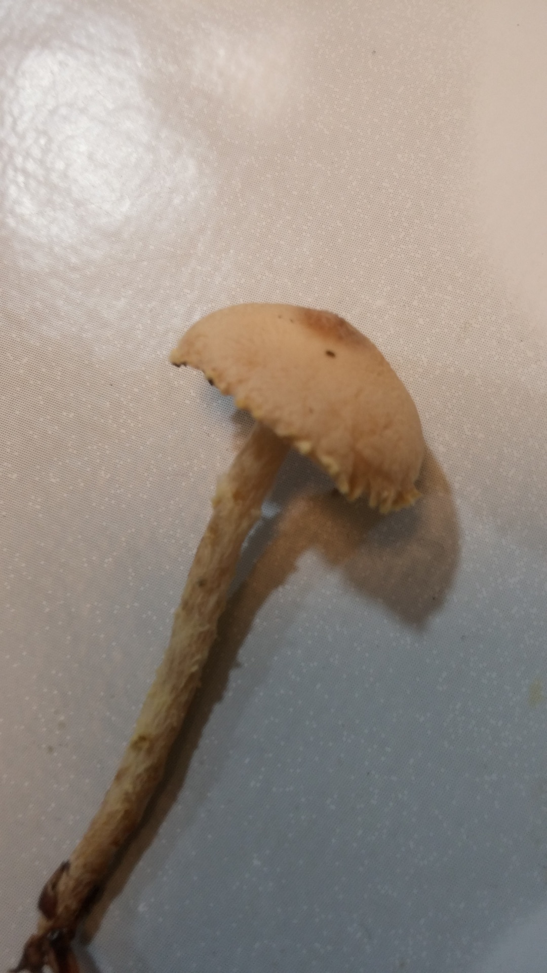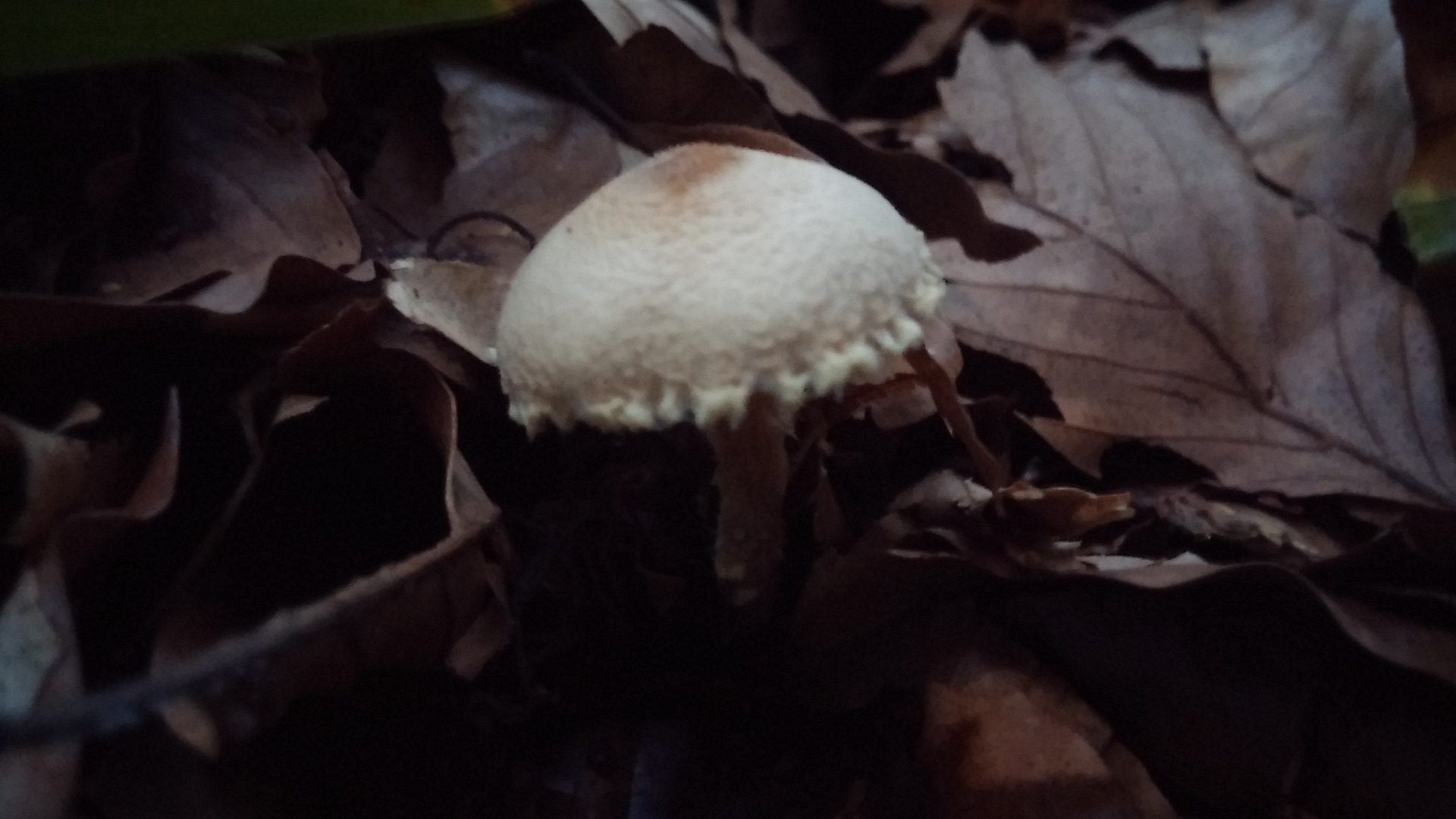 2- Ésta fue a última hora, con poca luz ya. Sombrero de 2-3 cm con flecos en el sombrero. A mi me recuerdó a un cistoderma, pero vamos, cualquier cosa me podía haber venido a la cabeza.