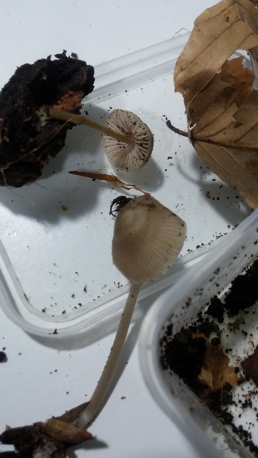 5- Una mycena creo, lignícola. Sombrero de unos 2 cm, se aprecian las líneas radiales típicas. Color claro, le hice otra foto en casa a ver si salía más nítida.