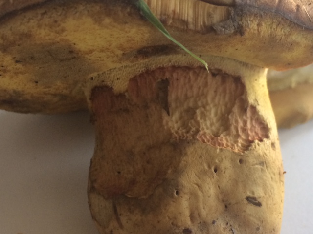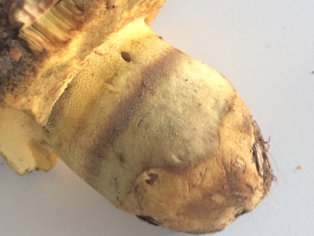 Pie: corto, robusto, amarillo con línea horizontal marrón, retículo breve en zona de inserción con el sombrero (se aprecia en foto 3), se estrecha en la zona inferior. En zonas comidas por limacos, tonalidad levemente rojiza.