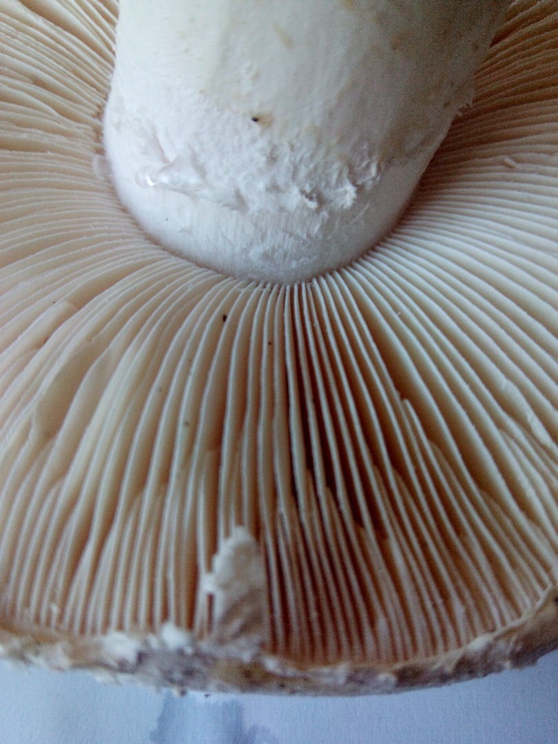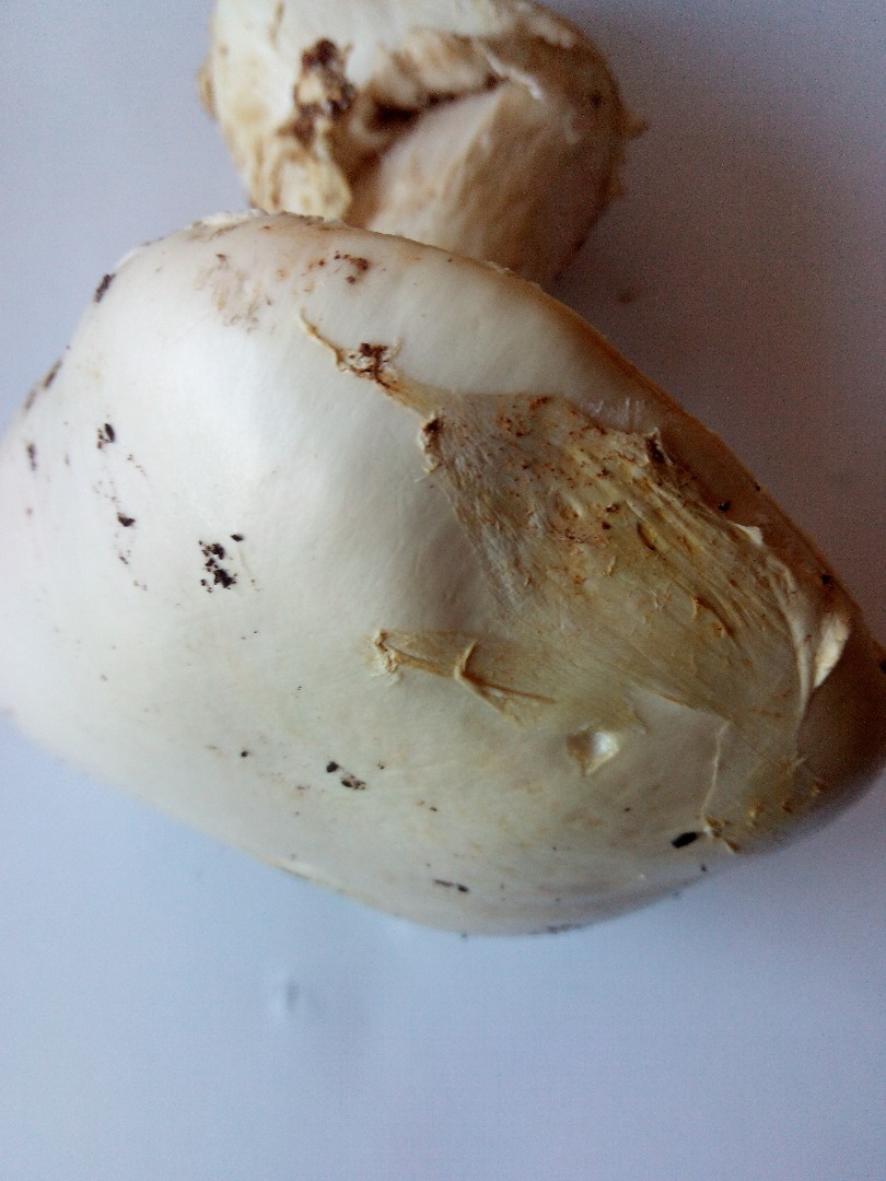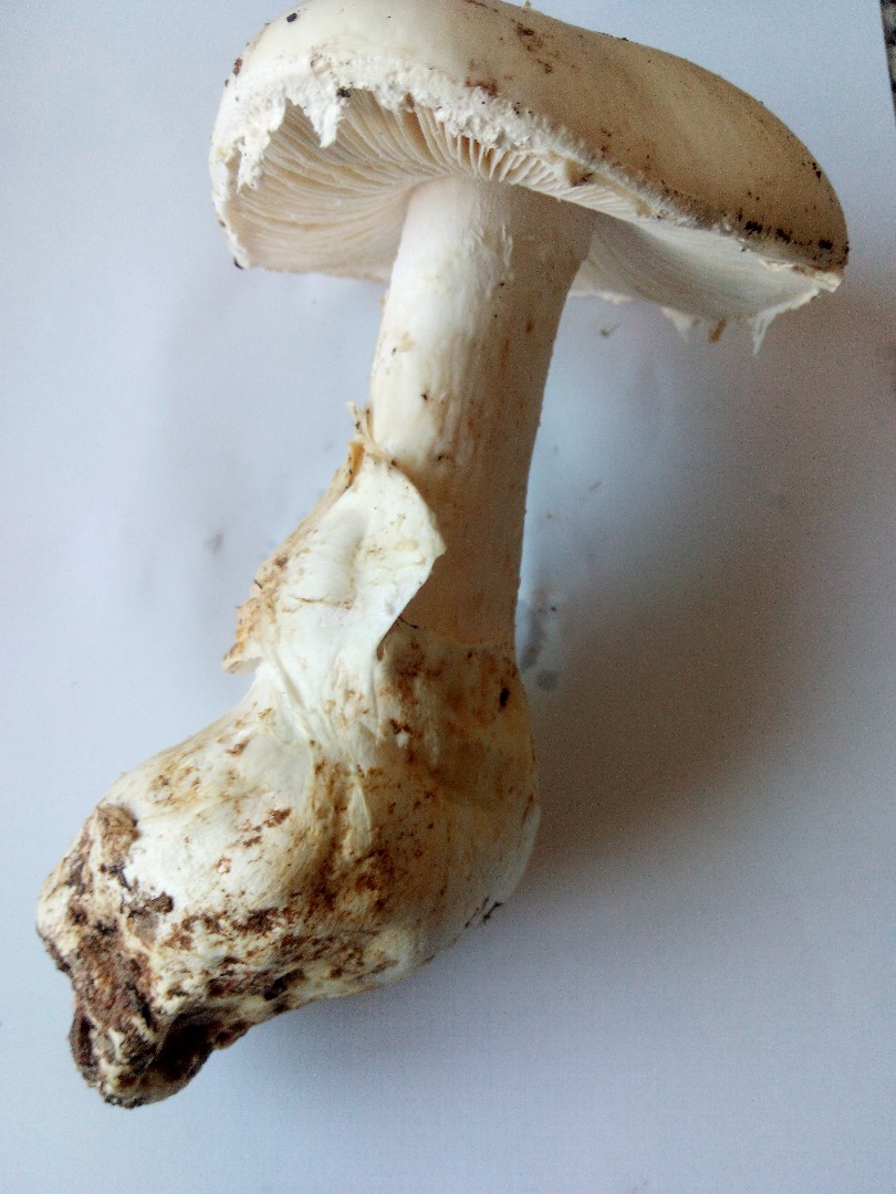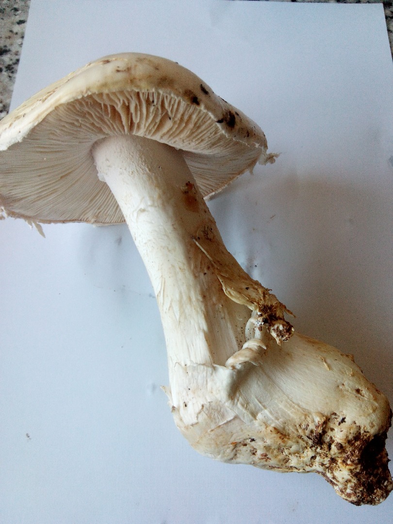 En bosque de pino silvestre, sobre los 880 metros de altura, entre matas de romeros, sombrero de 12 cm. convexo con el borde ligeramente enrollado y restos de la volva, de color blanco niveo con el tiempo vira a color blanco marfil, cuticula lisa, seca y facilmente separable, carne compacta y tersa con olor fungico y sabor praticamente neutro, laminas apretadas anchas y ligeramente escotadas, de color concoloras con el sombrero. Pie cilindrico mas ancho en la union con la volva escamado en la base y fibroso sin anillo.