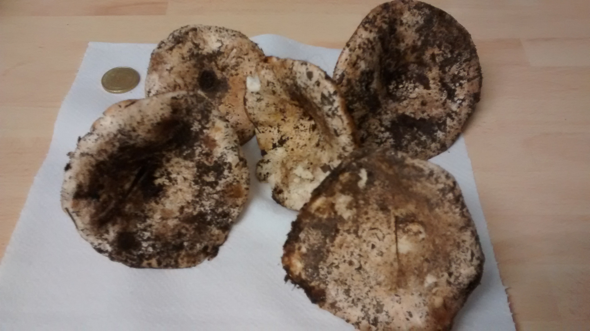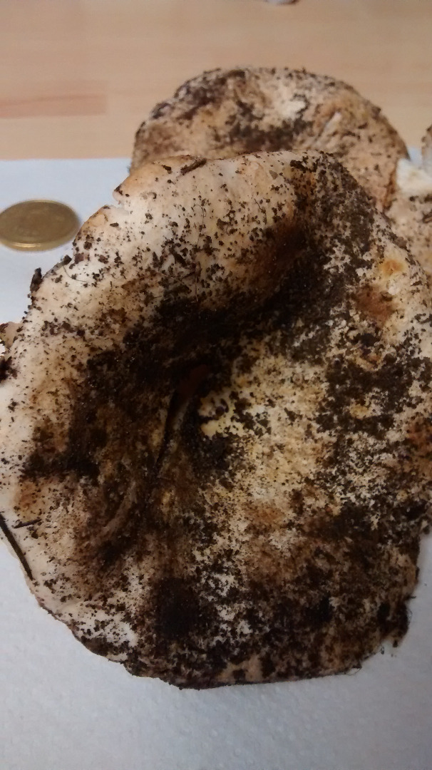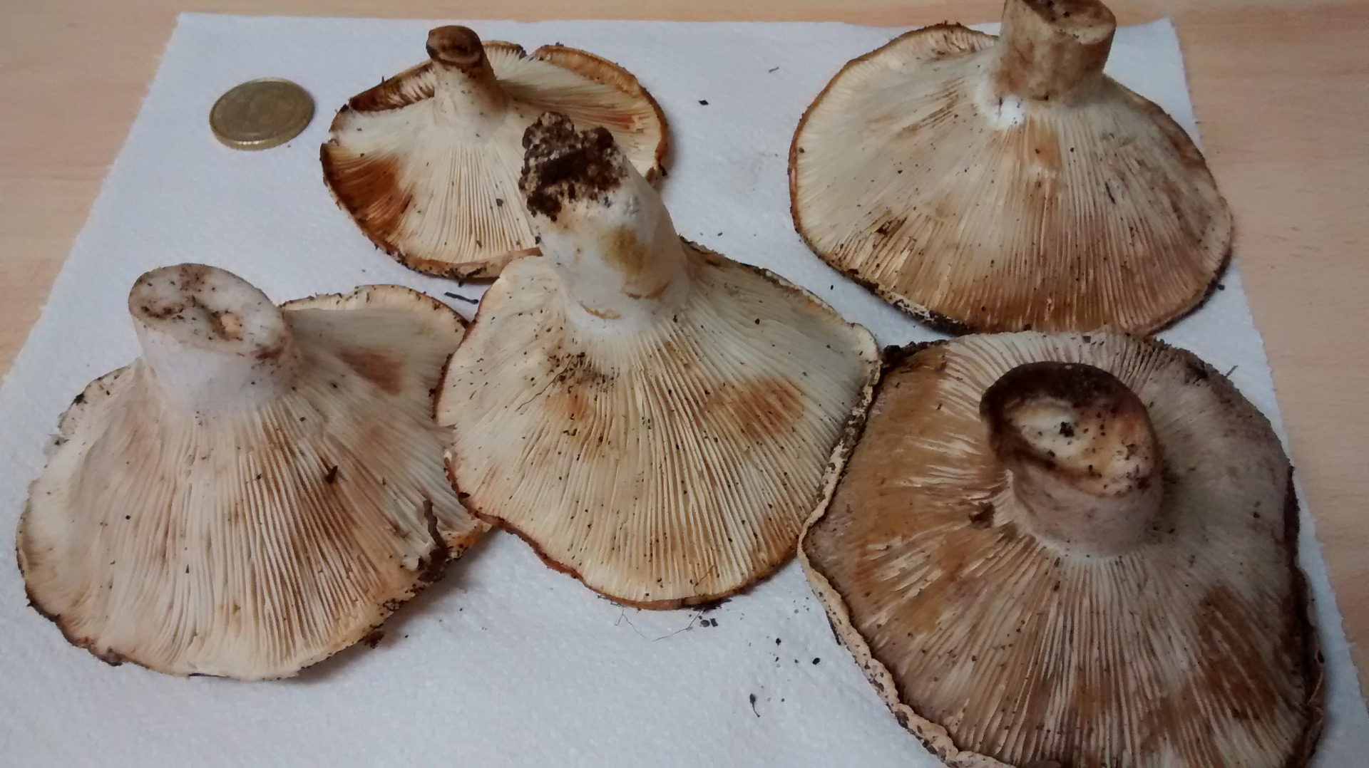 Hola, Clitocyces no creo que sean, con esas láminas que han adoptado ese color ocre al haber sido manipuladas, siempre nos cabera la duda entre Lactarius vellereus, Lactarius piperatus o Russula delica.