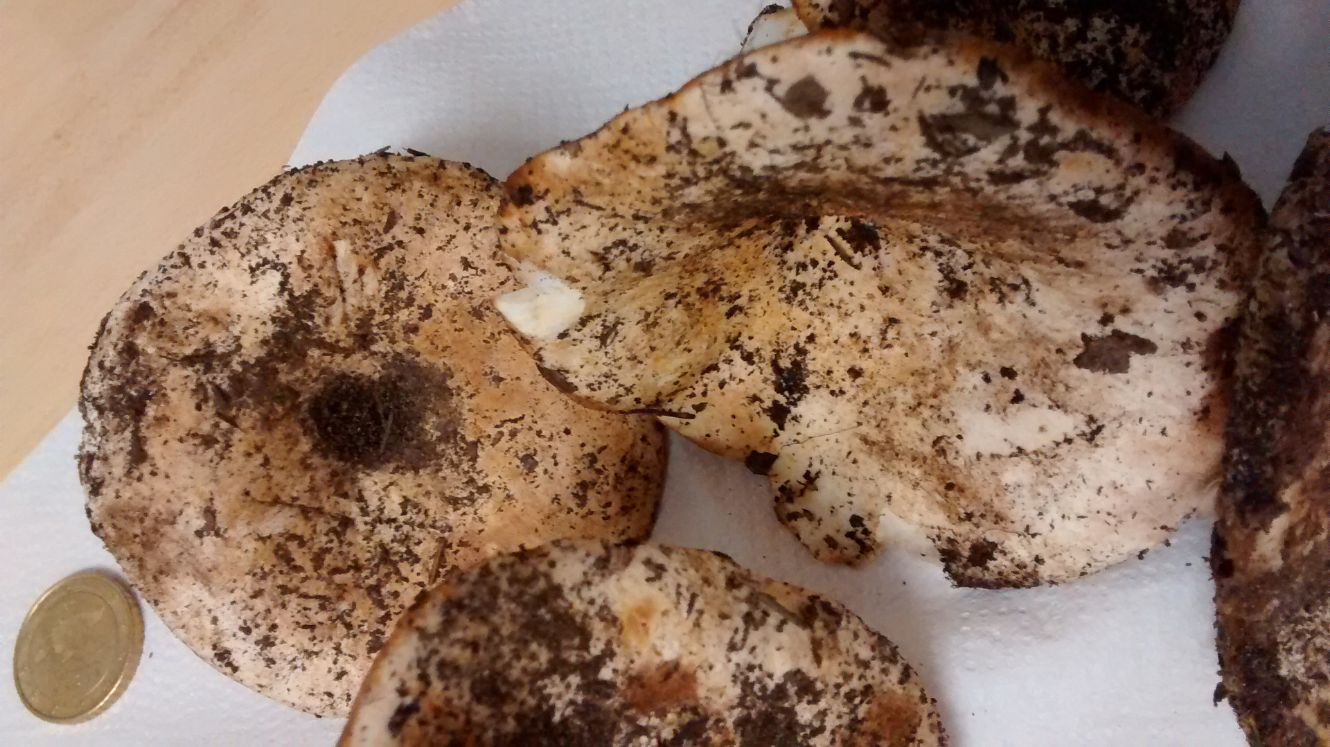 Estoy de acuerdo con Javier, por el aspecto sucio que presenta, me inclinaría por Russula delica (aunque deberíamos asegurarnos) en este caso no debe rezumar látex , la Russula delica es muy común por mi zona y a pesar de que se considera un comestible mediocre, es tradición el consumirlas, yo mismo las he consumido a la brasa y no saben tan mal, la carne es un poco picante en crudo pero desaparece con la cocción.