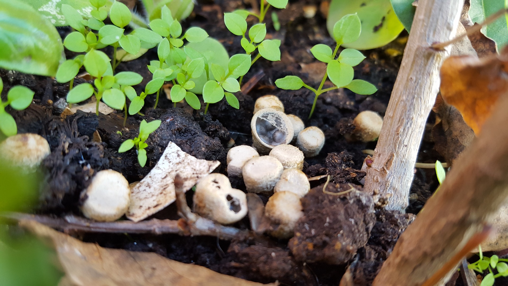 Puede tratarse de Cyathus stercoreus y Volvopluteus gloiocephalus, saludos.