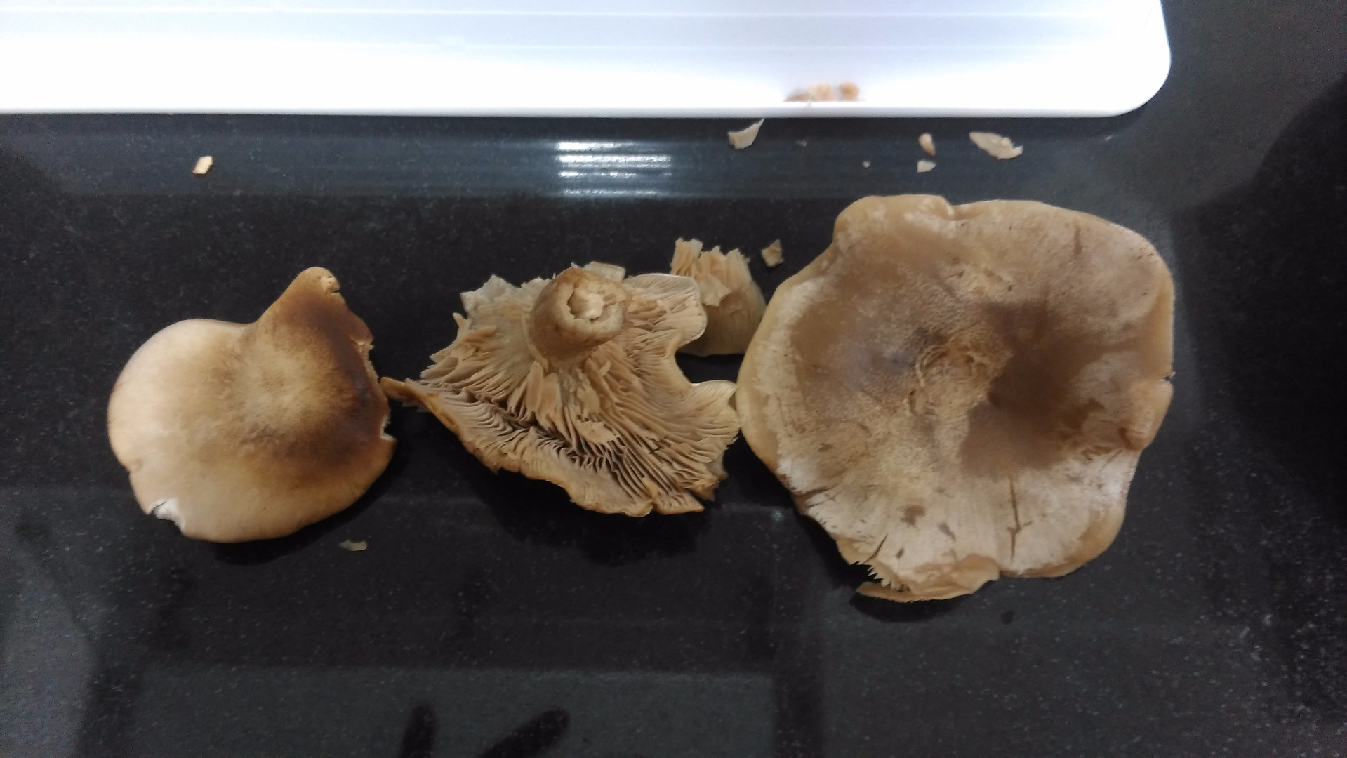 No se si es por el flash o que pero las setas cogen el color de la mesa, no podemos saber cuales son sin ver su verdadero color, cualquiera de las dos opciones, Lepista o Melanoleuca podrían ser buenas, eryngii no son.