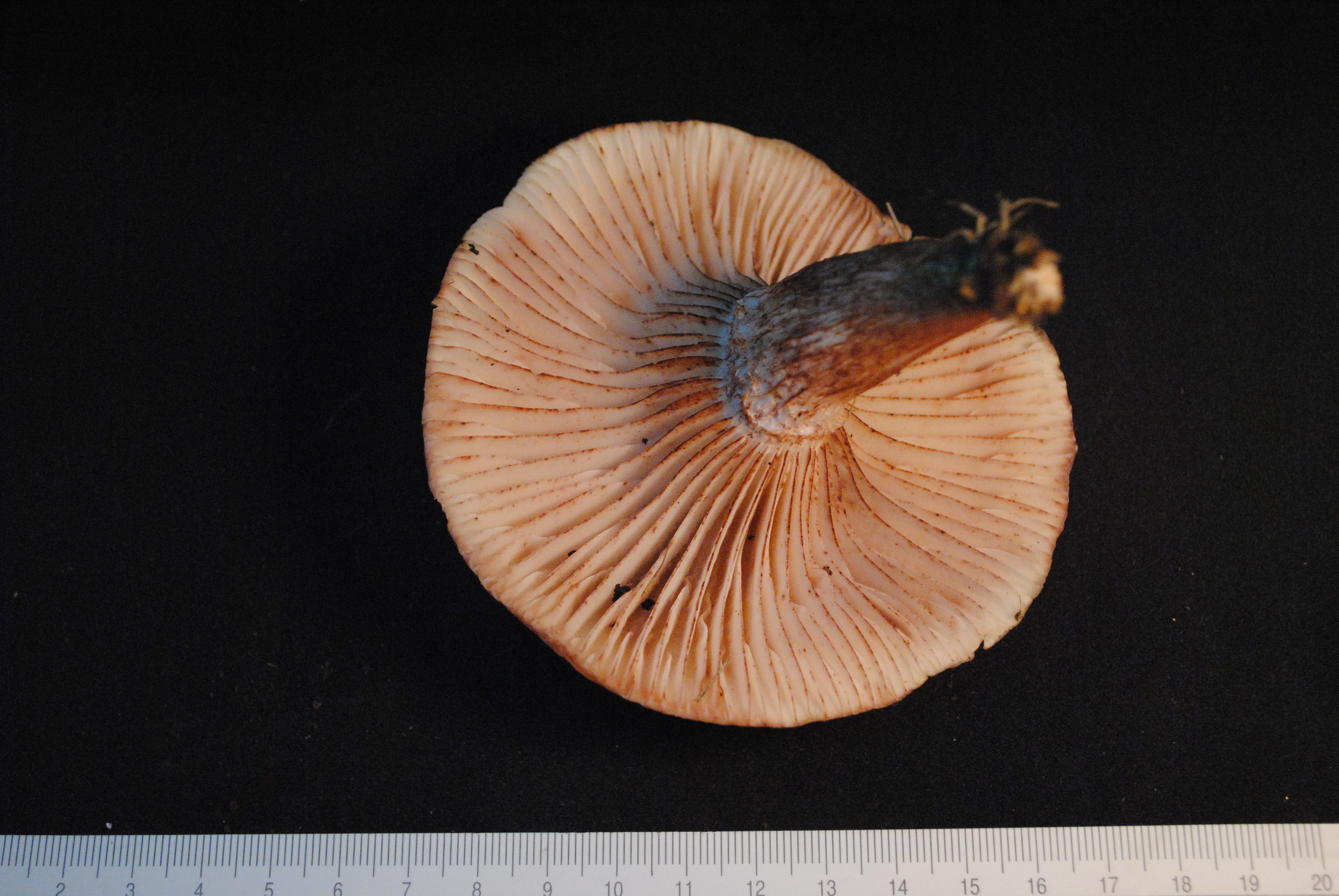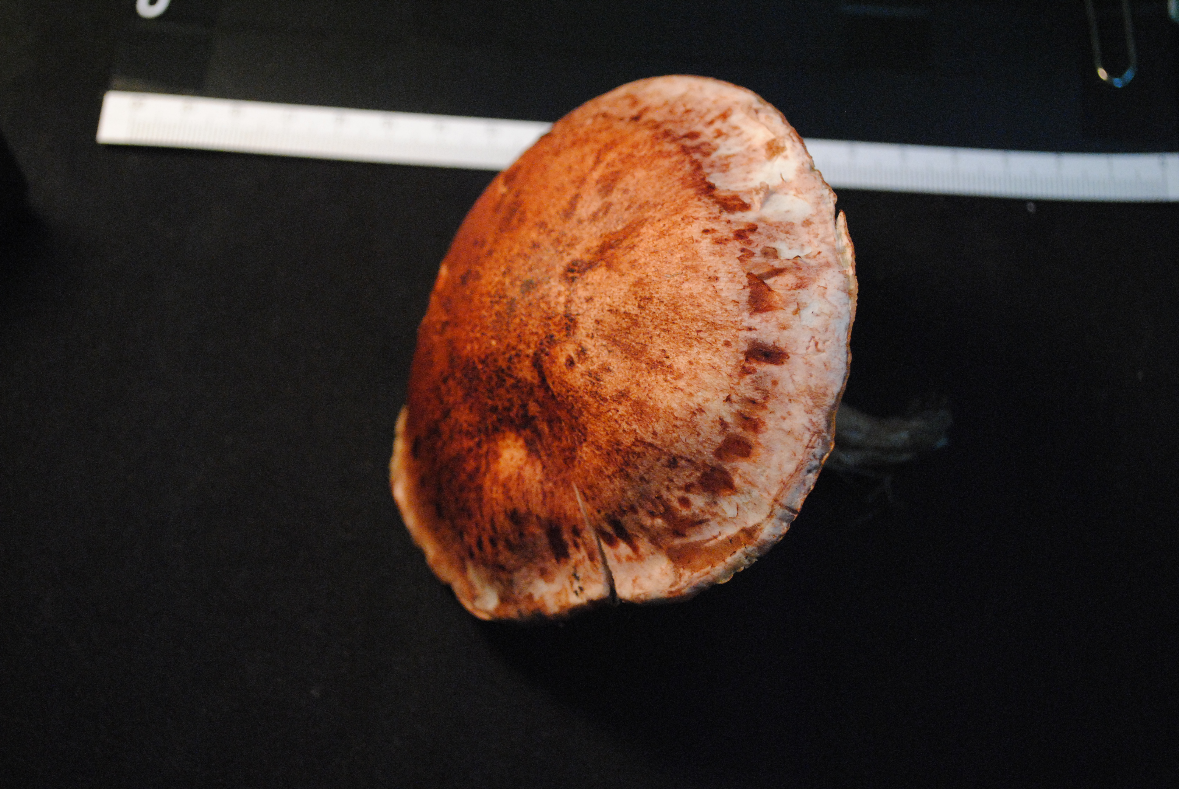 Me parece que es una Tricholoma y por la decoración de la cuticula y el colorido del pie diria que es del grupo de la Tricholoma albobrunneum
