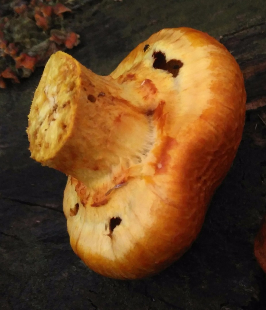 de color naranja -ocre, globoide primero y aplanado despues, con diminutas escamas, tamaño del sombreo 12 ctm, color de la carne amarillo