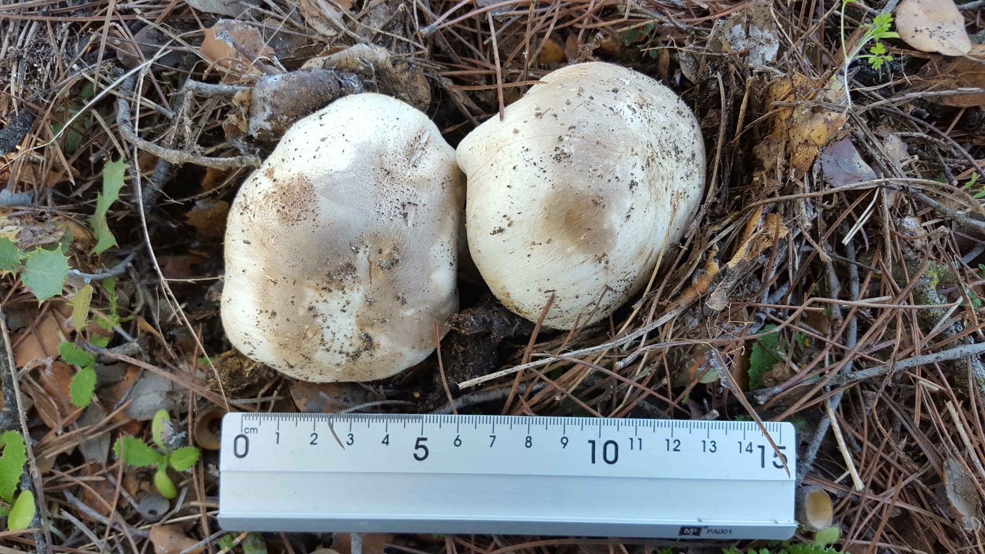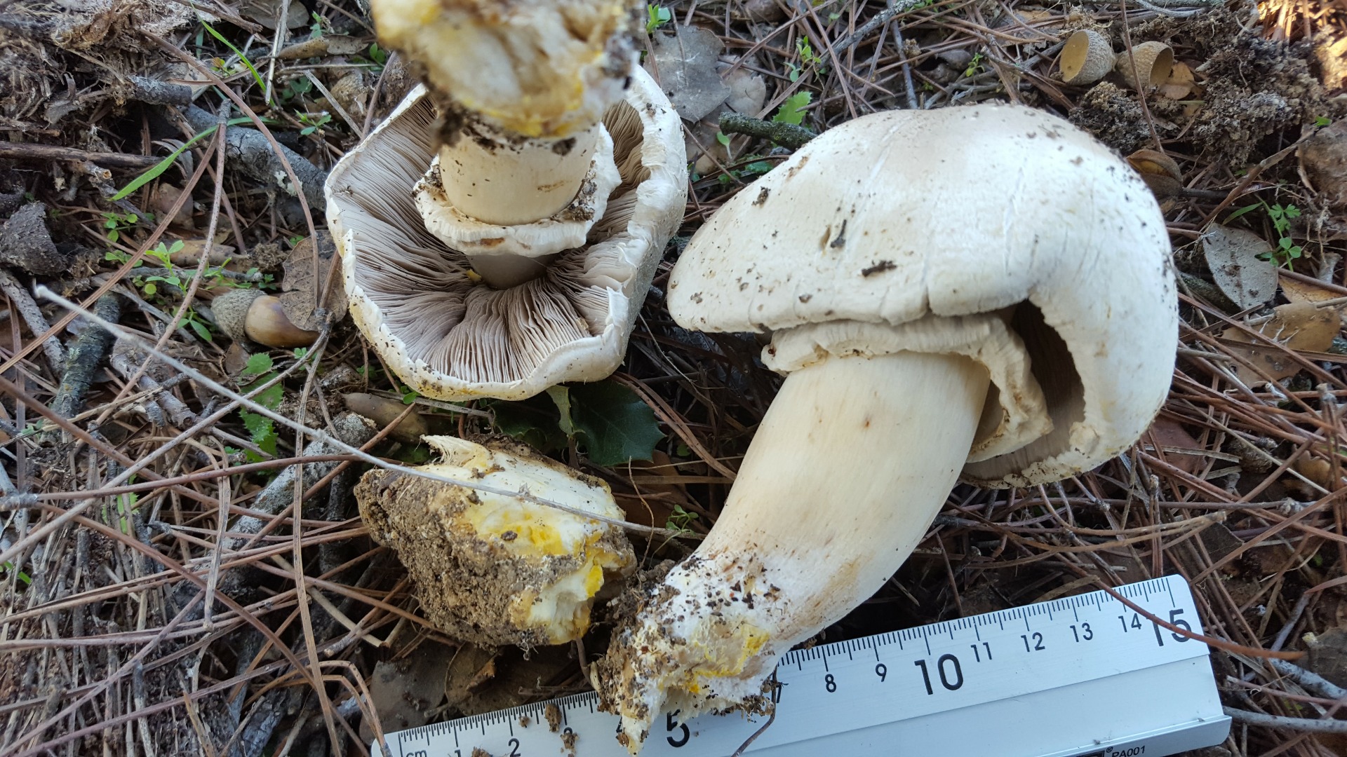 1) Creo que es Agaricus xanthodermus. Estaban entre las acículas de un pino, gran porte y consistencia, olor inapreciable hasta que las froté y salio el color amarillo y olor intenso a iodo. Láminas grises. Lo que me mosquea es el hábitat, yo siempre las había visto en jardines entre el césped, y en prados.