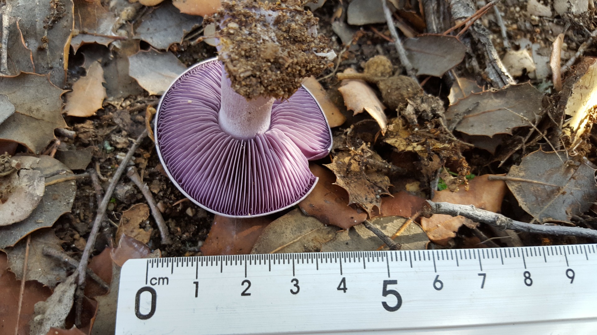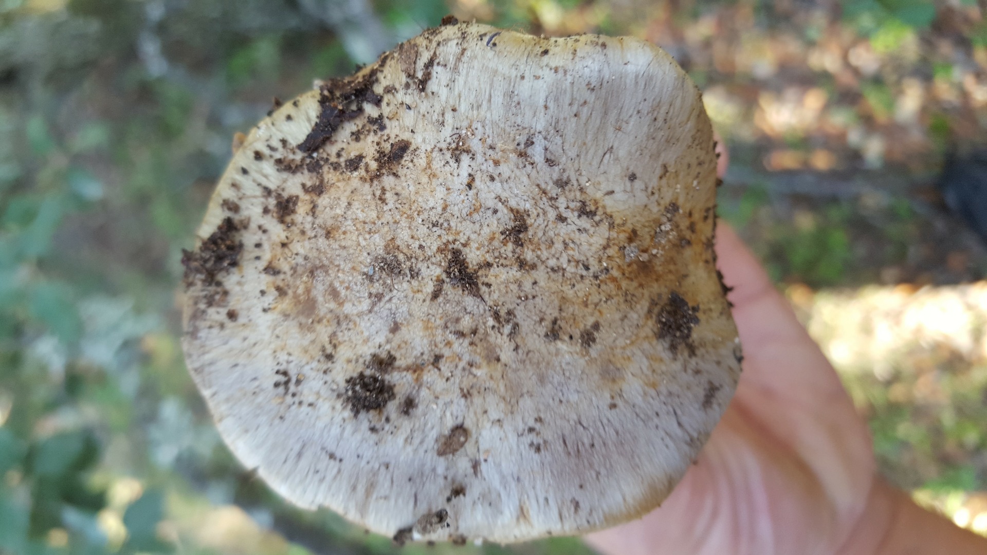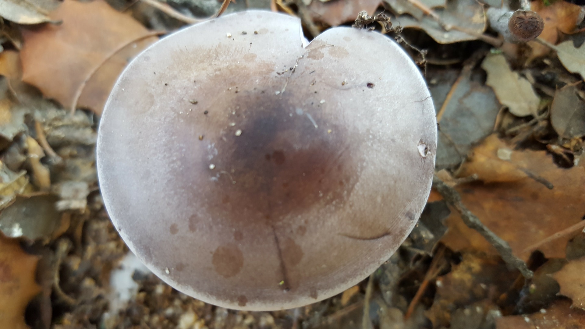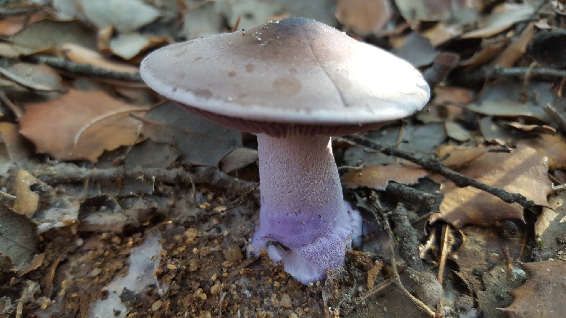 2) Esta puede se Lepista sordida aunque me mosquea el color del sombrero. Tiene olor suave agradable, el micelio de color lila brota directamente de la arena del suelo...