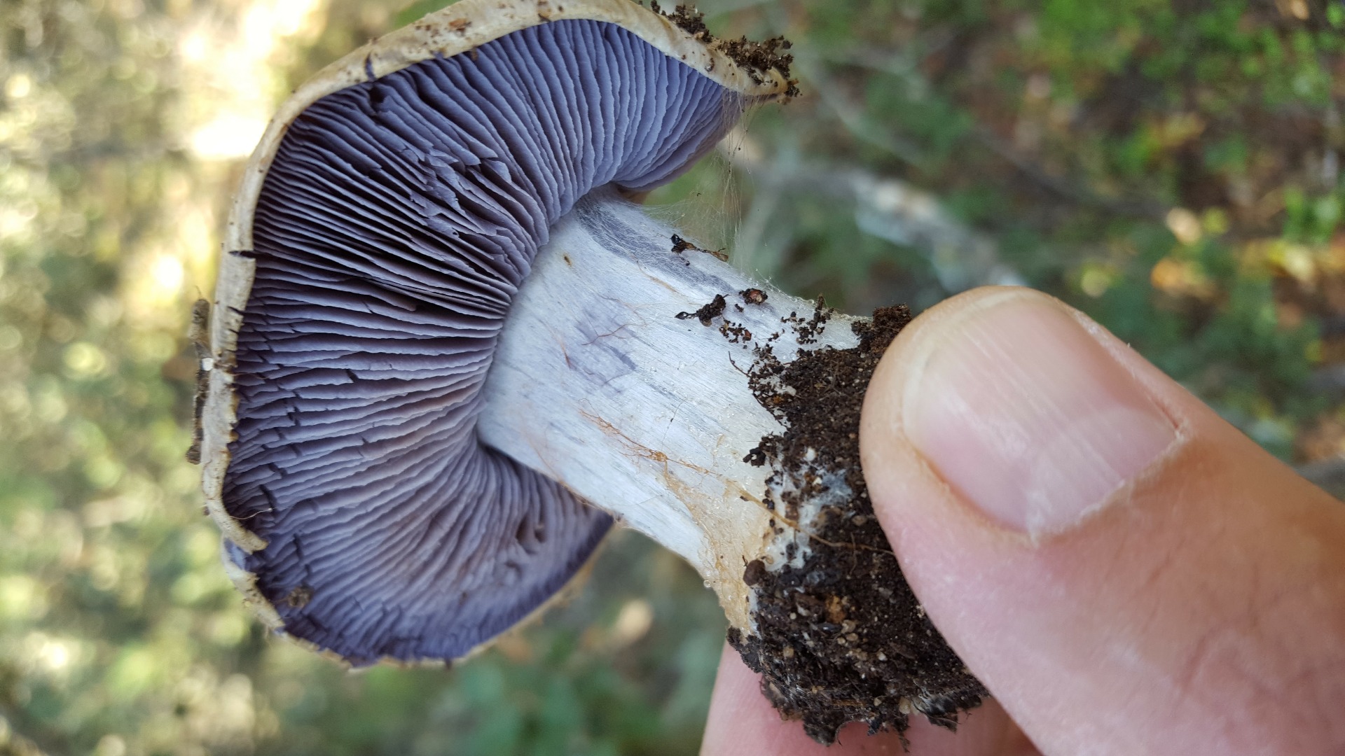 3) Este creo que es un Cortinarius, con las láminas azules y las cortinillas/hilos de color rojizo. Olor fúngico agradable.