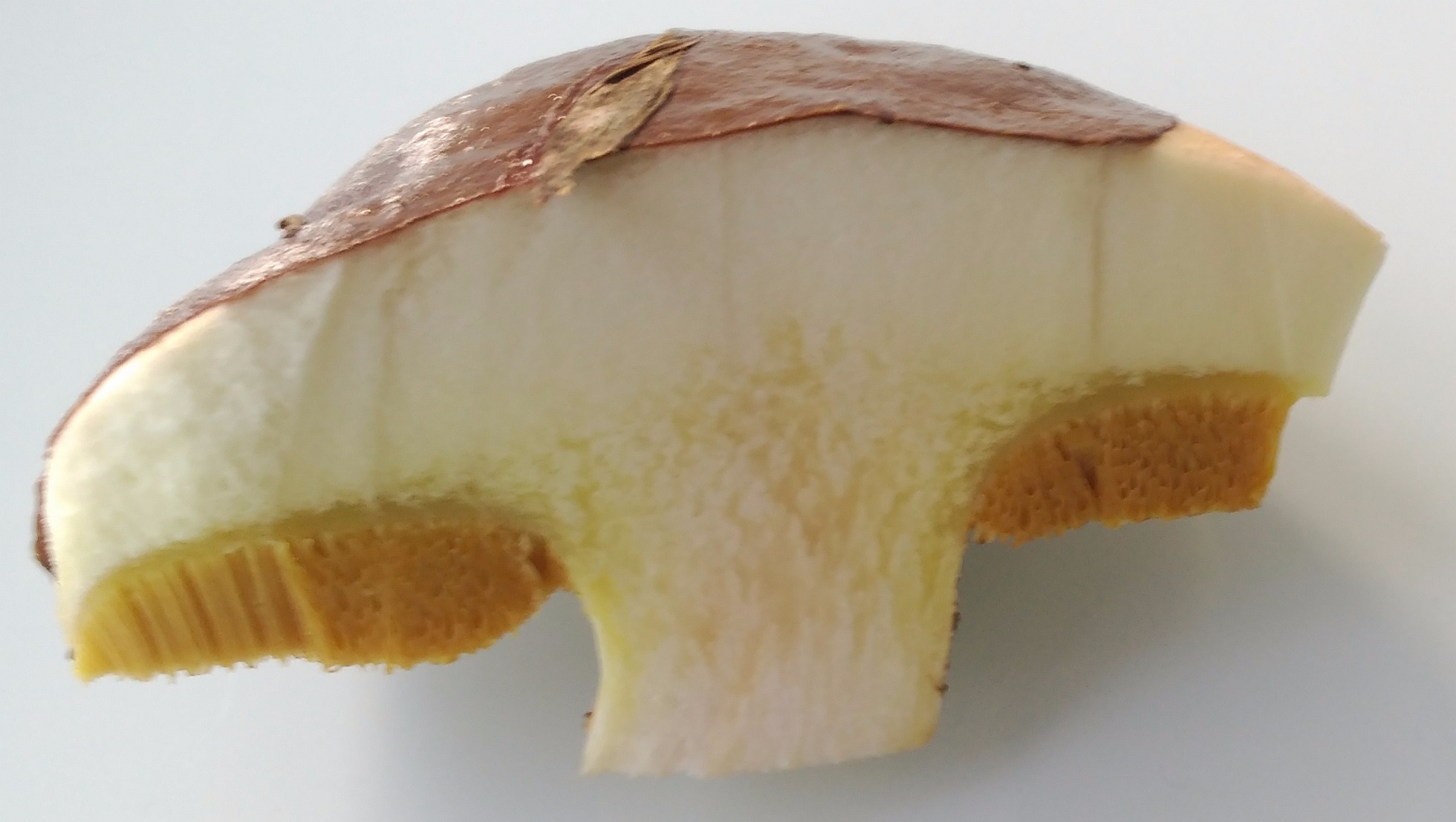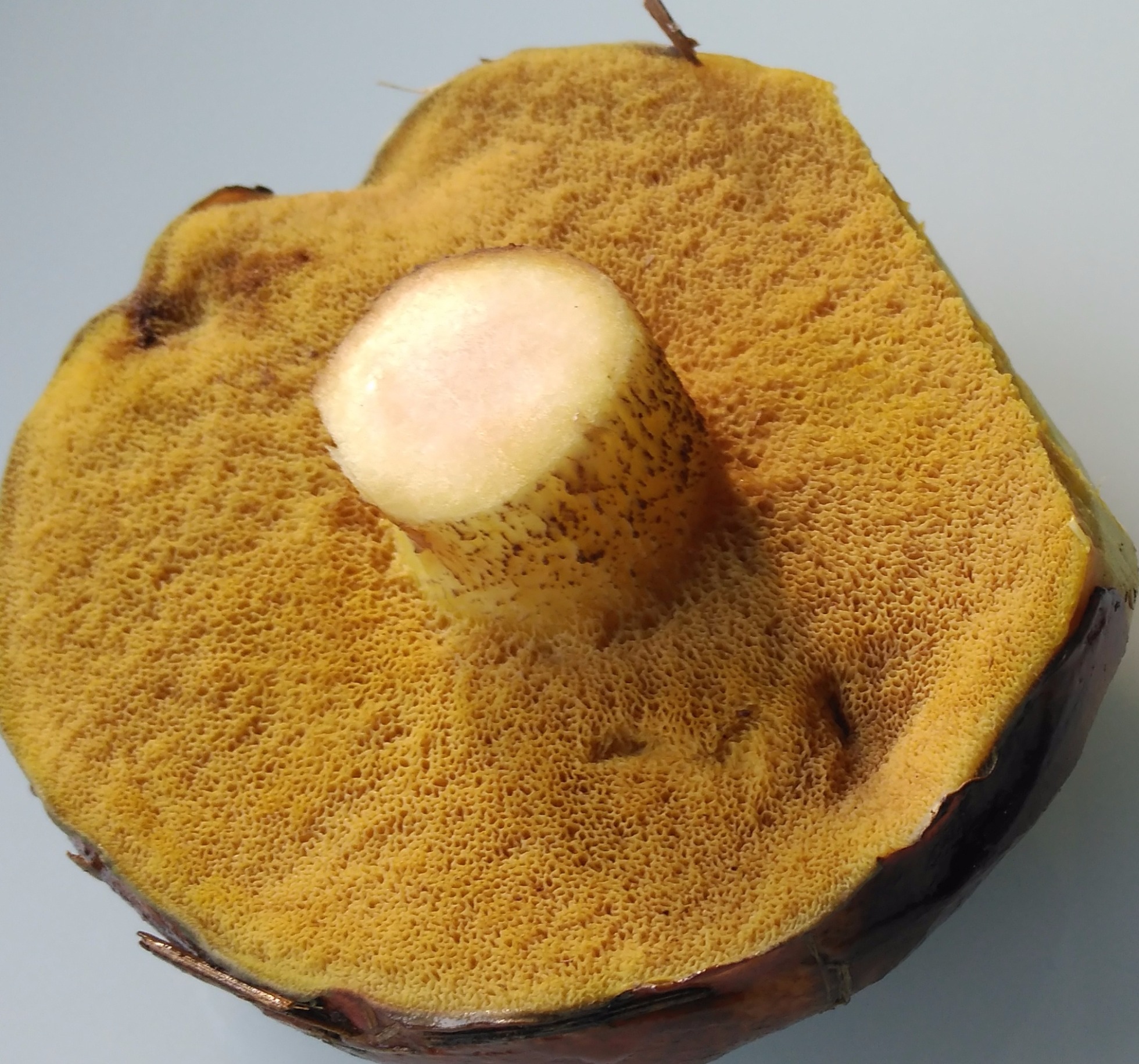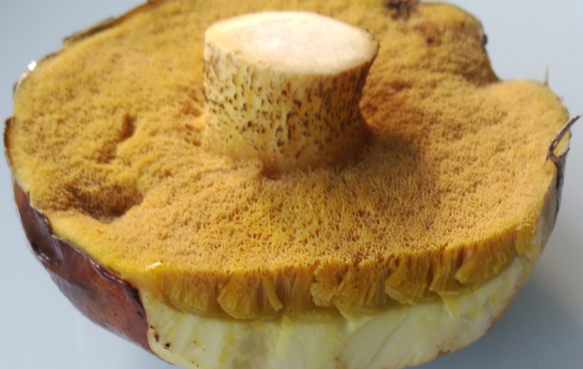 tubos, adnatos y levemente decurrentes y aquí mi primera duda: el suillus luteus he leido que tiene tubos largos, ami no me lo parecen en esta. fácil separables de color amarillento y poros del mismo color redondo-angulosos.