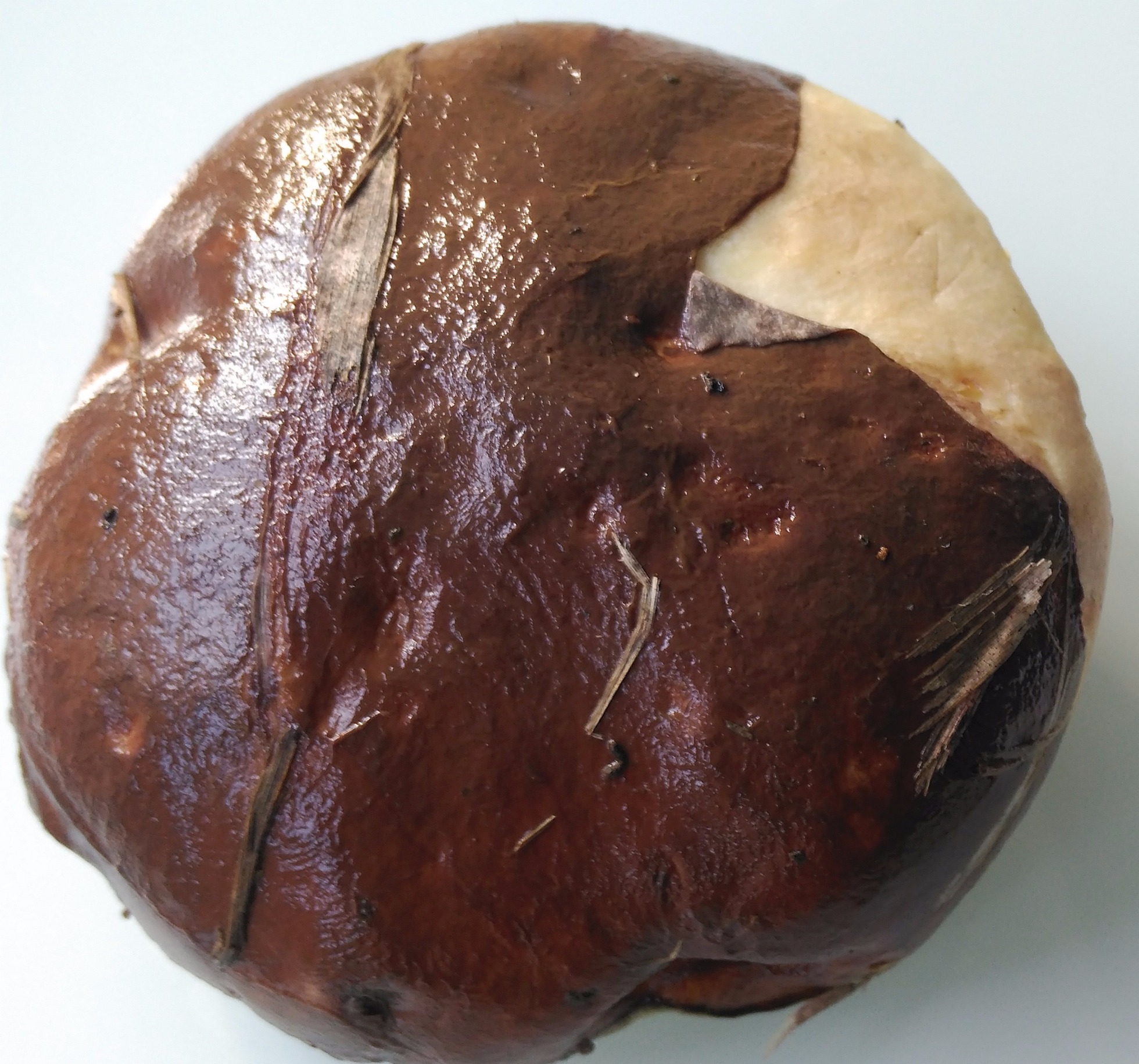 sombrero mucilaginoso, color marrón, cutícula fácil separable con margen liso y excedente.