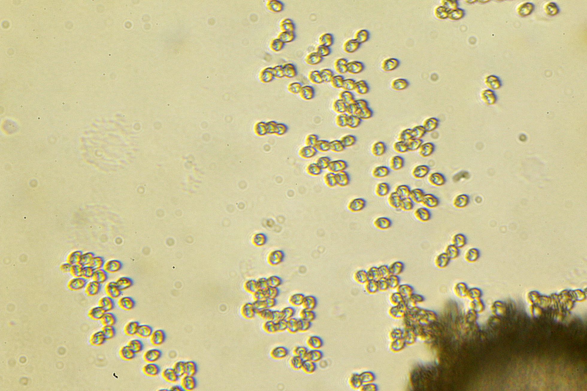 Le tomé fotos con mi "grimoscopio" a las esporas y obtuve las imágenes que te muestro a continuación, a 400x y a 1000x. Las realcé un poquito con enfoque gaussiano porque si algo me hace querer acabar con mi vida es esa porquería de microscopio y la calidad de sus imágenes.