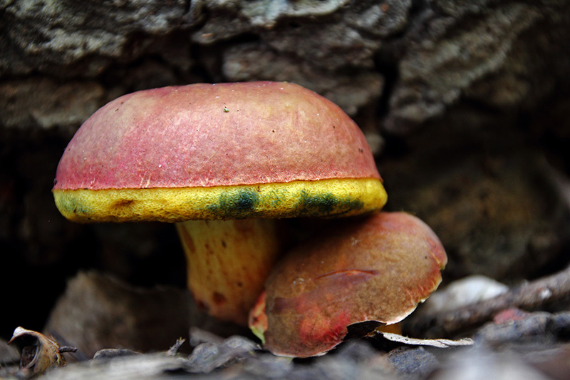 El 3º no lo tengo nada claro, pues imagino que es excesivamente suerte haber topado con un Butyriboletus regius, en un claro de una chopera, fotografiado contra una piedra. Las manchitas azules fueron provocadas por el contacto, pero no azuleaba al corte, cosa que me hace suponer la difucultad para clasificarlo como b. regius. Más bien pequeño para un boletus.