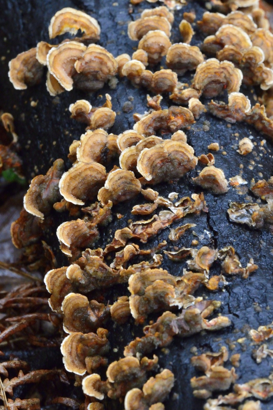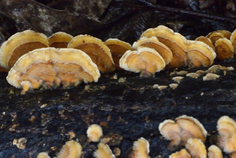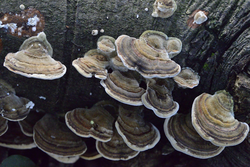 Aupa Iñigo, a ver que te dicen los palitologos pero a mi me parece que tienes fotografiadas dos especies. Trametes versicolor me parece solo la primera, las otras me parecen Stereum hirsutum.