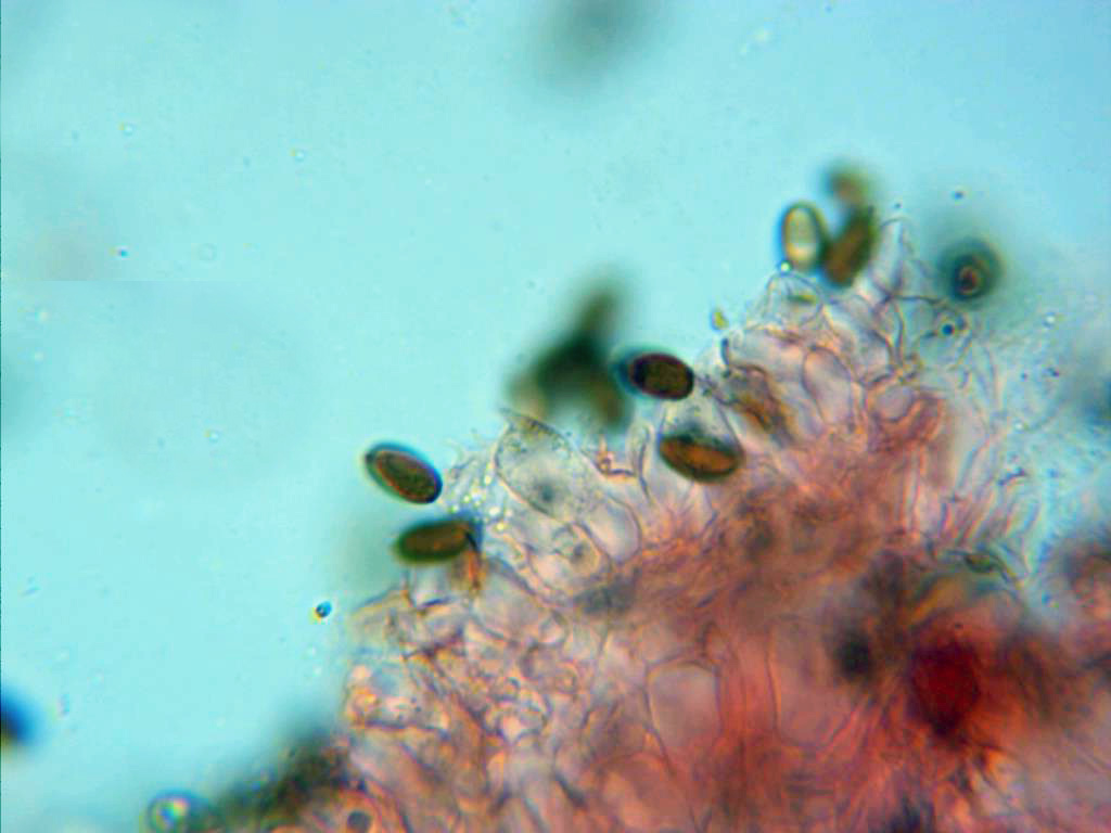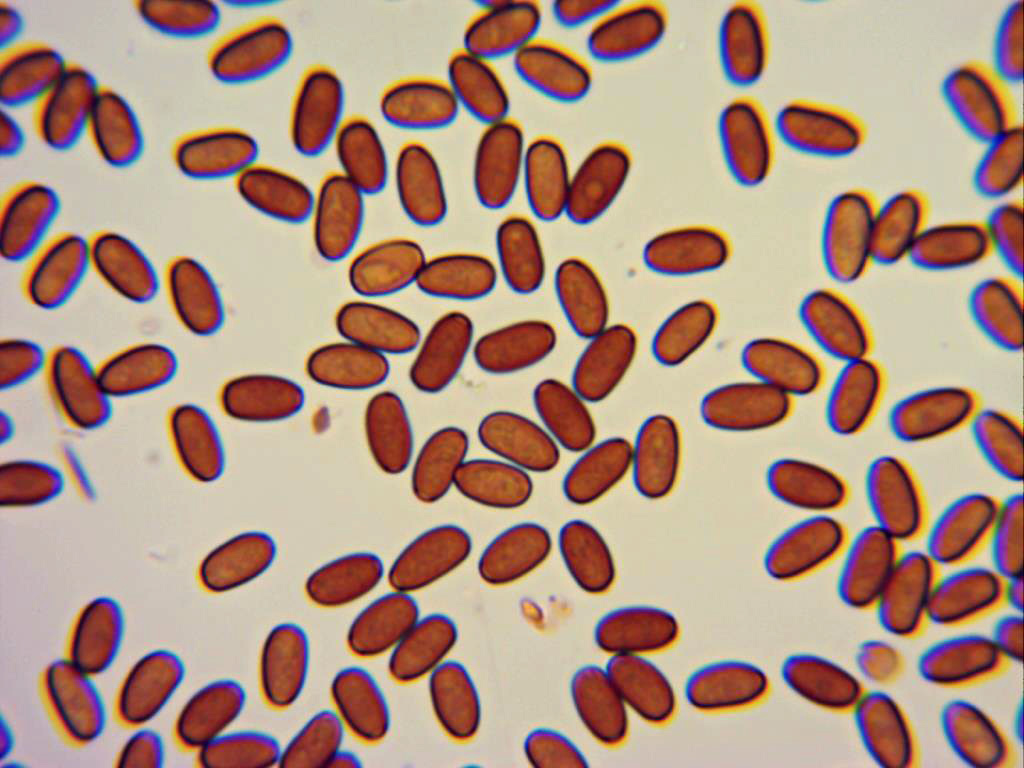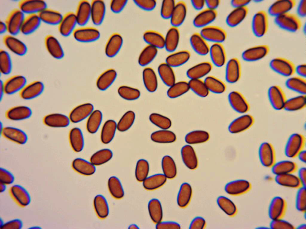 Esporas en rojo congo diluido, alargadas, elípsoidales y de color marrón, las medidas después de dedicarle casi toda la mañana a ellas, arrojan un resultado de 8,06 (8,61;9,41) 9,79 X 4,12 (4,48;5,10) 5,35, con un promedio de M = 8,941 X 4,806.
