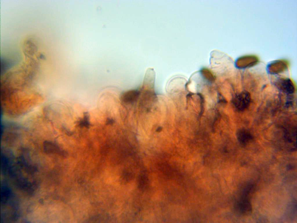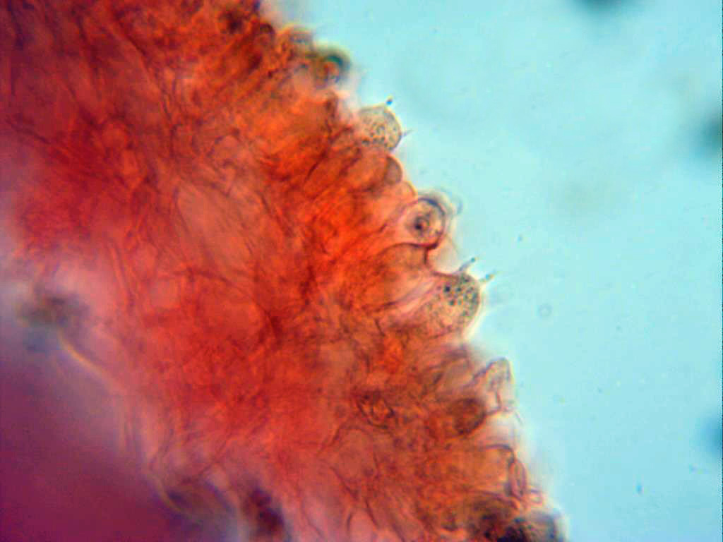 Lo que sí observo en la arista son paracistidios, esas células clavas y esferopedunculadas que parecen abundantes en comparación con los queilocistidios...lageniformes????