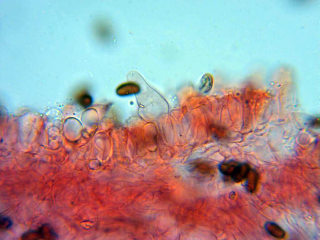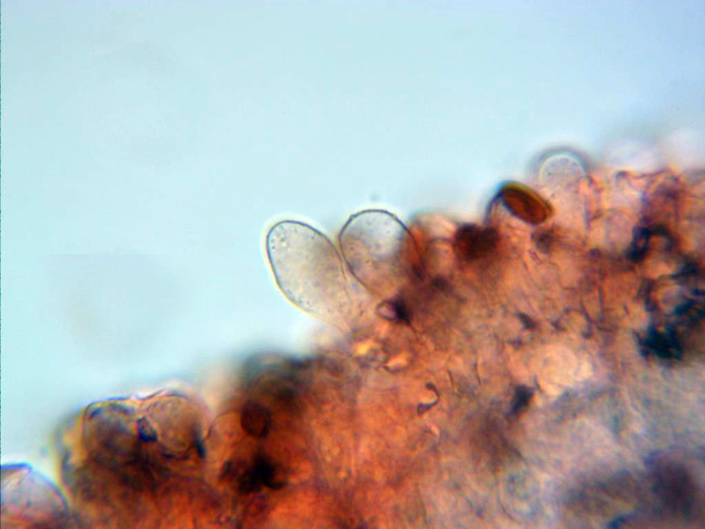 Queilocistidios escasos y de diversas formas, los de la imagen entre cilindricos y globosos, ensanchados en el ápice, sus medidas 22;26 X 10,9;11,7 micras.