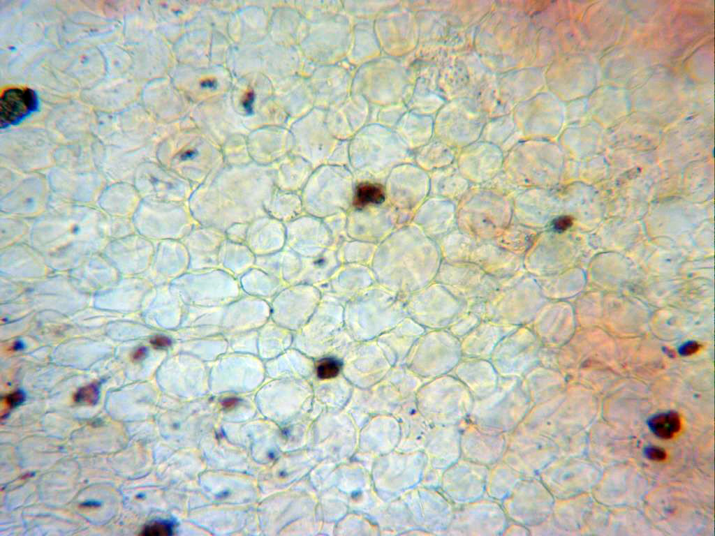 Pileipellis a 400 aumentos. Cutícula celulósica formada por una mezcla de hifas entre esféricas, globulosas y piriformes, muy débilmente pigmentadas, de un tamaño bastante variable, las de la imagen de entre 11 a 31 micras.