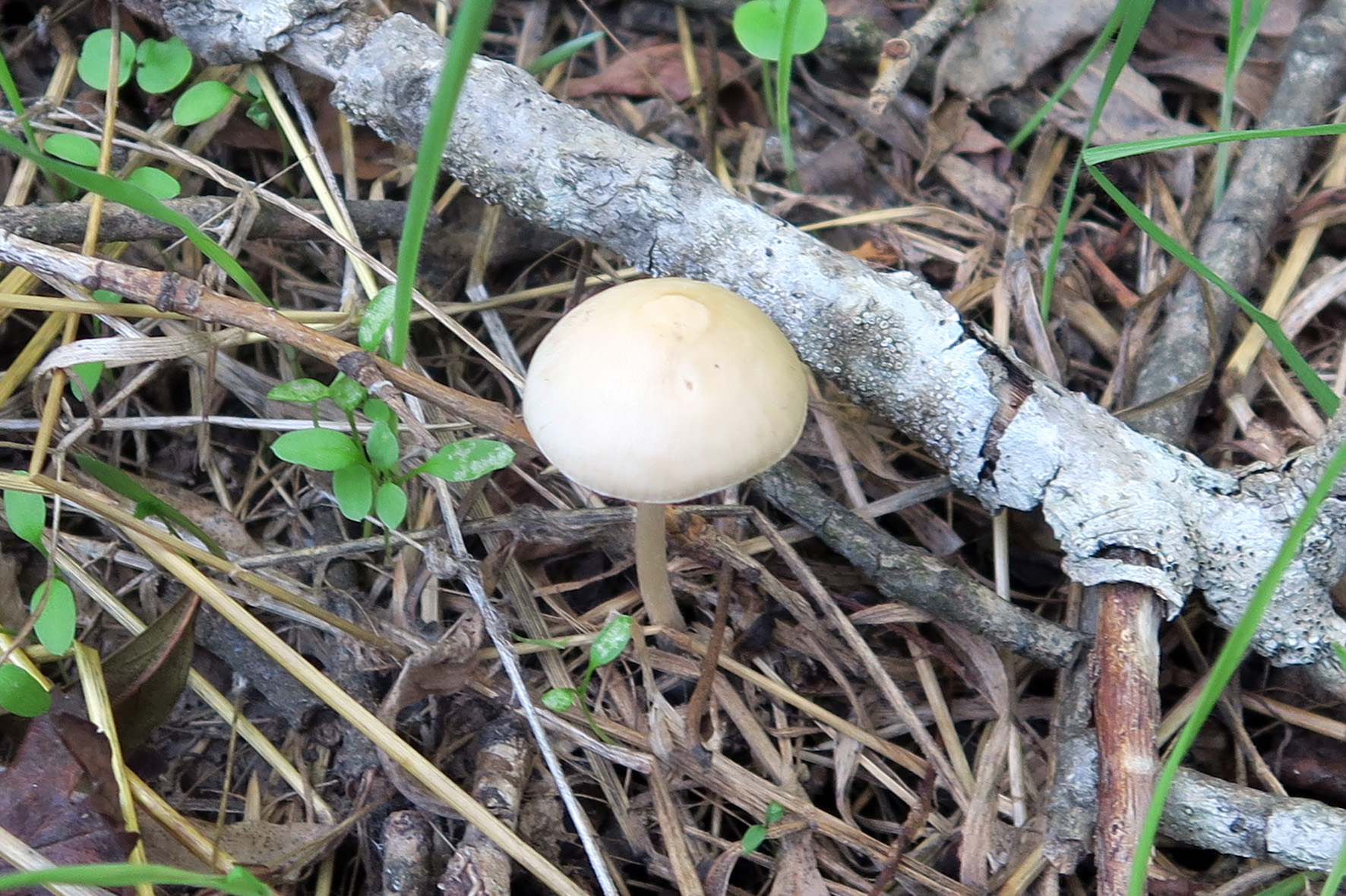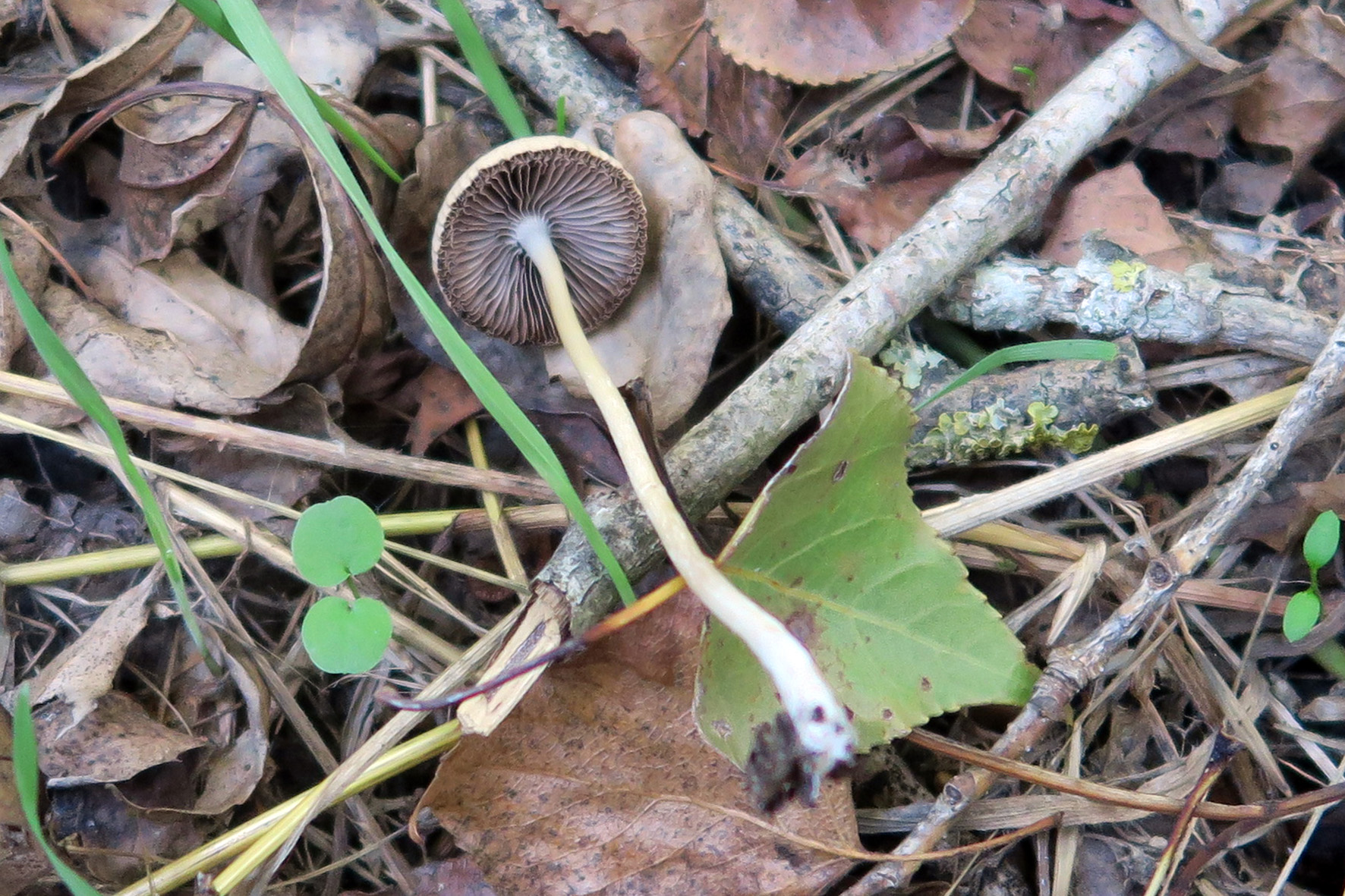 Varios ejemplares brotando individualmente, o de forma gregaria con pocos individuos, de pequeño tamaño, menos de 2 cm. el mayor, de sombrero acampanado, algo cónico, con un color de blanquecino a pardo, algo zonado y con transparencia radial de las láminas.