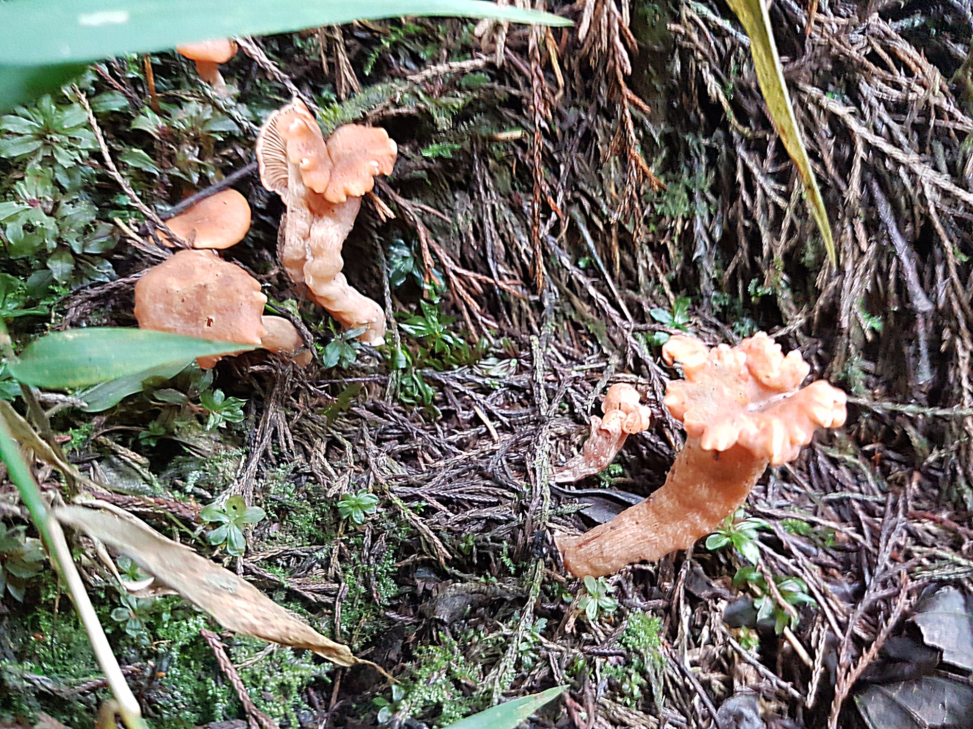 Hace un par de meses encontré en una caminata, en una zona intermedia entre bosque primario y bosque secundario de coníferas, estos hongos. Buscando en San Google, inicialmente pensé que eran Cantarellus, pero por lo que noto, encajan muy bien en el género Craterellus... pero no sé el "apellido".