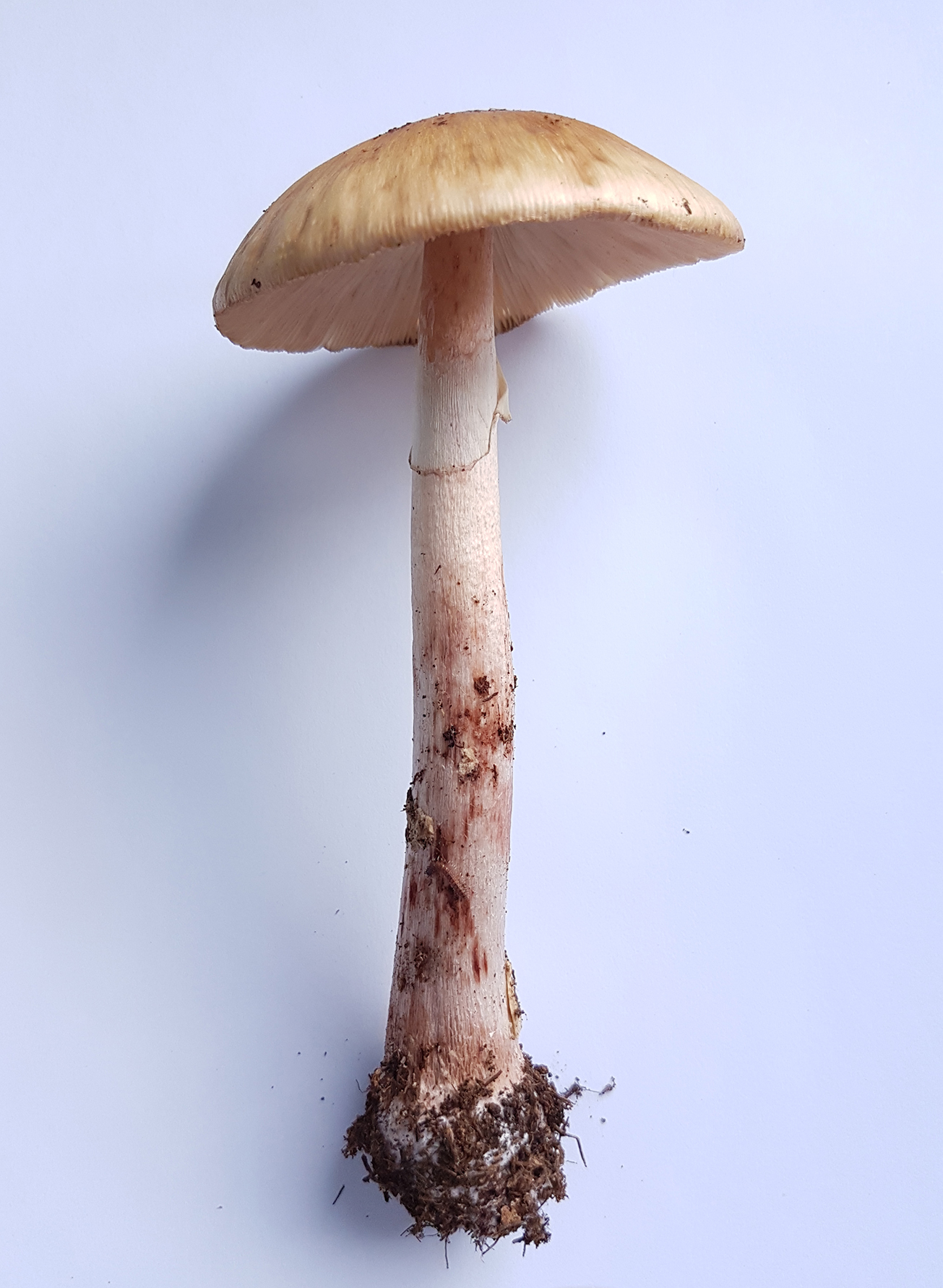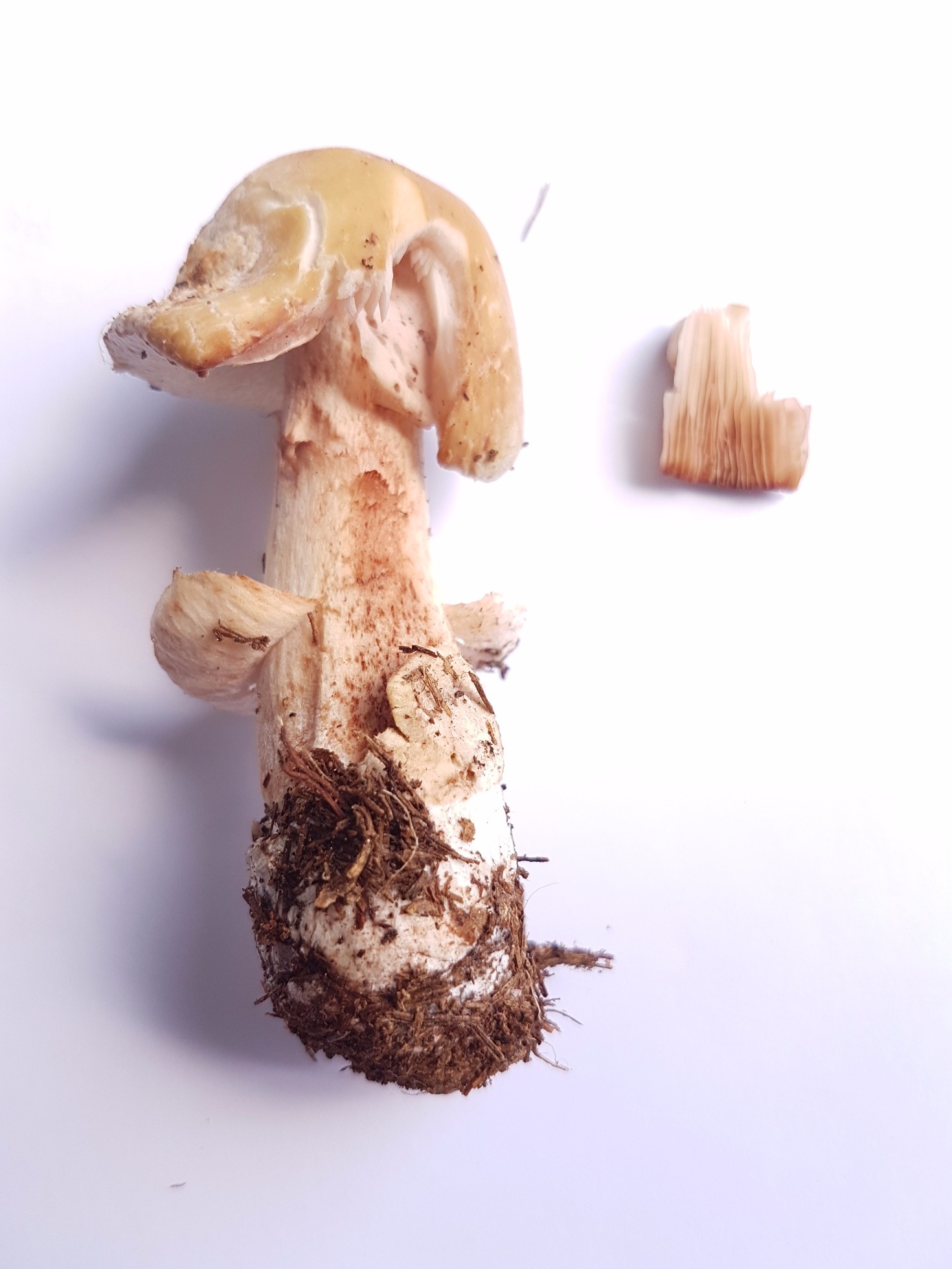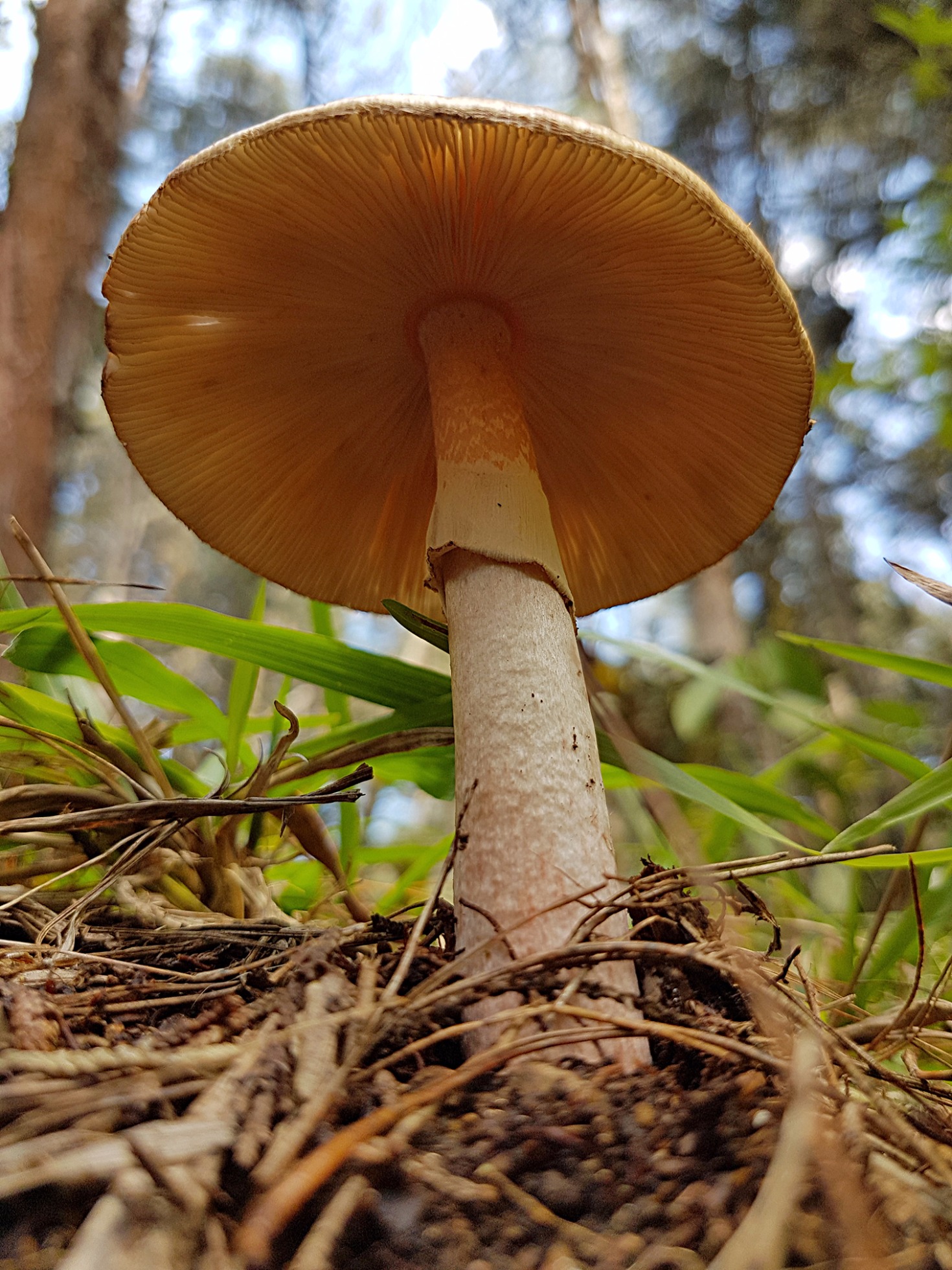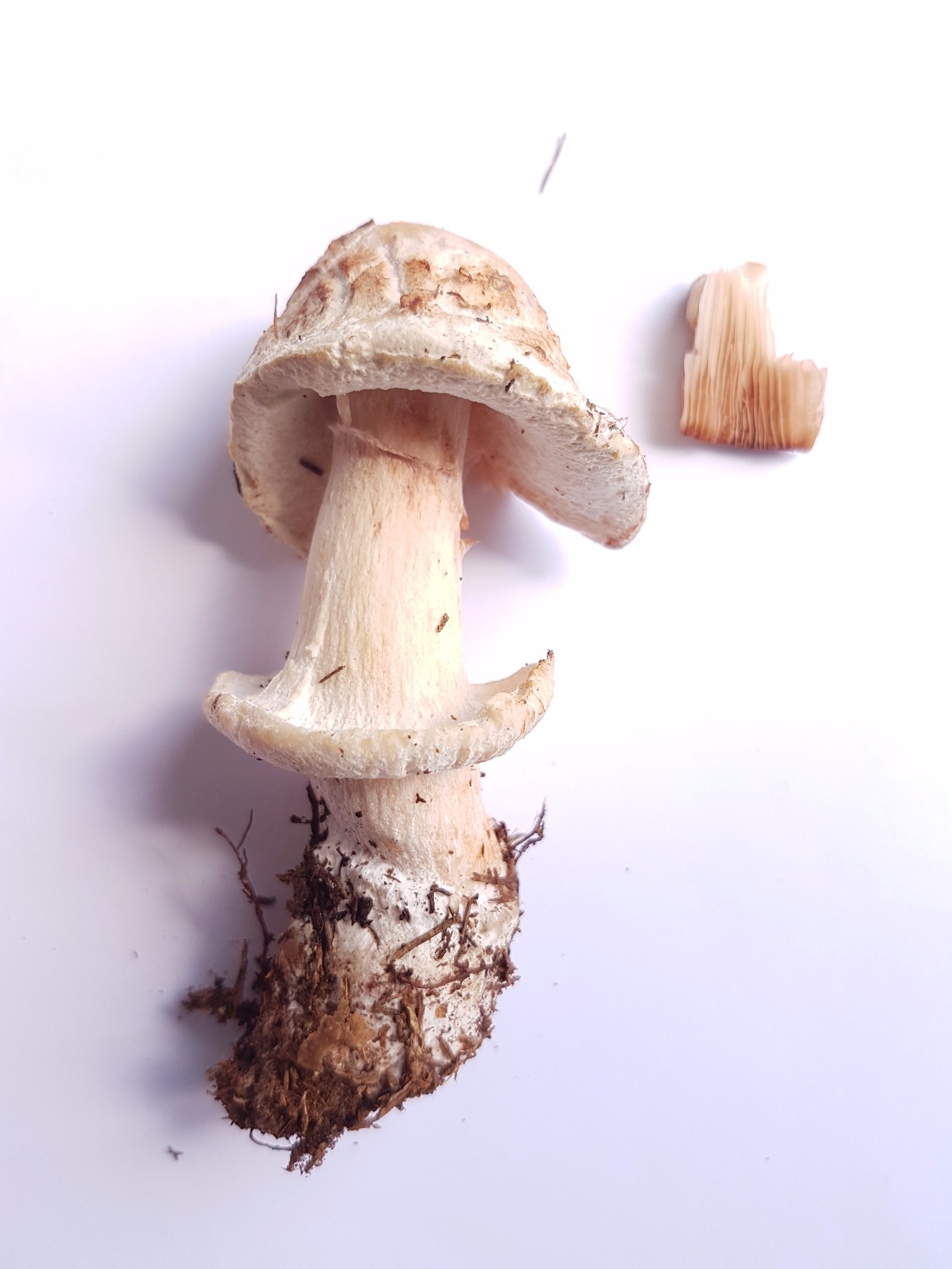 En mi última caminata en un bosque secundario andino de coníferas, encontré esta seta que me recordó a alguna especie de amanita. Tenía volva, aunque fue tan frágil que no la pude extraer con ella. La esporada salió blancuzca (tenue) aunque me pareció discernir un muy pálido tono rosado, muy tenue.
