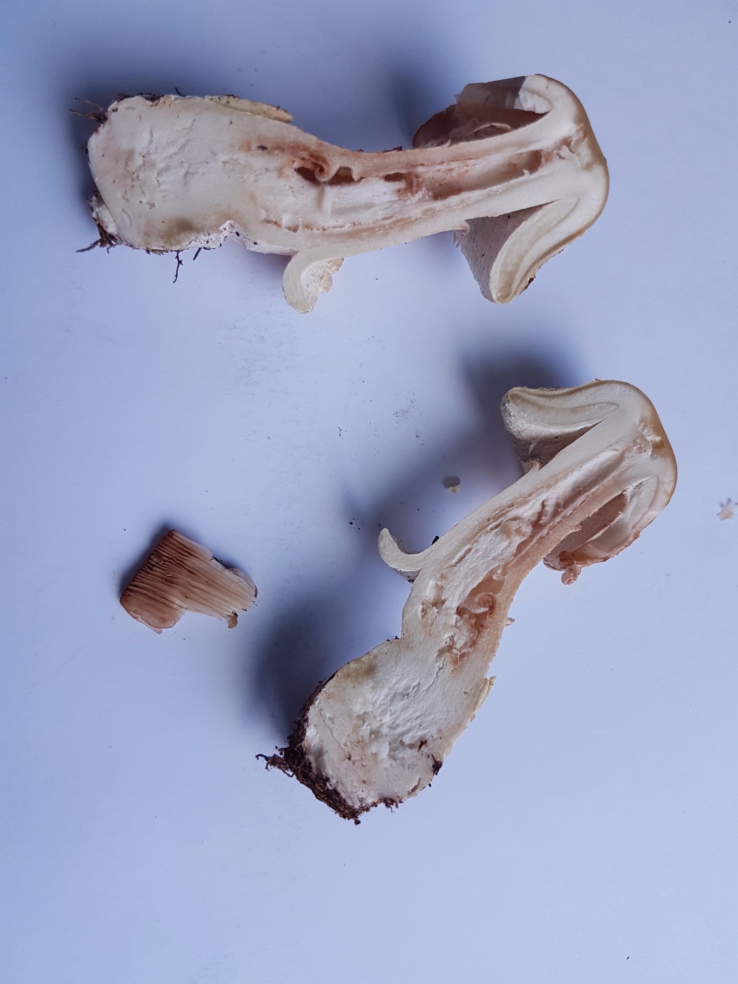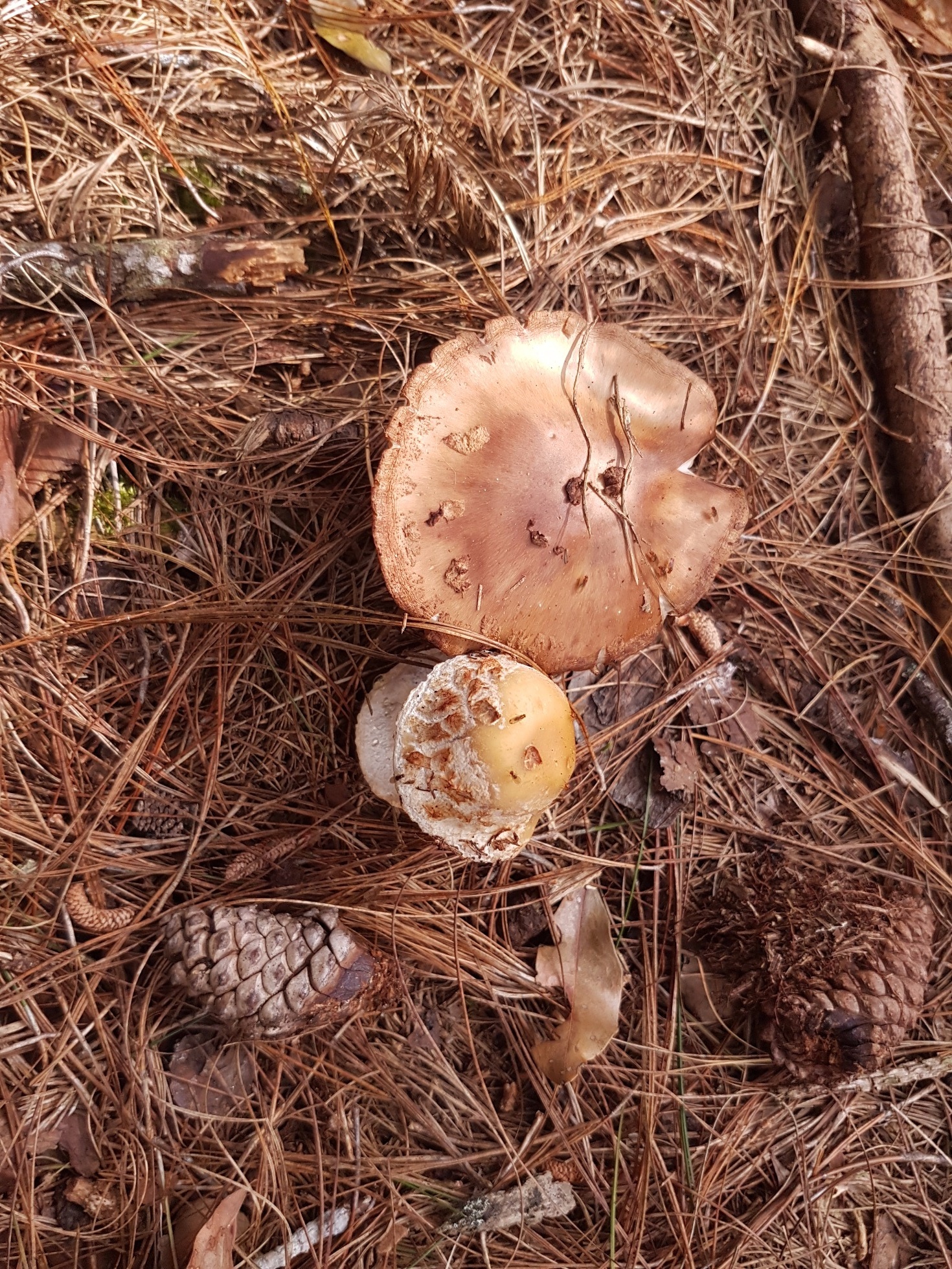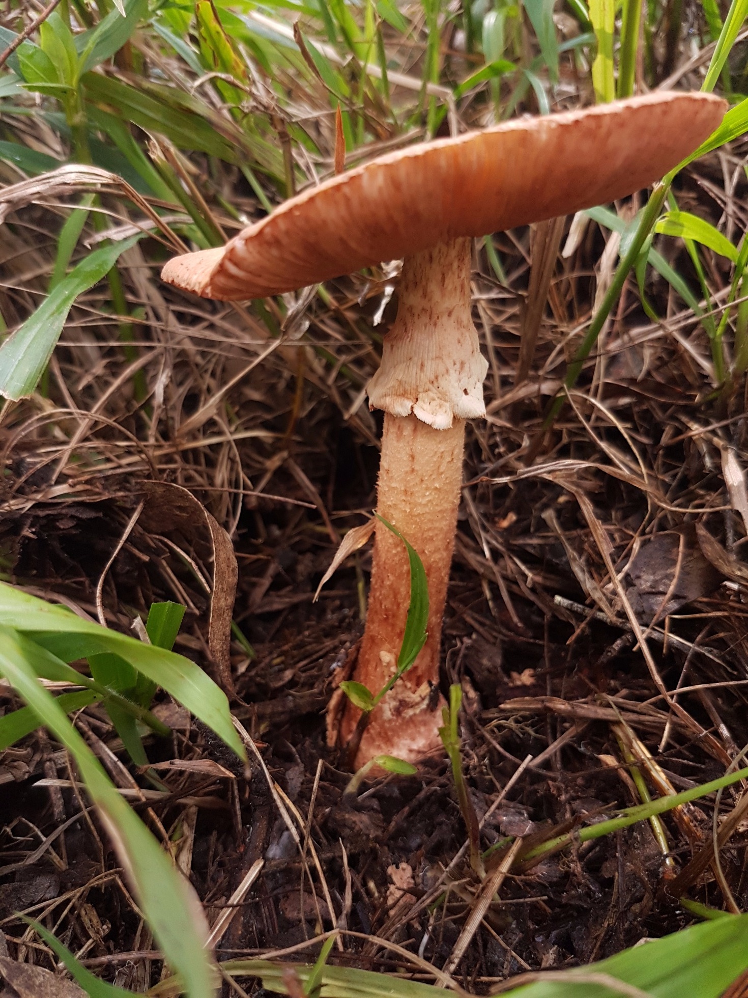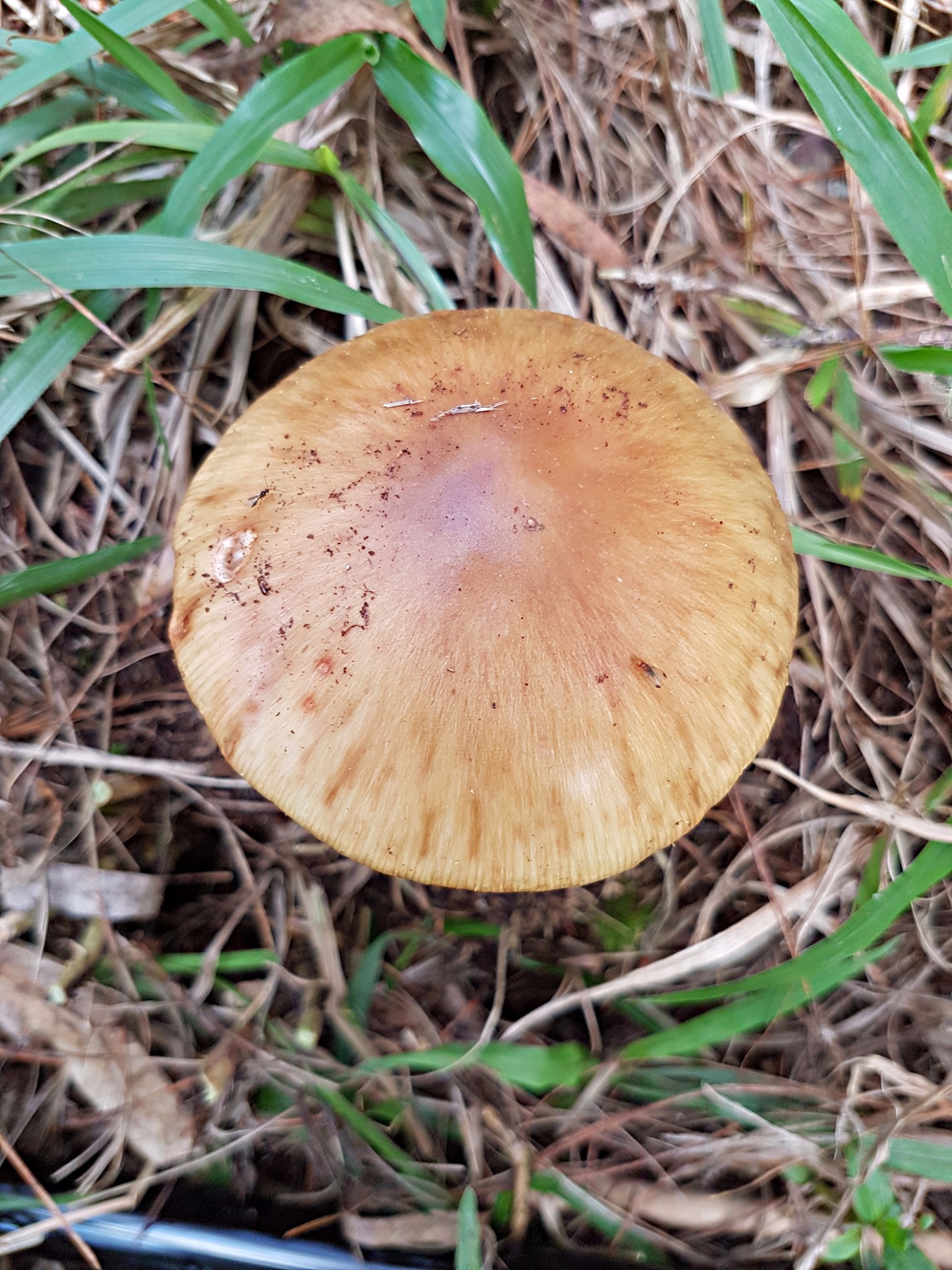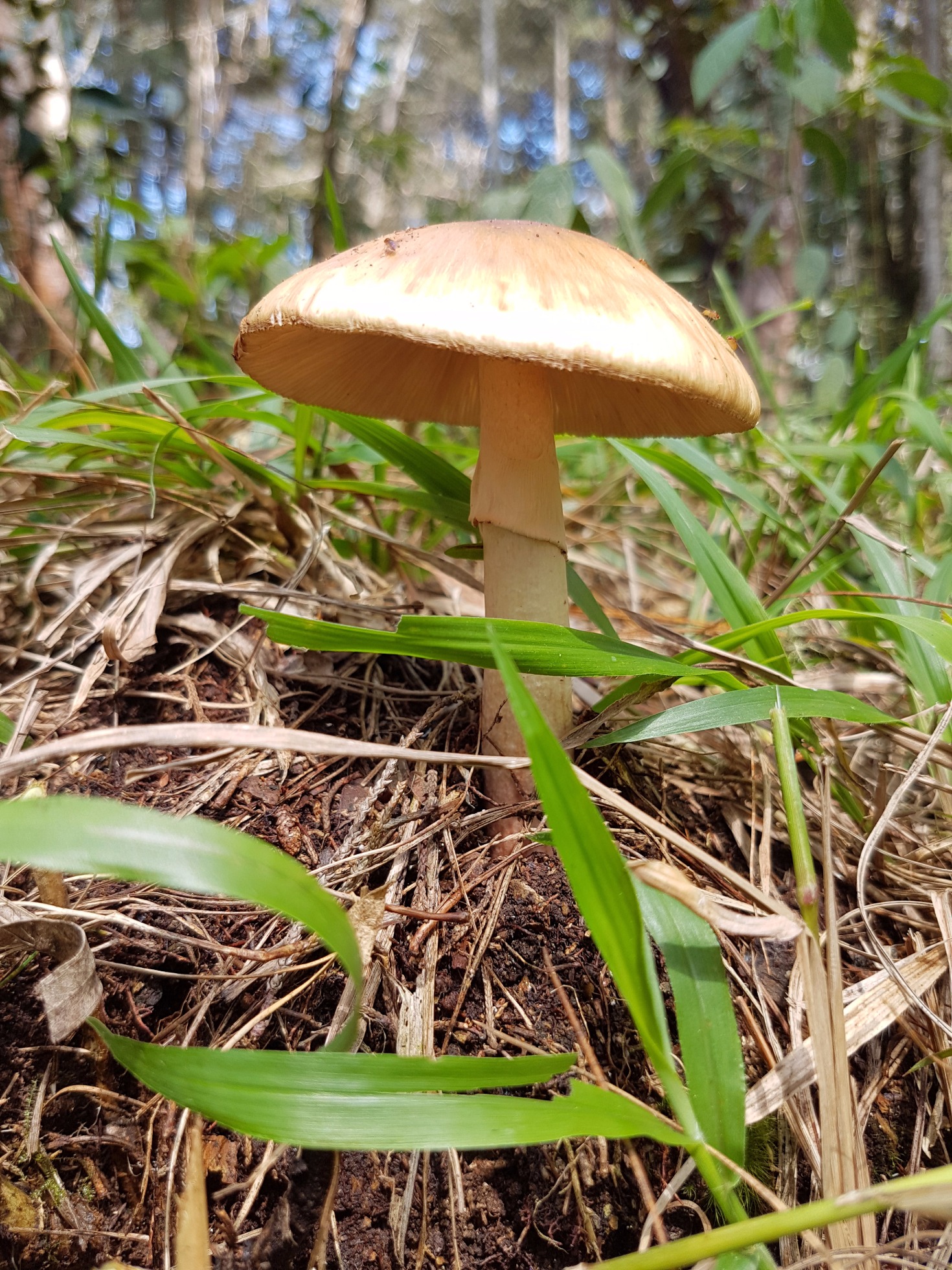 En mi última caminata en un bosque secundario andino de coníferas, encontré esta seta que me recordó a alguna especie de amanita. Tenía volva, aunque fue tan frágil que no la pude extraer con ella. La esporada salió blancuzca (tenue) aunque me pareció discernir un muy pálido tono rosado, muy tenue.