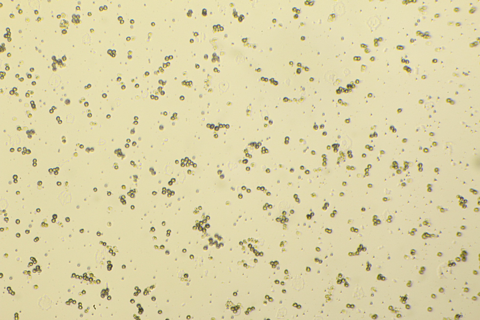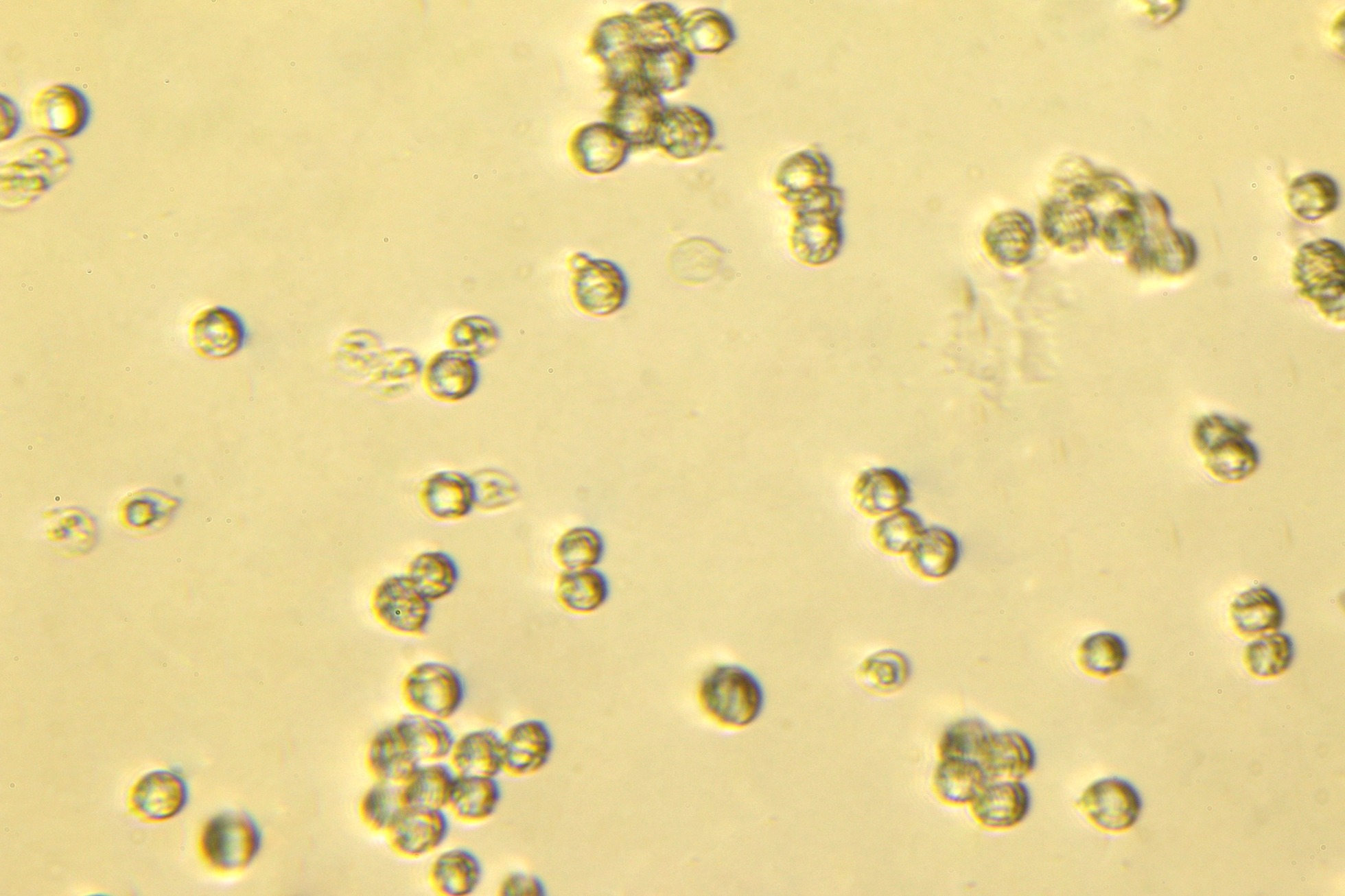 Las esporas, según mi cálculo son de alrededor de 7.6 µm por 6.6 µm. Anexo fotos de ellas al final (con todas las restricciones que me impone el trasto que tengo por "microscopio").