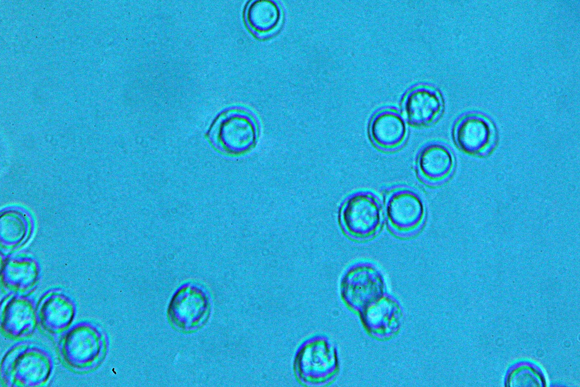 Hola. Ayer volví a caminar en el mismo bosque y encontré 3 ejemplares de lo que creo que son la misma seta (estaban enjambradas por moscas Drosophila melanogaster o alguna especie similar). Le tomé foto con filtro azul a sus esporas y me dieron aproximadamente del mismo tamaño y de la misma forma más o menos elíptica tendiente a globosa. El tamaño de las esporas estaba más o menos entre [5.5 ; 7] x [5 ; 6 ] , a ojo de buen cubero. Más o menos el mismo del espécimen con el que abrí esta línea.