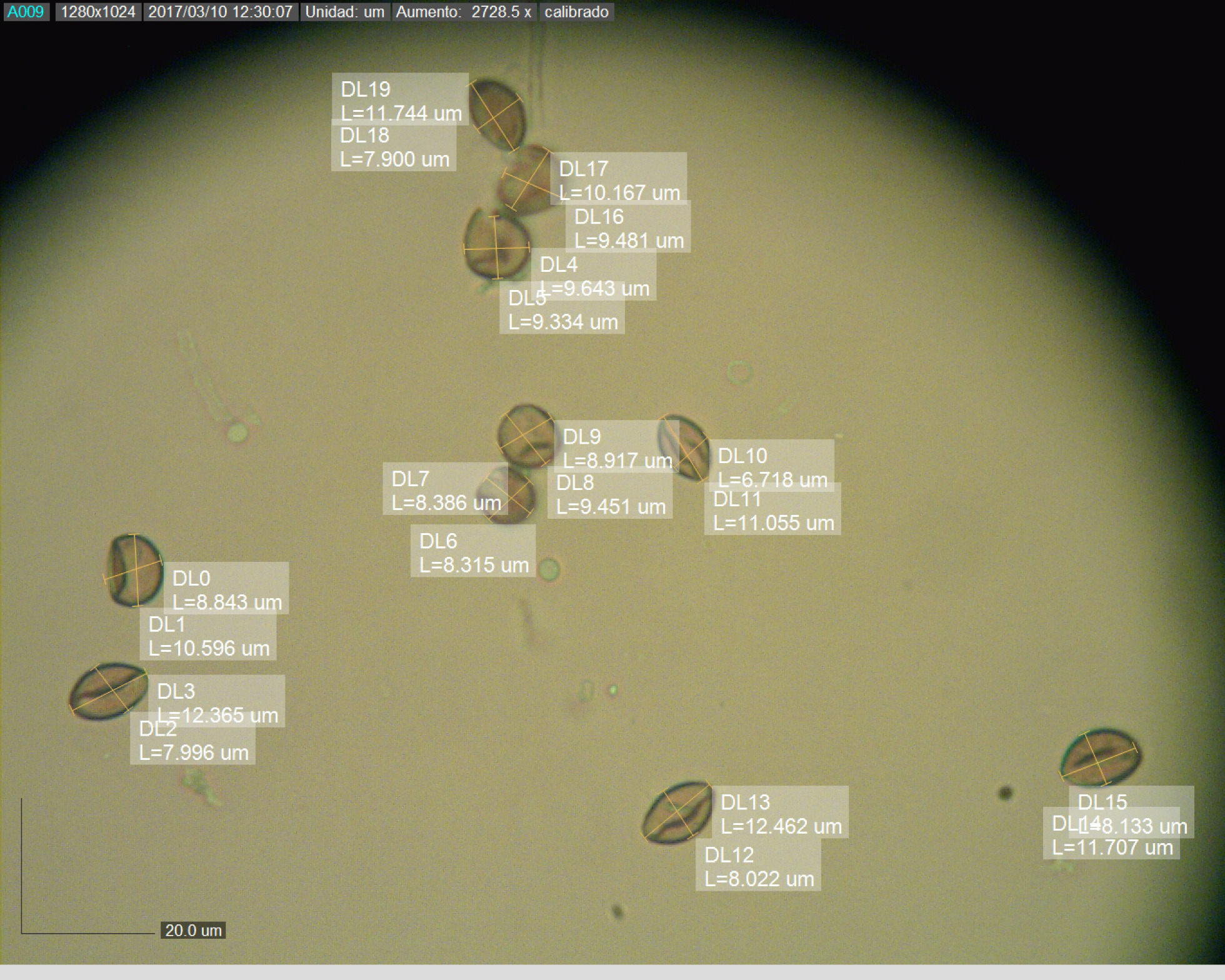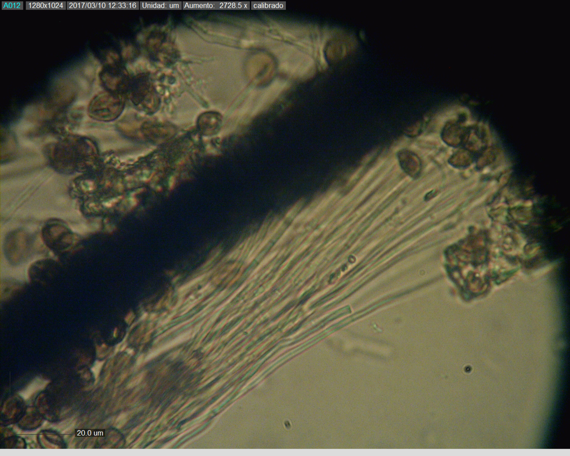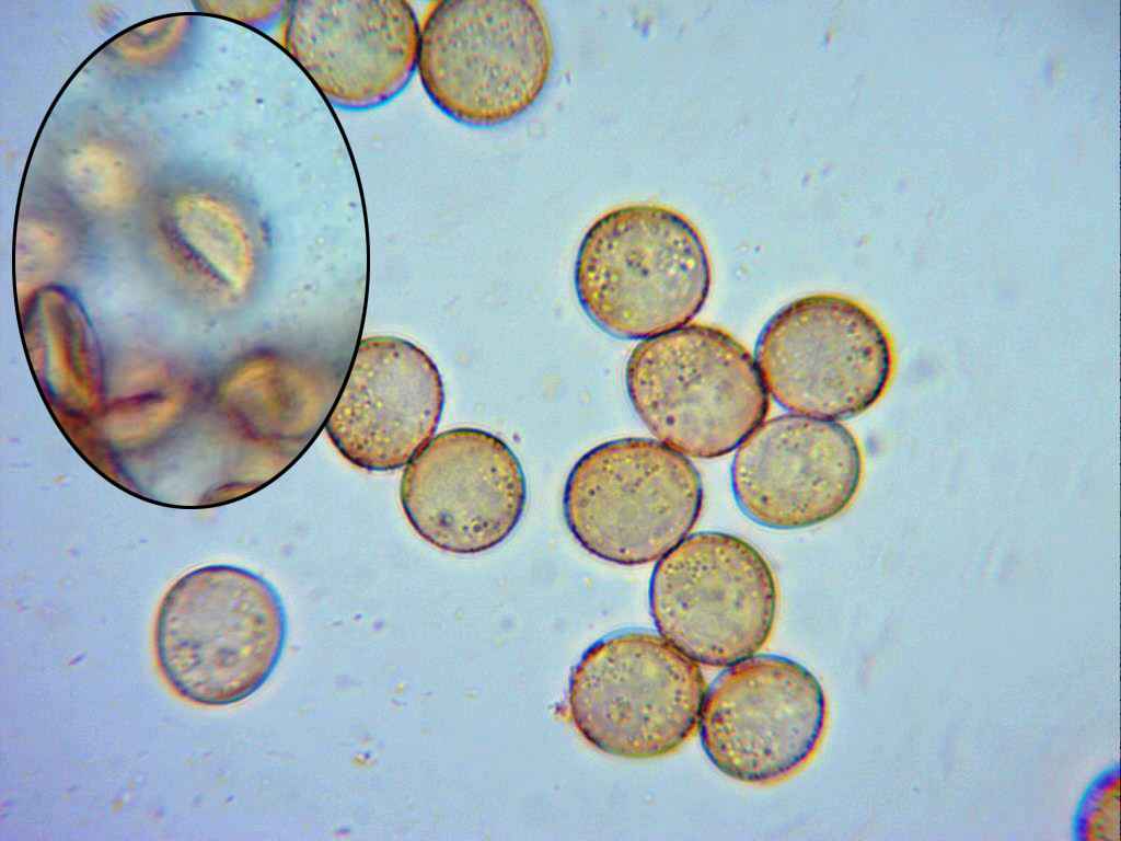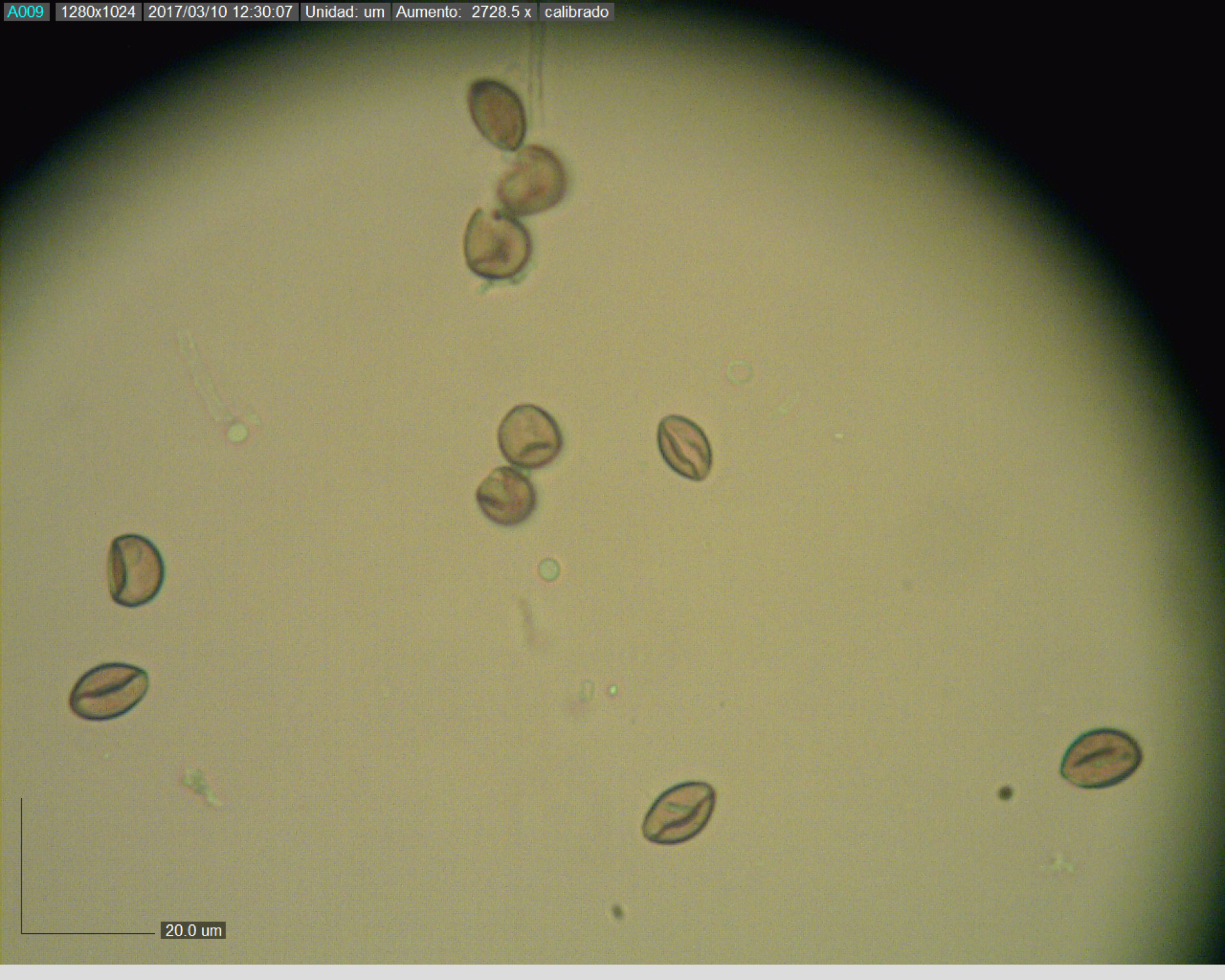 y ahora con el micro, las esporas, bien curiosas ellas, parecen semiesferas con una hendidura bastante considerable, esto nos ha dado problemas porque no sabíamos cuáles medir