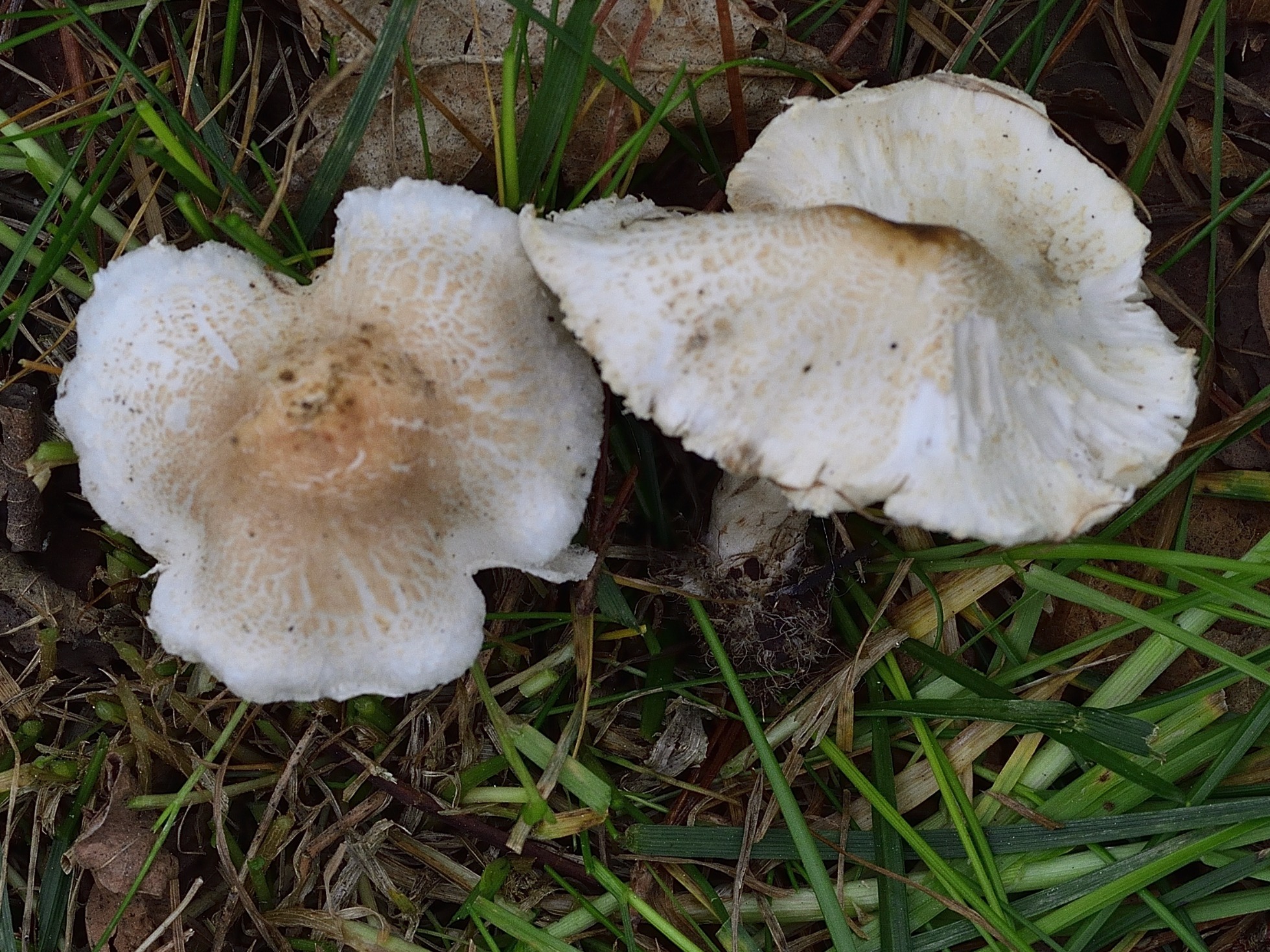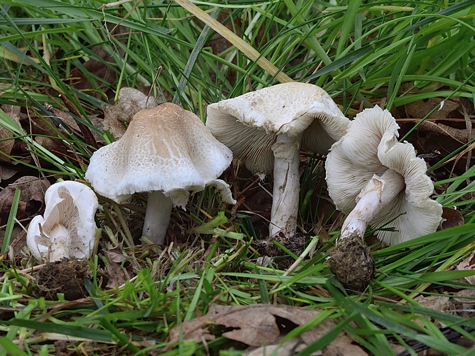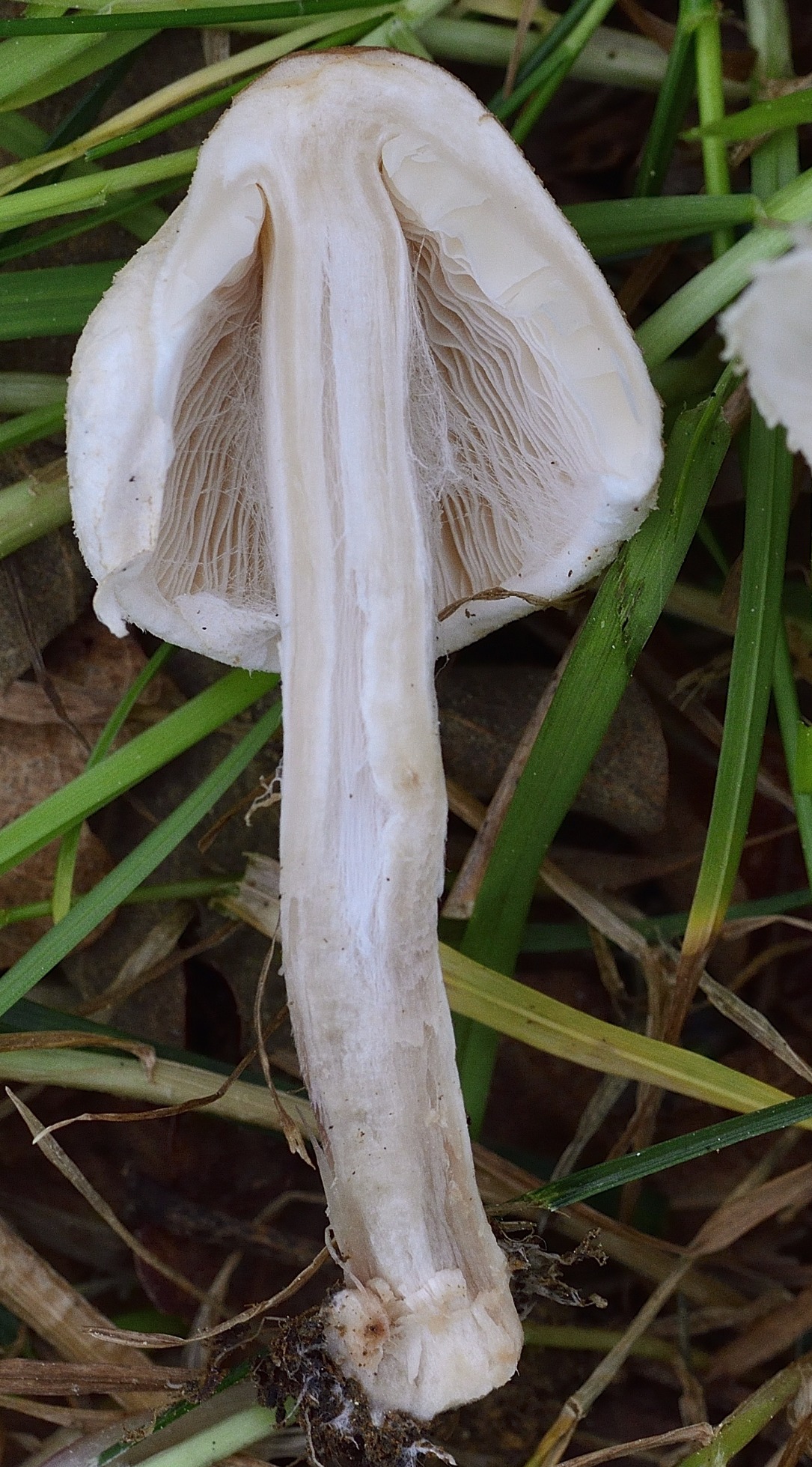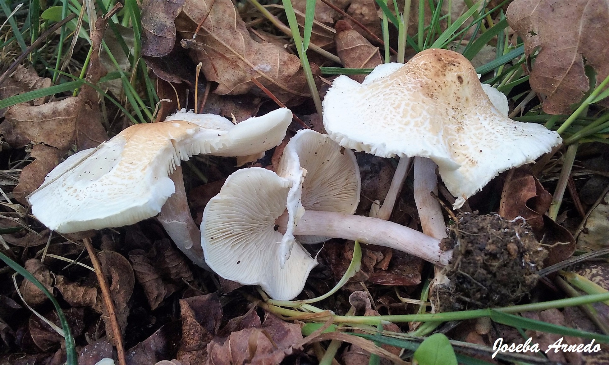 Hoy he podido compartir un rato con el amigo Iñigo y me ha llevado a ver la susodicha especie. La forma tan campanulada del sombrero me llevó a pensar en el género Leucoagaricus.