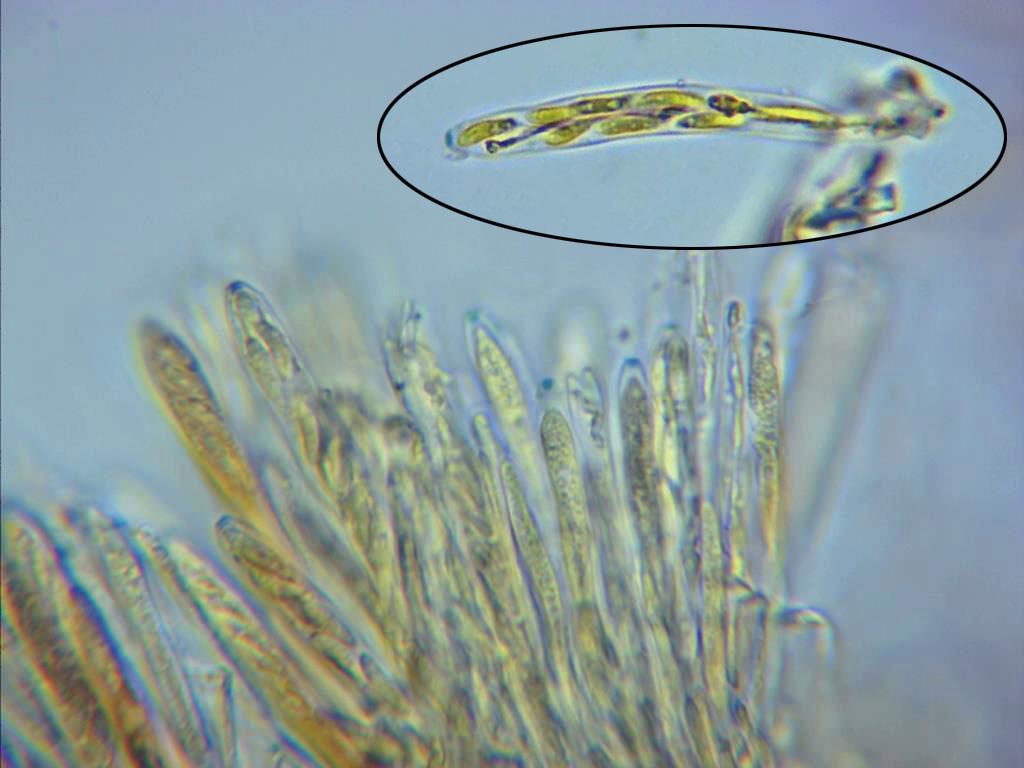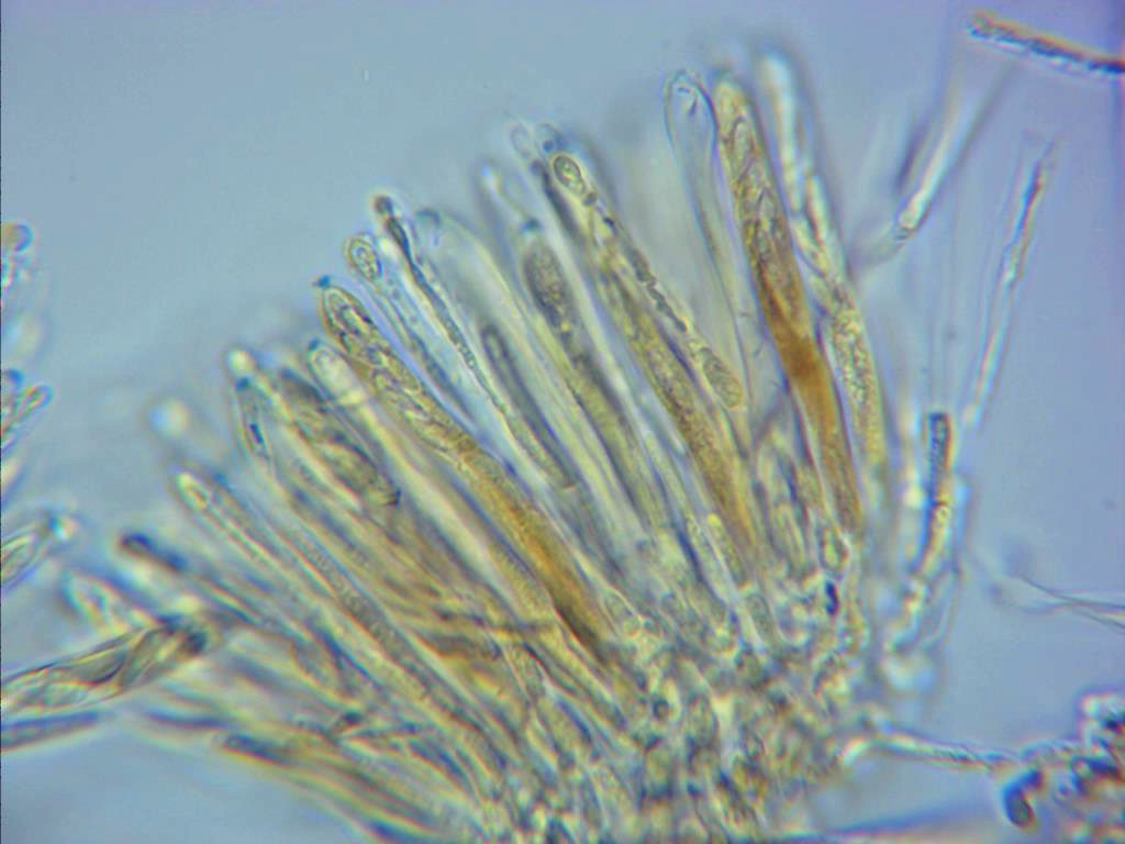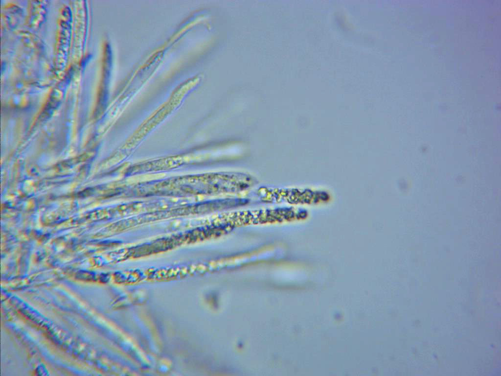 Ascas en solución de rojo congo muy diluido (4 o 5 %), con 8 ascosporas en cada una, la medida de las ascas en este caso de 46,8 a 58,7 micras de largo por 5 a 6,4 micras de ancho.
