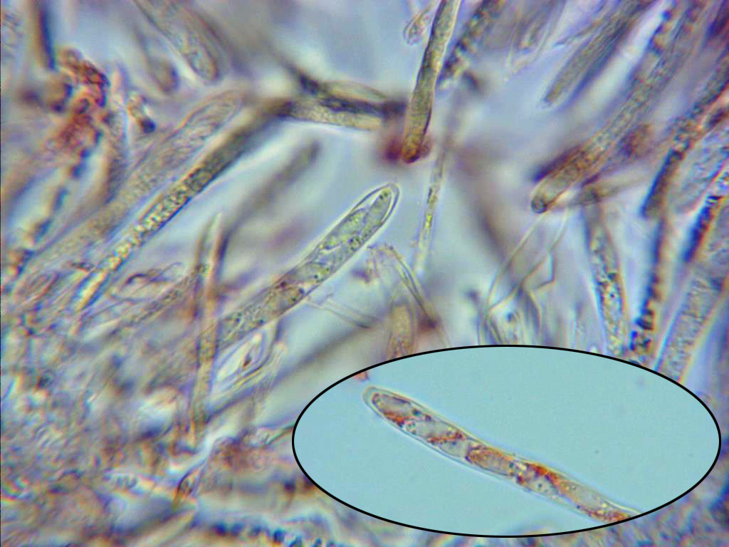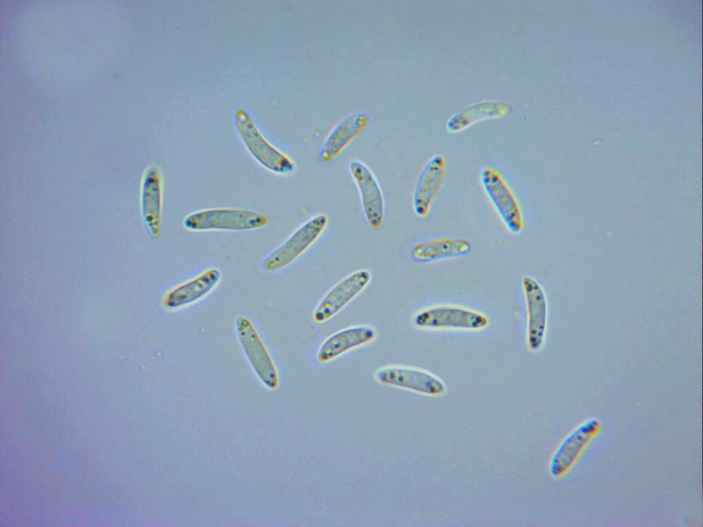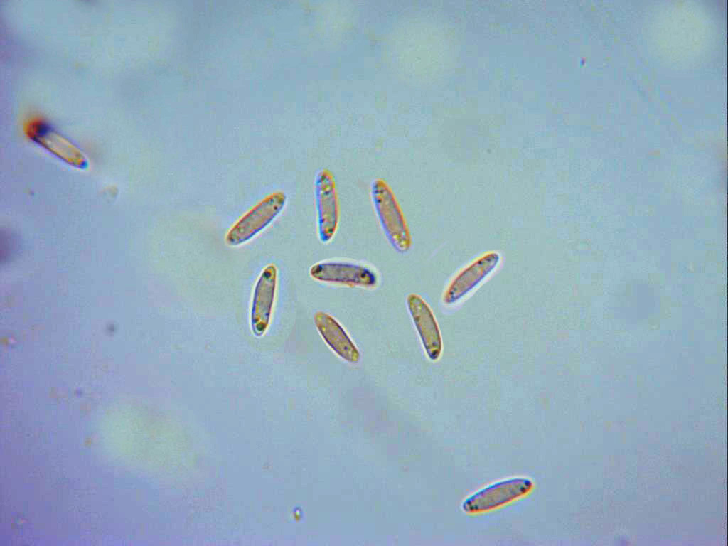 Esporas en agua destilada, cilíndricas, alargadas y algunas algo cónicas, con gutulaciones más visibles en los extremos de estas, las medidas de estas de 8,8 (9,7;12) 12,5 X 2,3 (2,6;3) 3,3 micras.