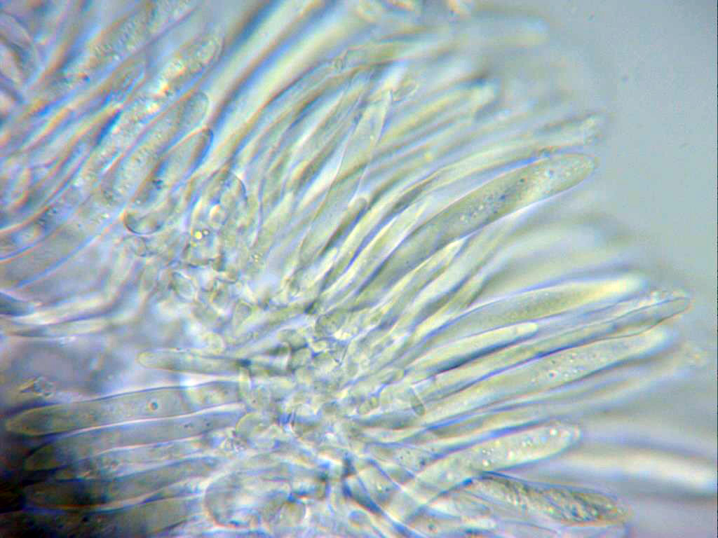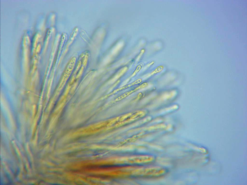 Paráfisos a 1000 aumentos en reactivo de Melzer, cilíndricos, sin septos y de una anchura inferior a las ascas (2 a 4 micras de ancho).