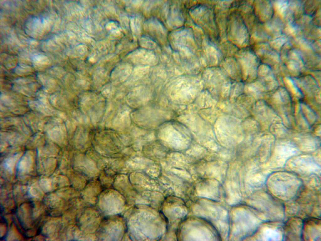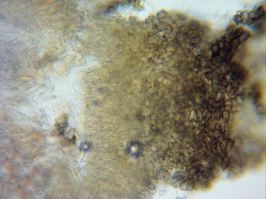 Excípulo ectal a 1000 aumentos en reactivo de Melzer, hifas de forma globulosa y con pigmentación pardo amarillenta.