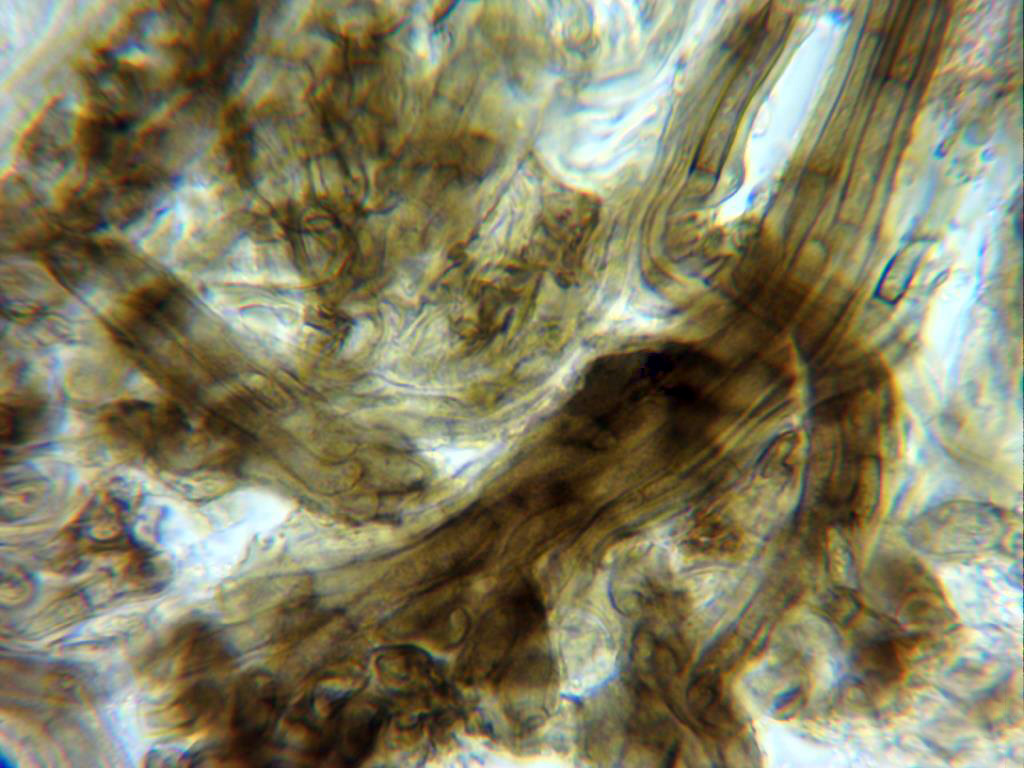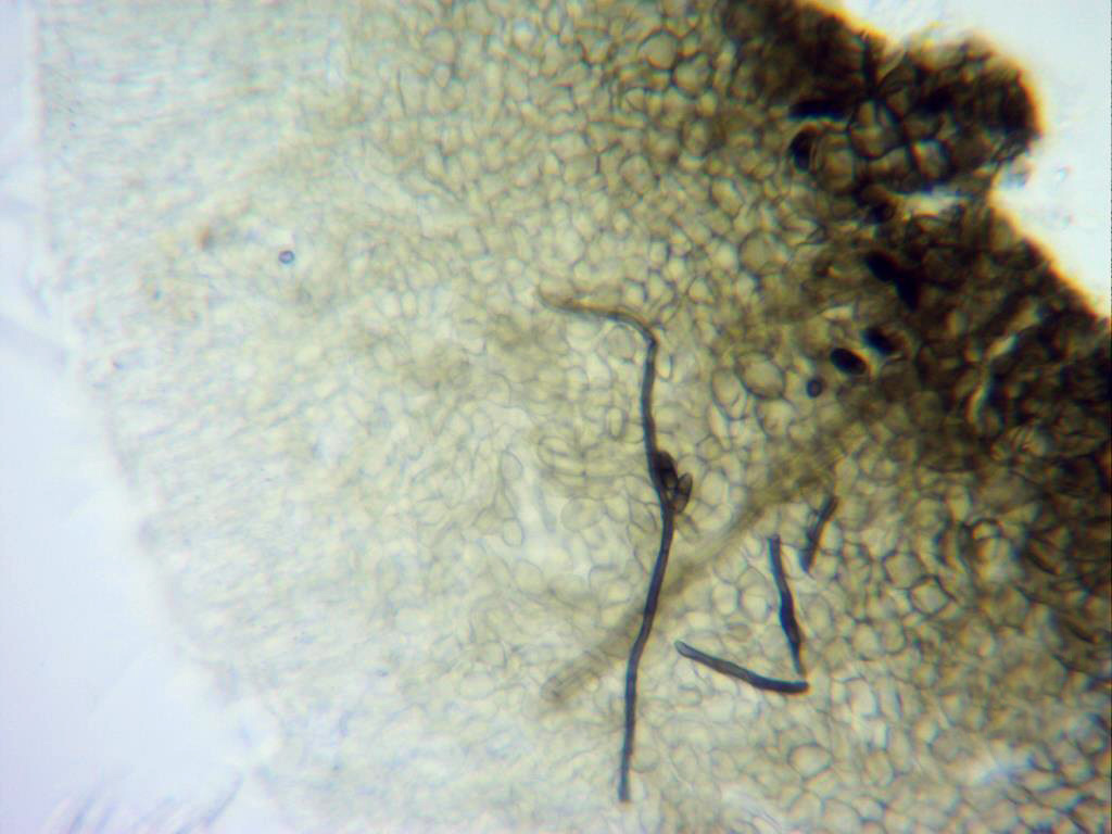 Sección a 400 aumentos en KOH, se observan las células del excípulo ectal de color pardo ocráceo oscuro, también se observan algunas hifas septadas del subículo.