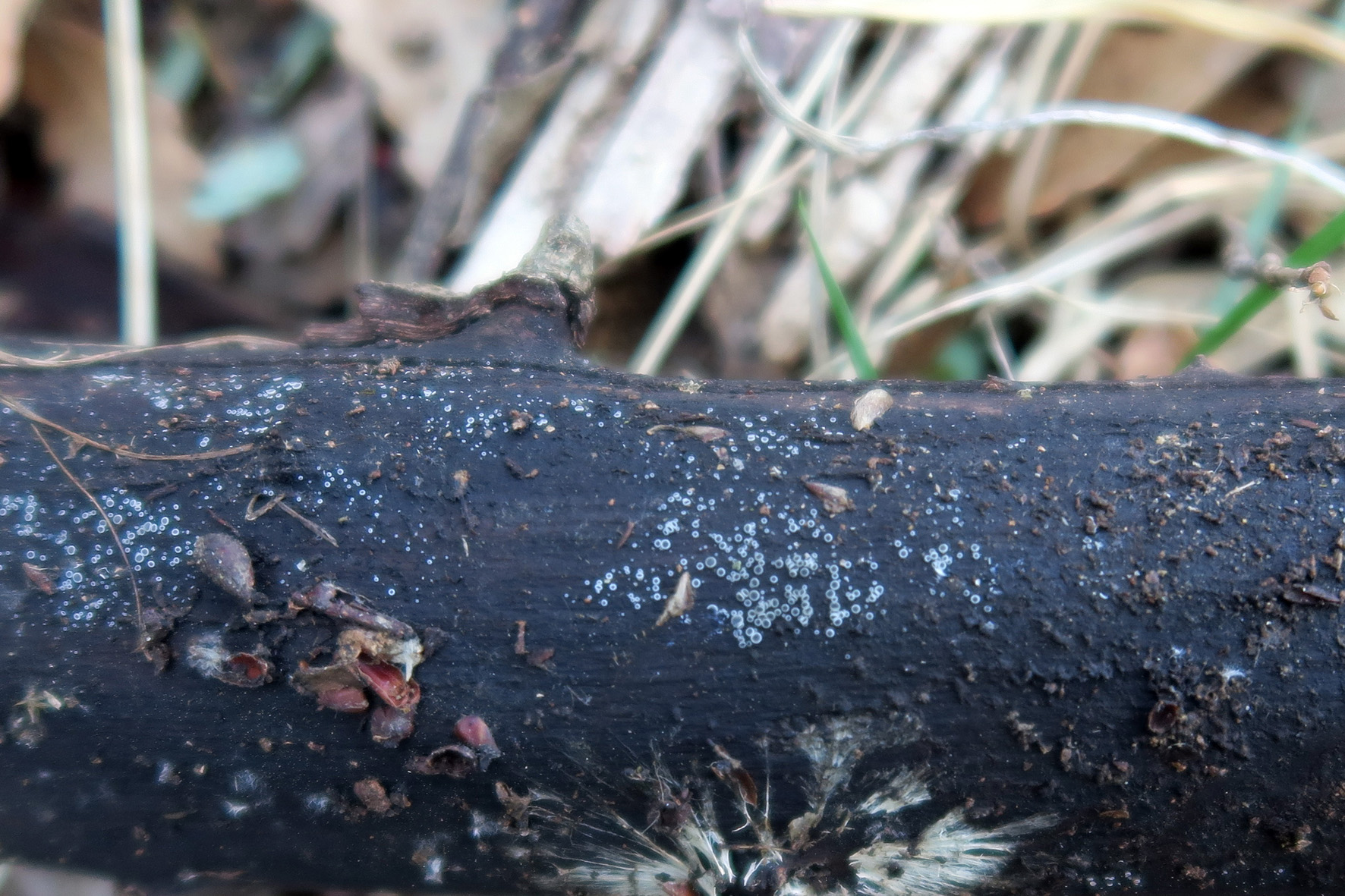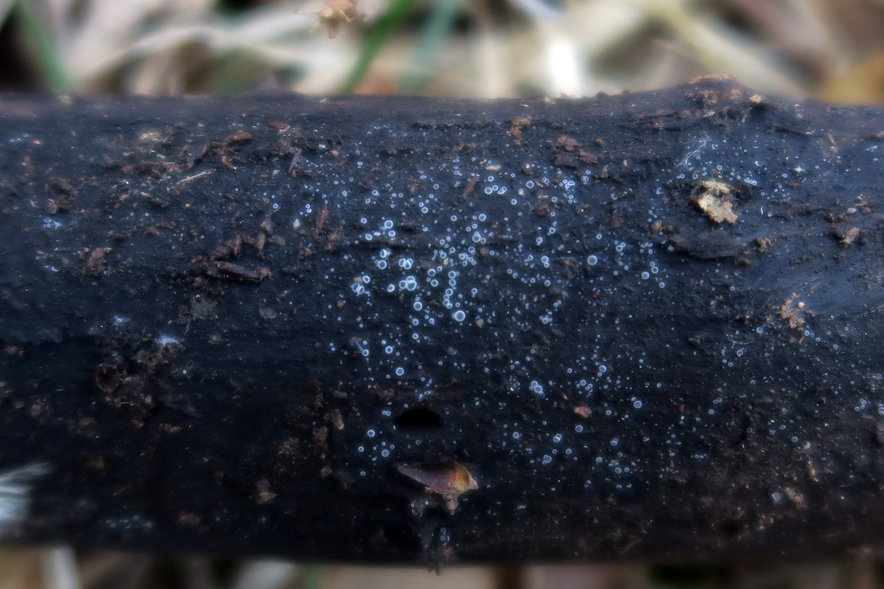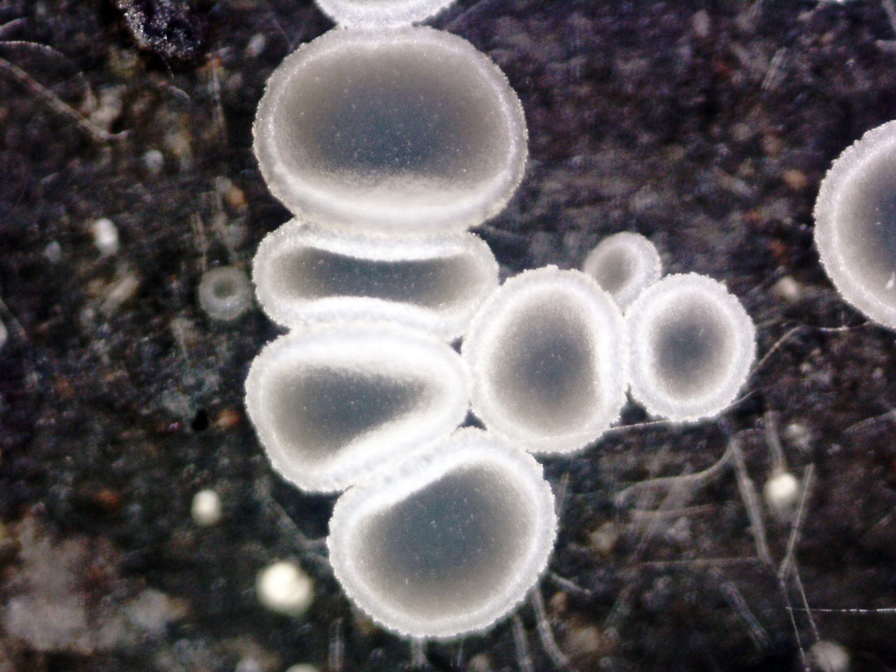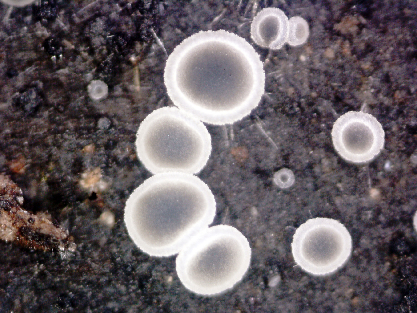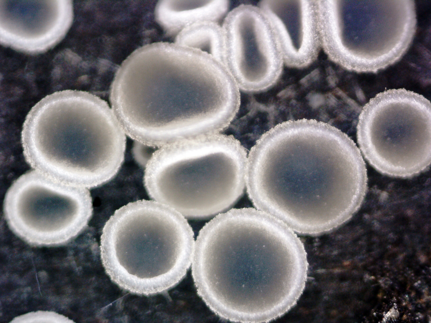 Pequeños apotecios, el mayor de apenas 1 mm., difíciles de observar a simple vista, brotando por la parte de debajo de un pequeño tronco, en el lugar predominaban los robles, siendo muy probable que la madera se trate de roble, de color gris azulado y con el borde blanquecino.
