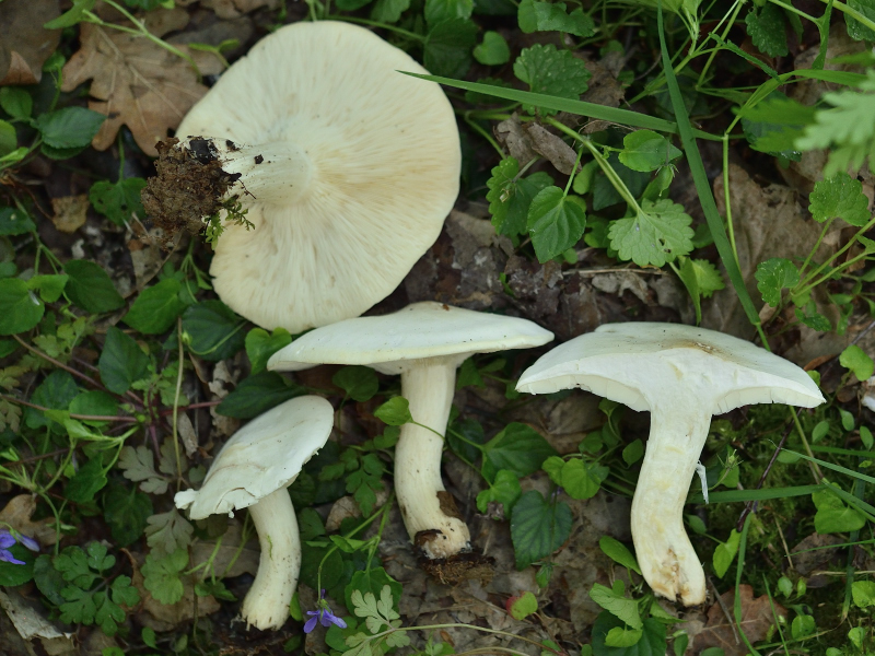 Estas blancas ni ideas. Láminas blancas apretadas y píe cilíndrico curvado. Si fuesen un poco mas grisáceas diría Clitocybe nebularis pero no tampoco veo que el sombrero se parezca mucho a la nebularis.