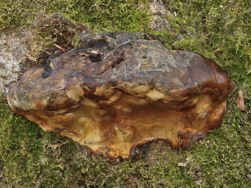 , solo opinar que los Ganodermas acostumbran a presentar la superficie poroide de color blanco y se puede dibujar perfectamente en ella. Con la cutícula brillante como la de tu imagen me he encontrado sobre madera de haya la Fomitopsis pinicola, bastante parecida a lo que nos muestras, pero no puedo decir que lo sea. Tampoco descartaría como opción, Phellinus sp.. Tengo varios yesqueros parecidos que a pesar de disponer de todos los datos y de toda su microscopía a día de hoy los tengo aún como "pendientes de identificación", es decir que no nos resulta nada fácil opinar sobre una sola imagen como es tu caso con garantías.