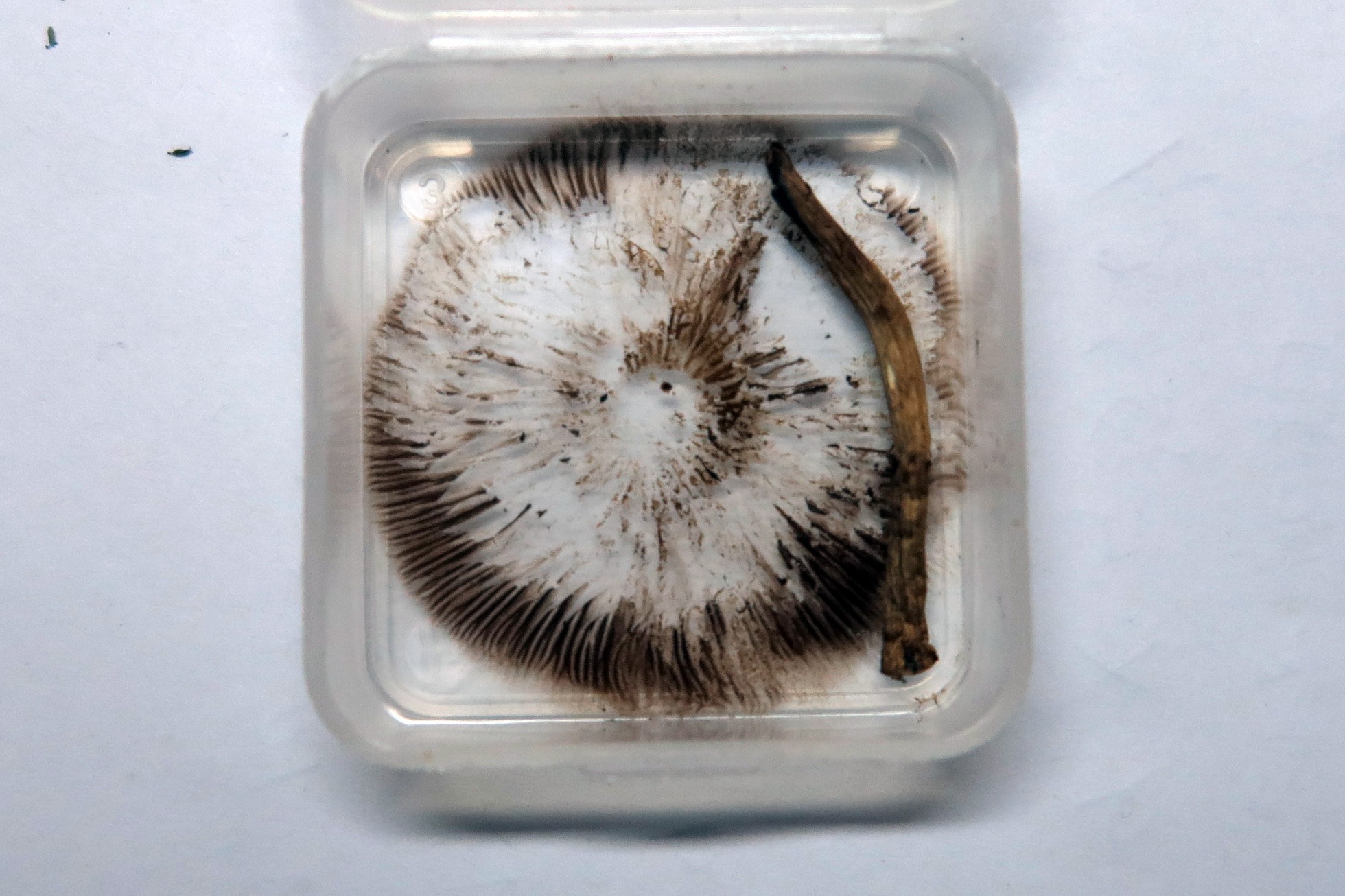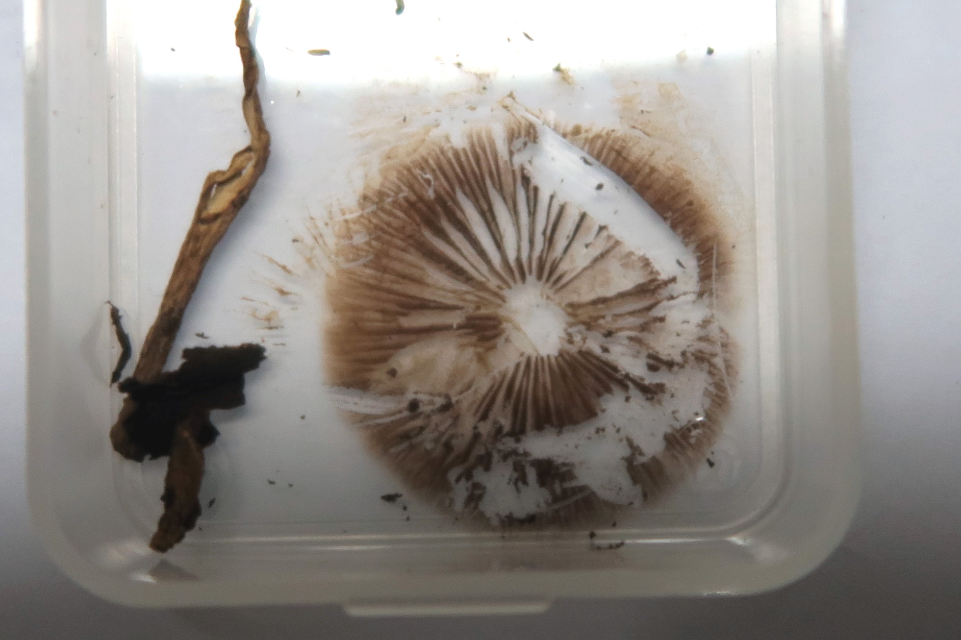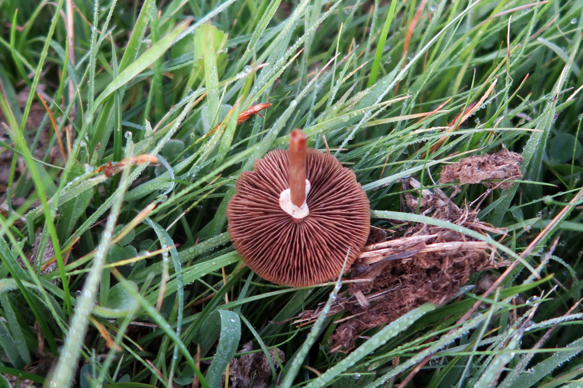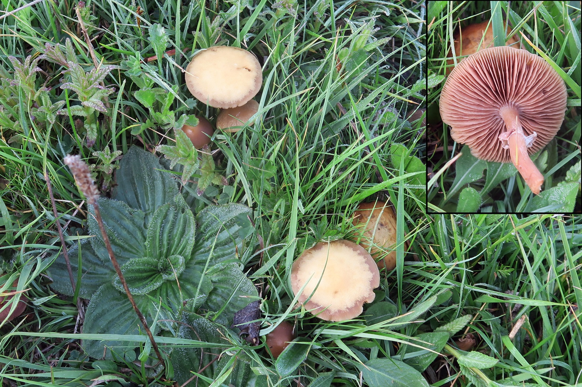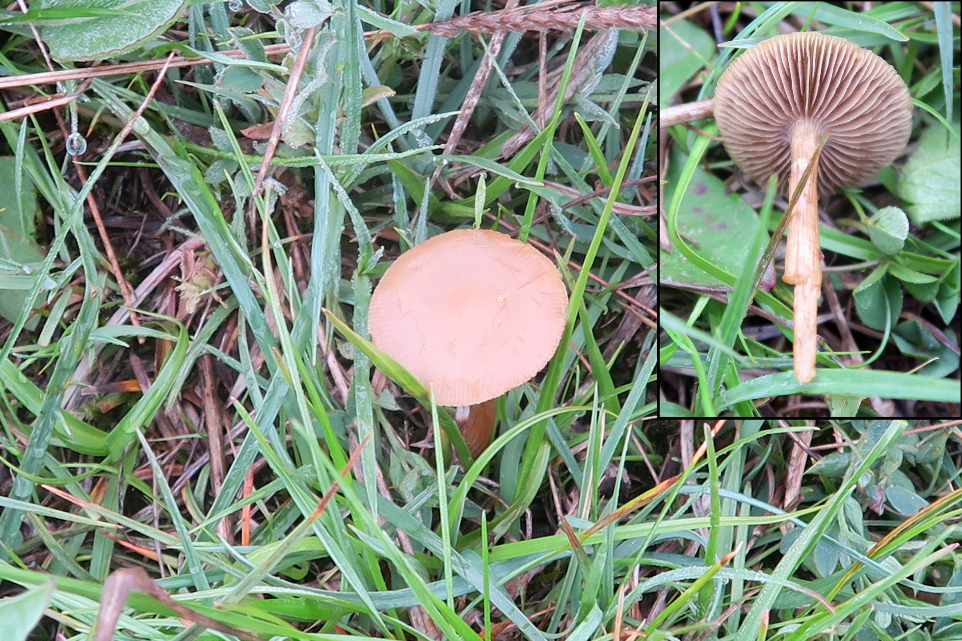Un solo ejemplar brotando entre la hierba, de poco más de 2 cm. el sombrero, de color pardo claro bastante uniforme, de escasa carne y con transparencia radial de las láminas.