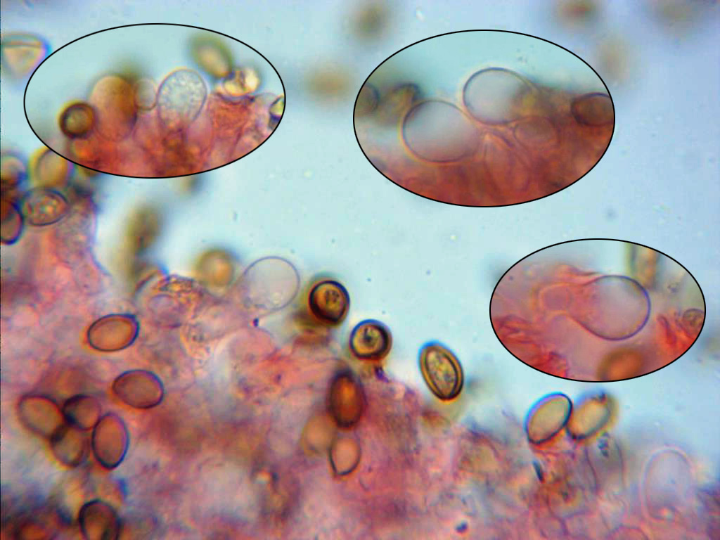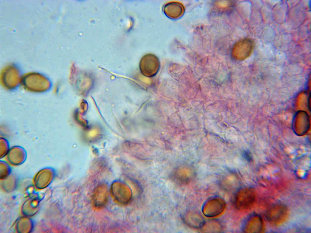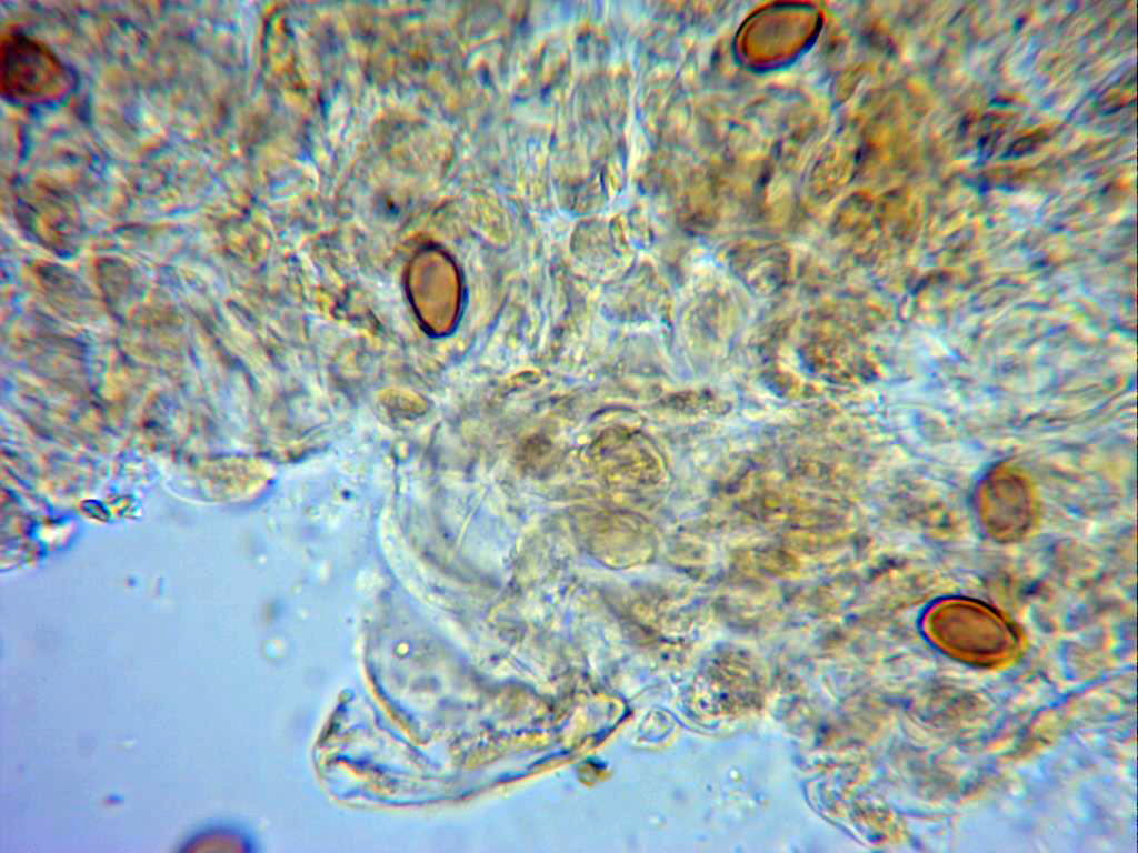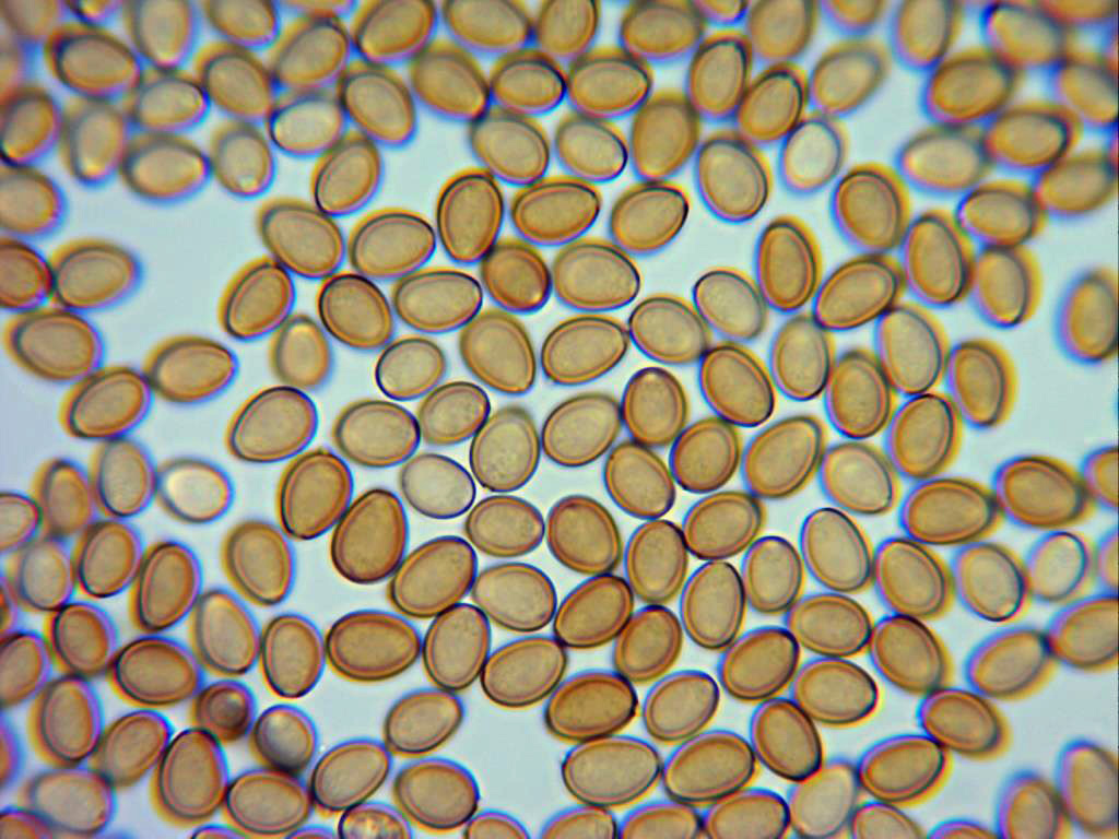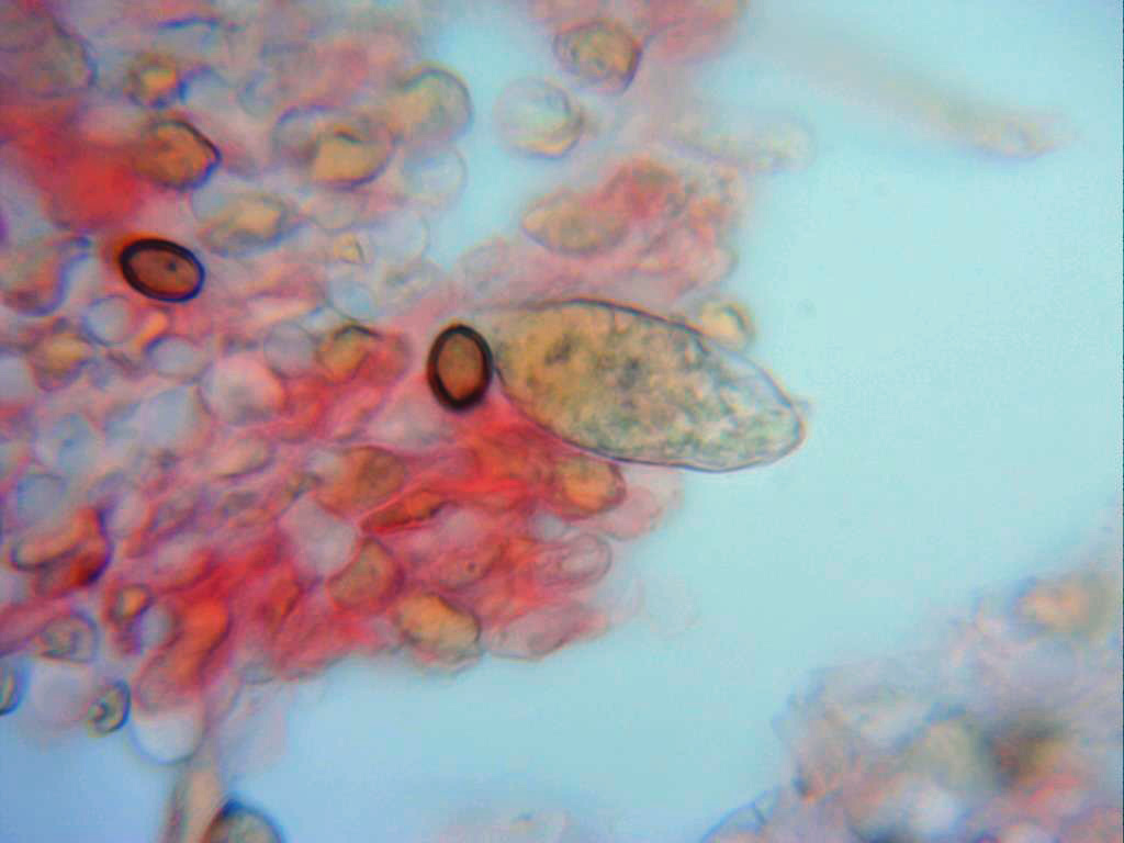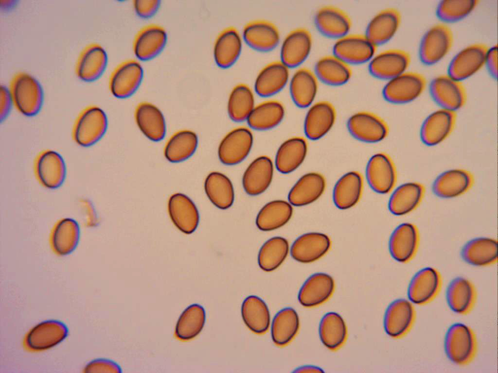 Esporas entre elípticas y ovoideas, de pared gruesa (detalle solo apreciable en Melzer), en solución de rojo congo se observan ligeramente anguladas por el extremo ancho y con poro germinativo.