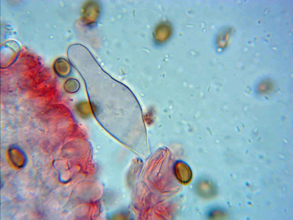 Aunque escasos sí que presentaba pleurocistidios, con morfología muy parecida a los queilocistidios aunque de un tamaño algo menor.