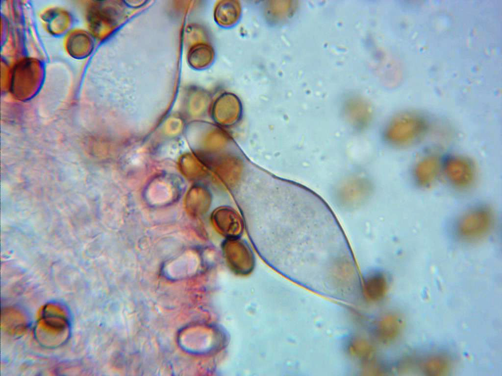 Queilocistidios entre globosos y piriformes, mayoritariamente hialinos, en uno de ellos se puede observar una fíbula en su base.