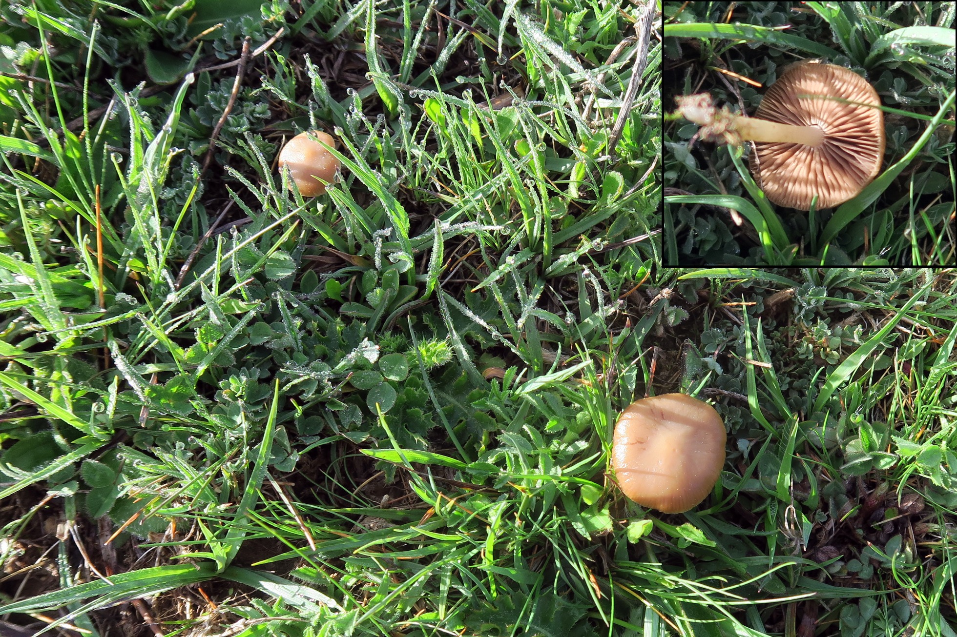 Un par de ejemplares de pequeño tamaño, sombrero de color crema uniforme, con láminas medianamente separadas y transparencia radial. Concoloras con el sombrero y con abundantes lamélulas.