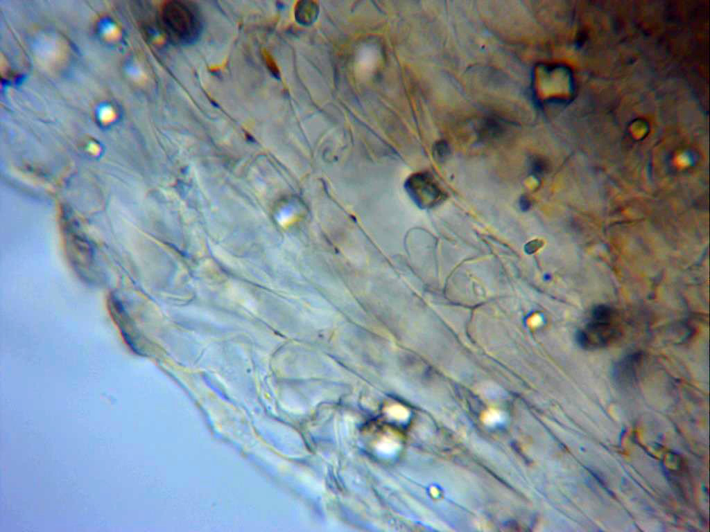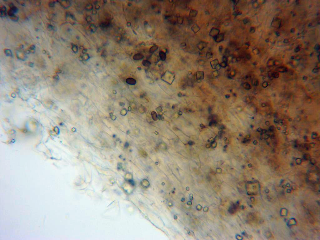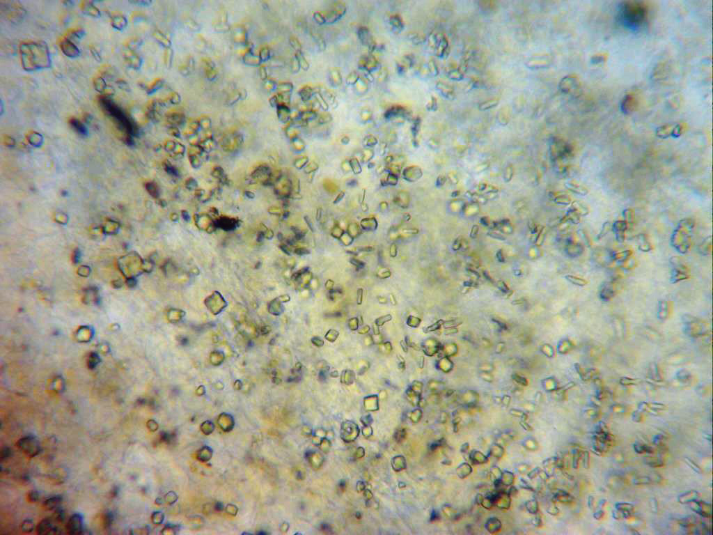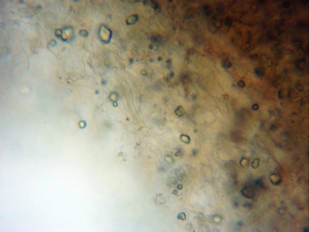 Imagen por debajo de la suprapellis, llama poderosamente la atención la gran cantidad de cristales presentes en la muestra.