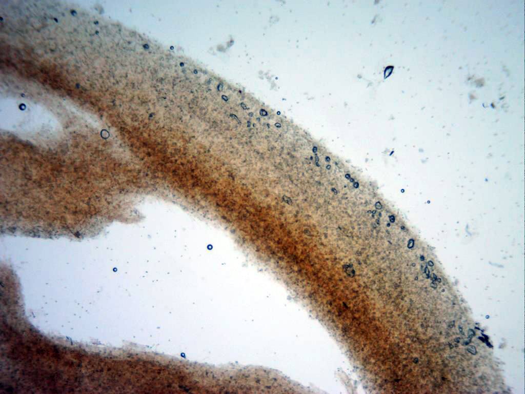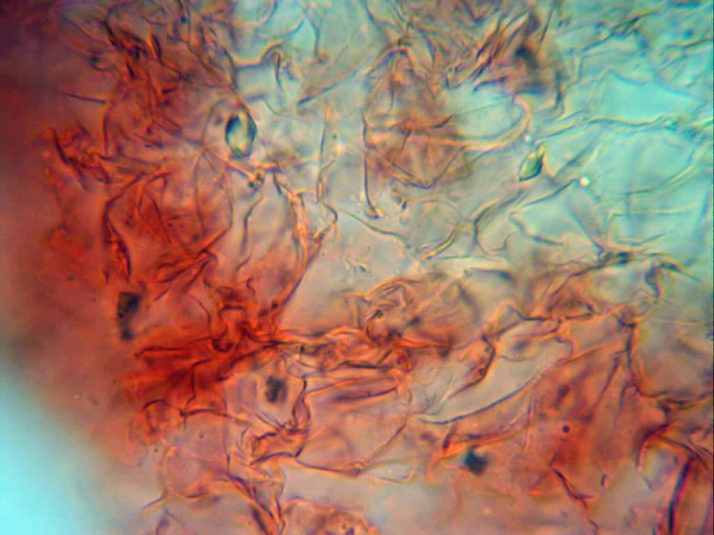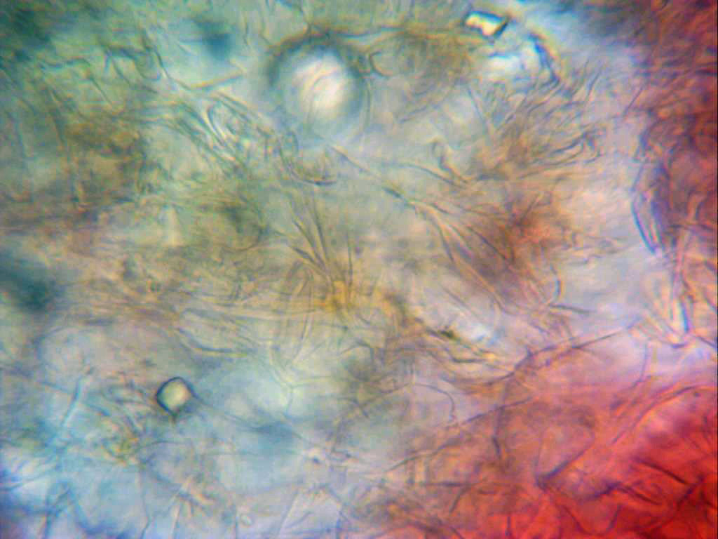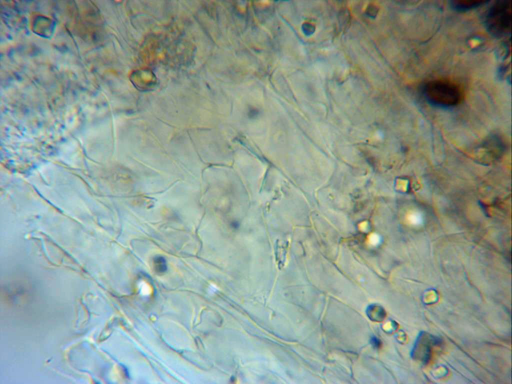Imagen por debajo de la suprapellis, llama poderosamente la atención la gran cantidad de cristales presentes en la muestra.